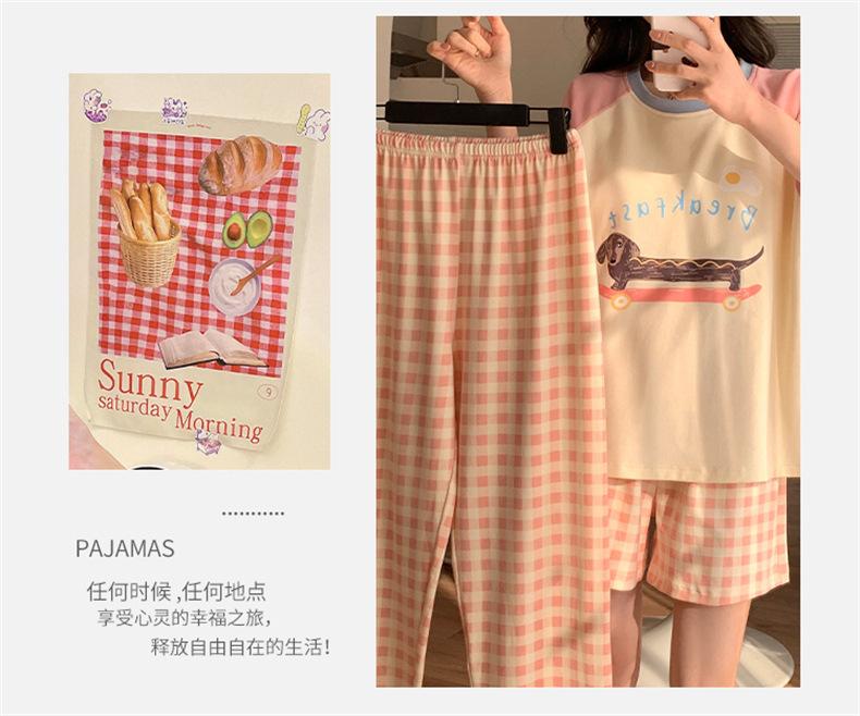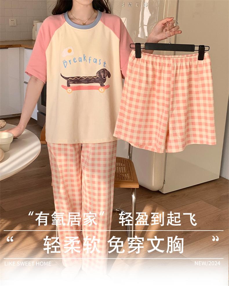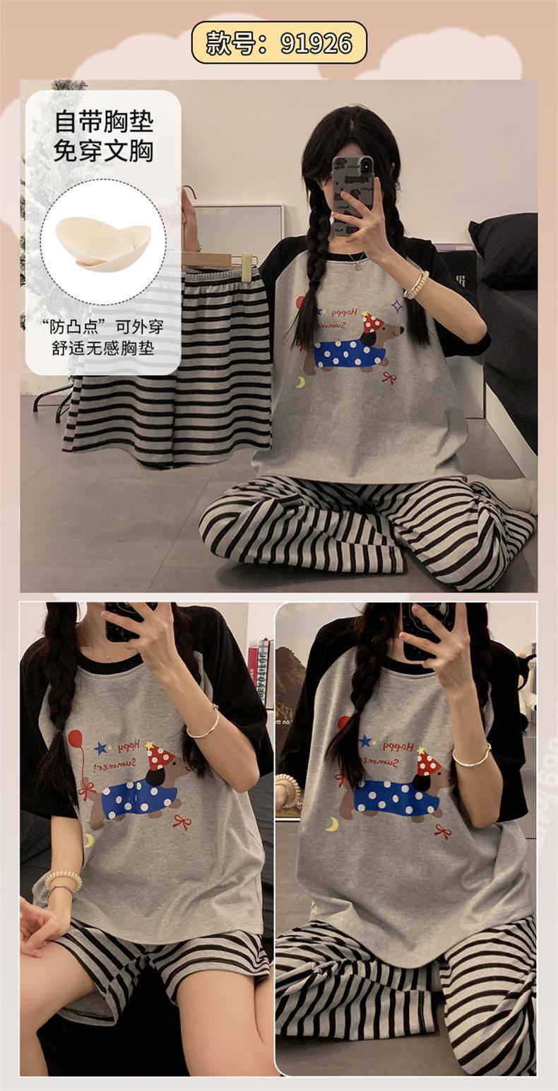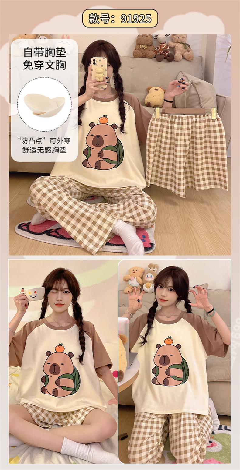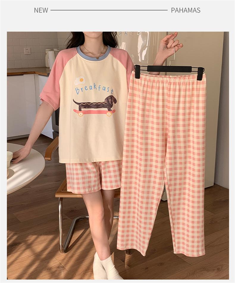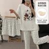 Pijama feminino de três peças, manga curta, calça com bojo, desenho animado, roupa de casa feminina, roupa casual, shorts de verão
