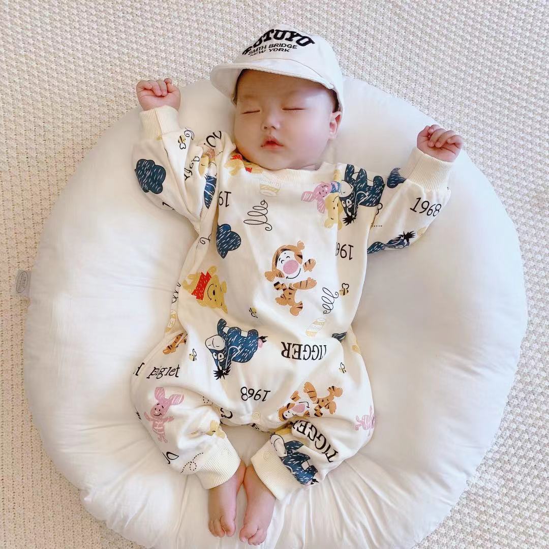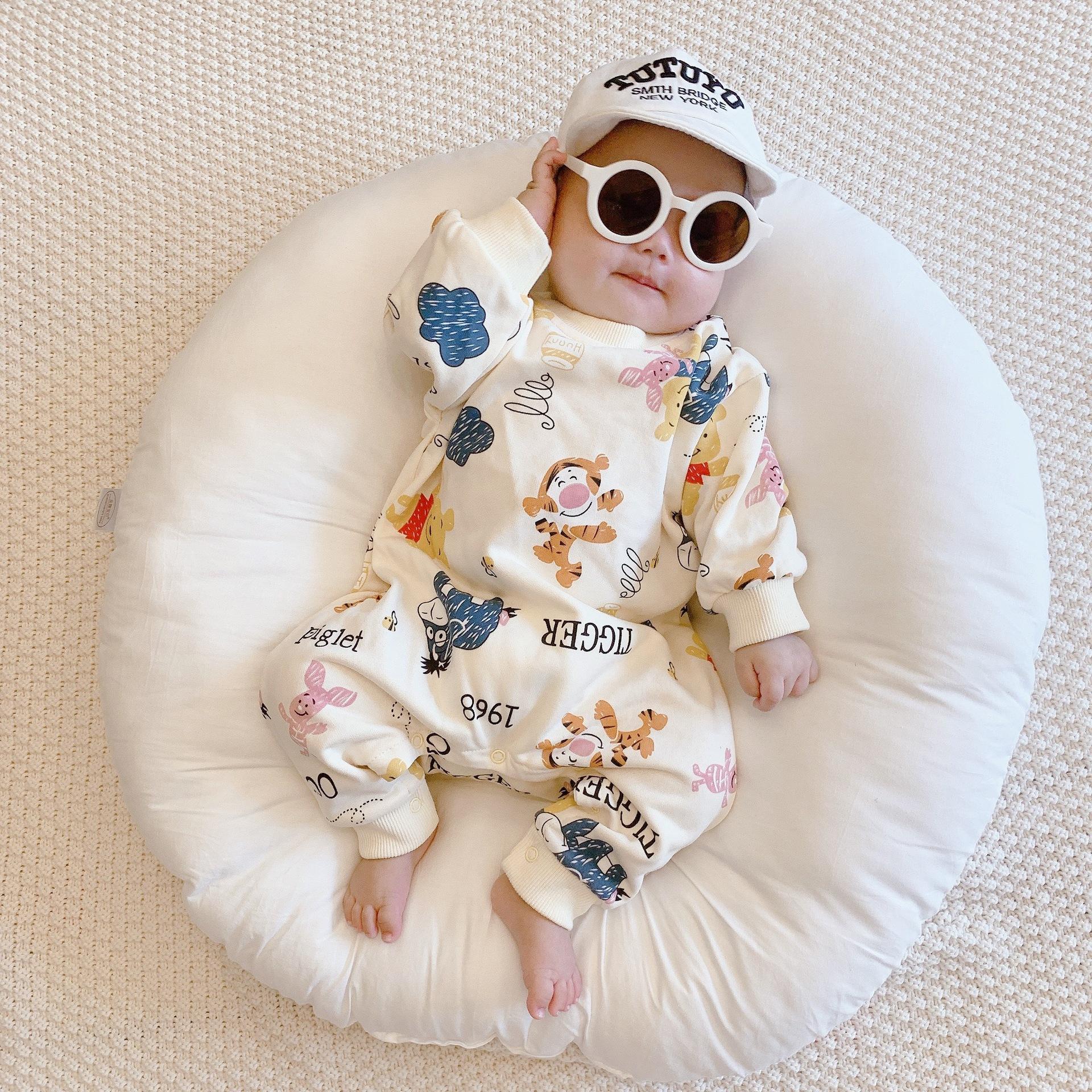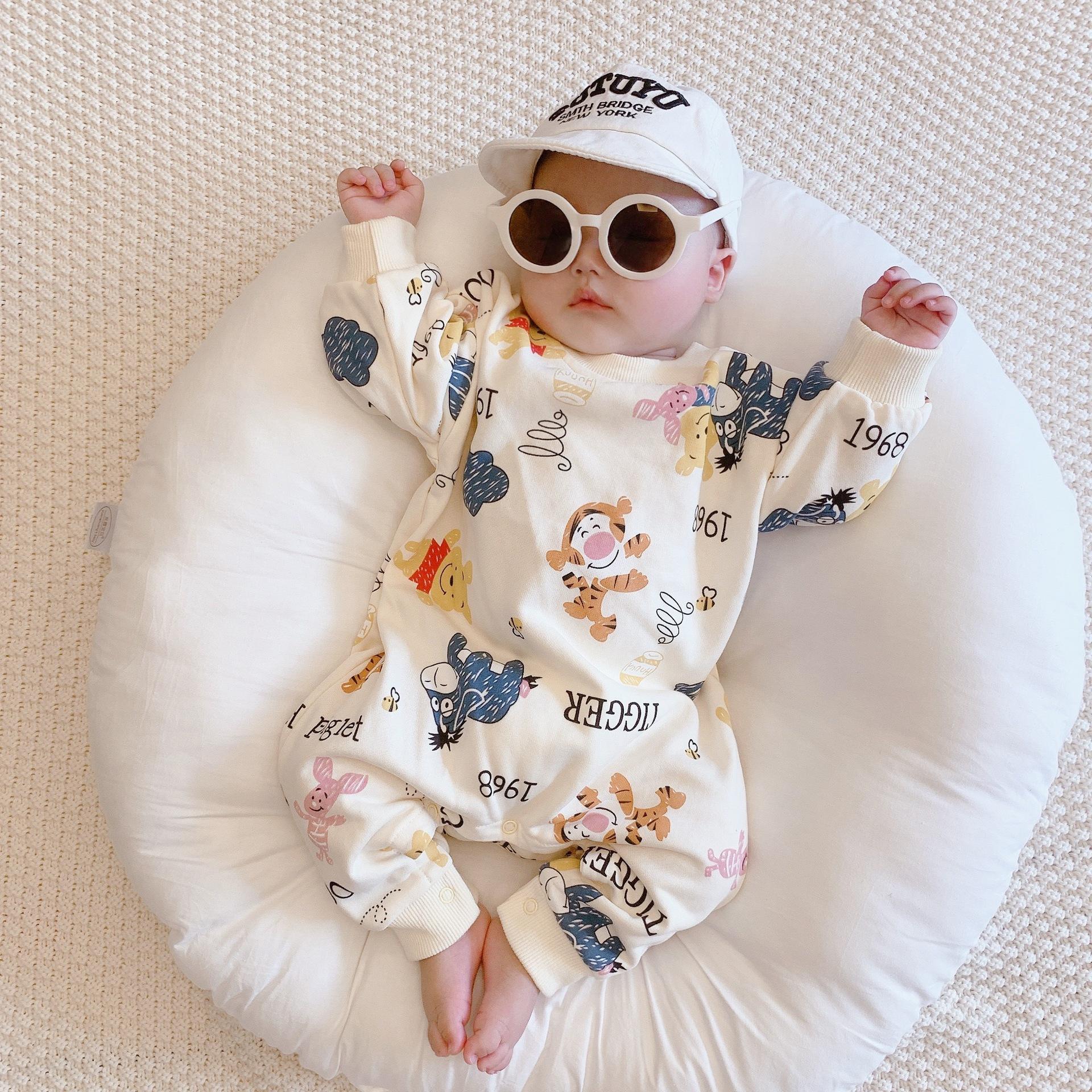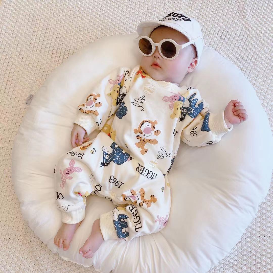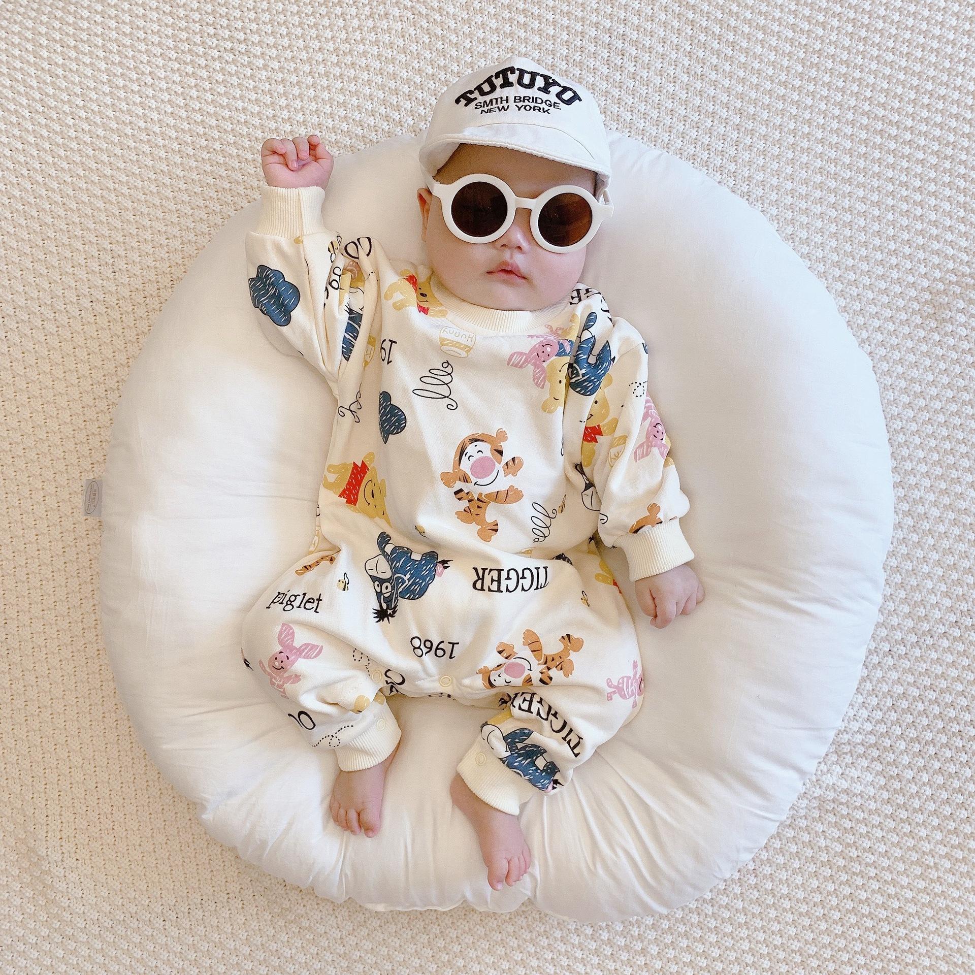 Novo macacão de manga comprida masculino e feminino para bebê, bolsa de bebê, macacão de pum, estampa de desenho animado fofo, estilo coreano, macacão longo, atacado