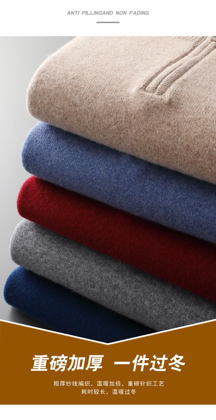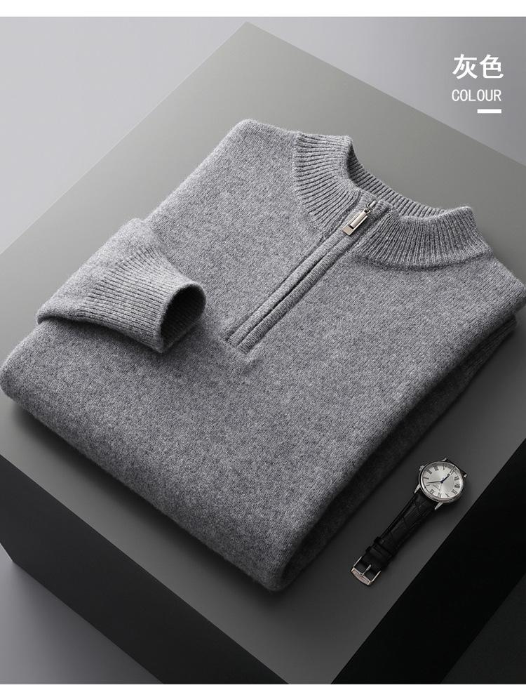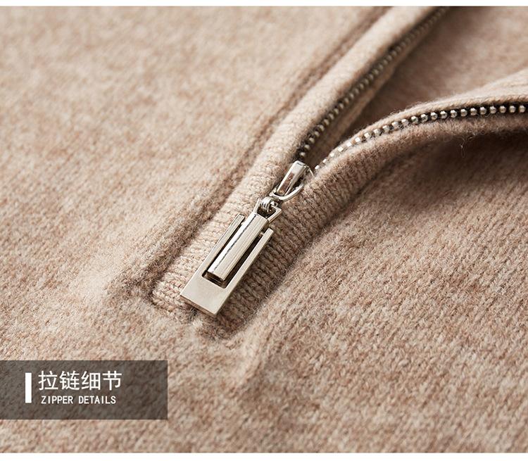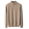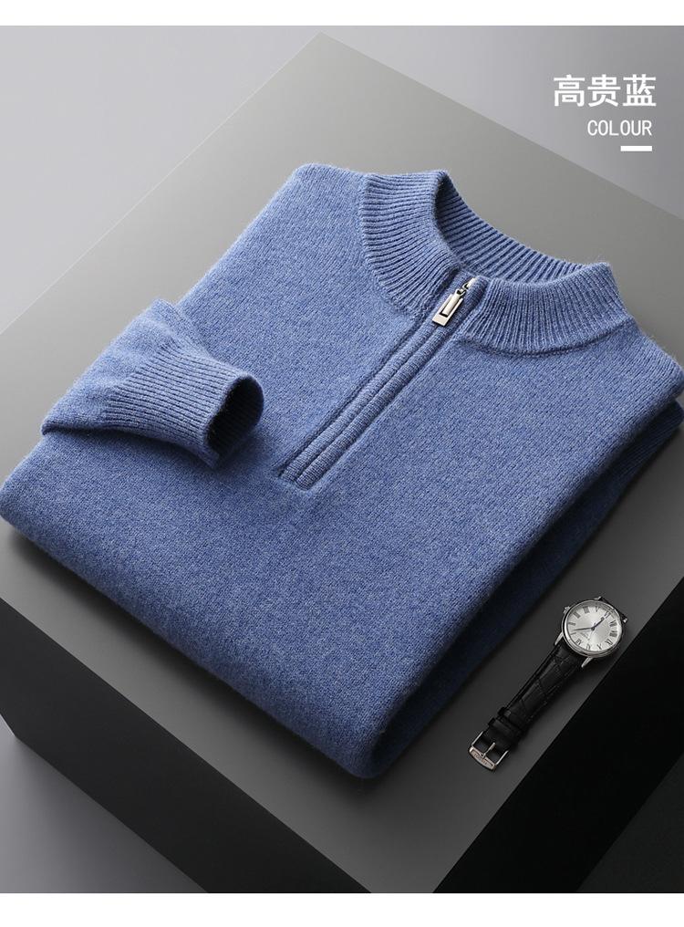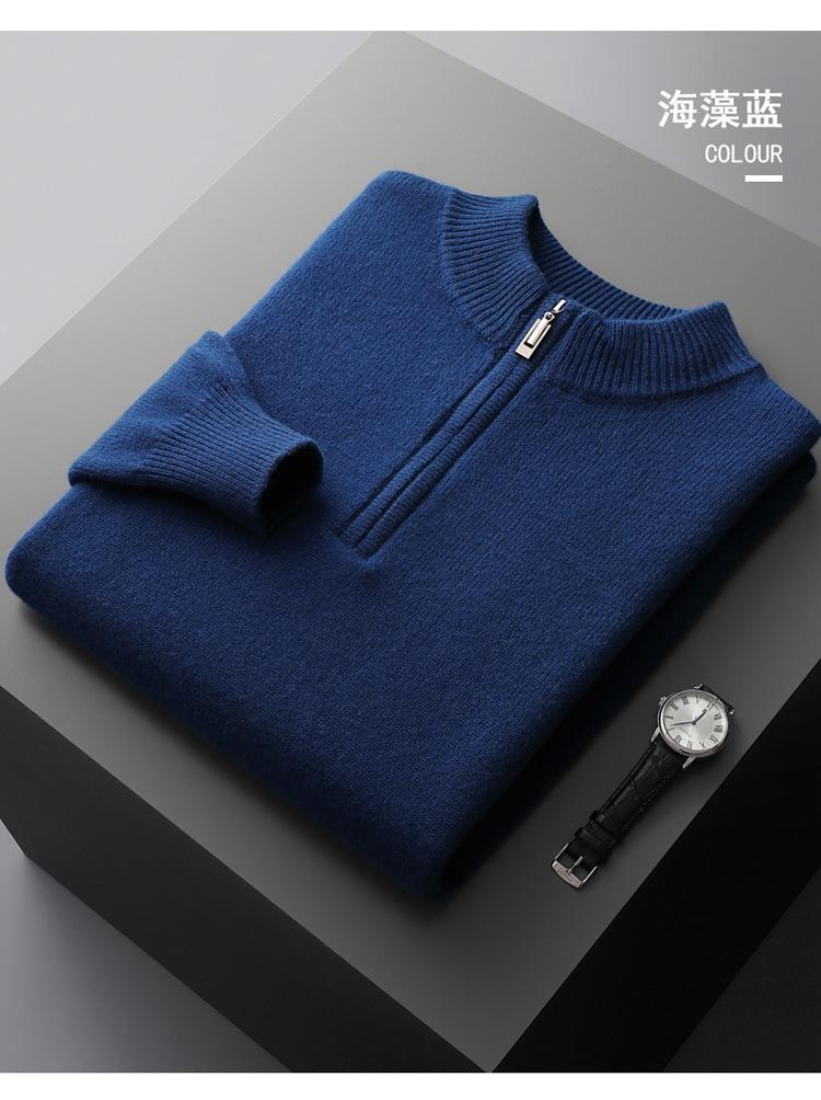 Suéter masculino 100% lã, meia gola alta, zíper, base grossa, outono e inverno, casual, negócios, cor sólida, suéter de caxemira