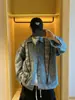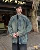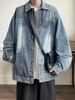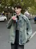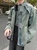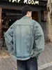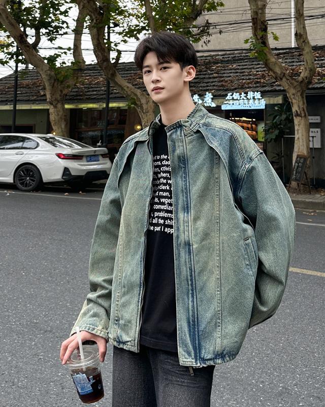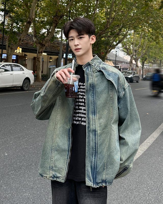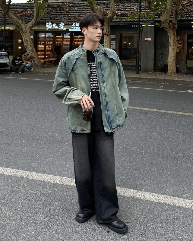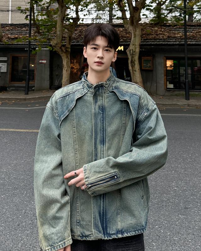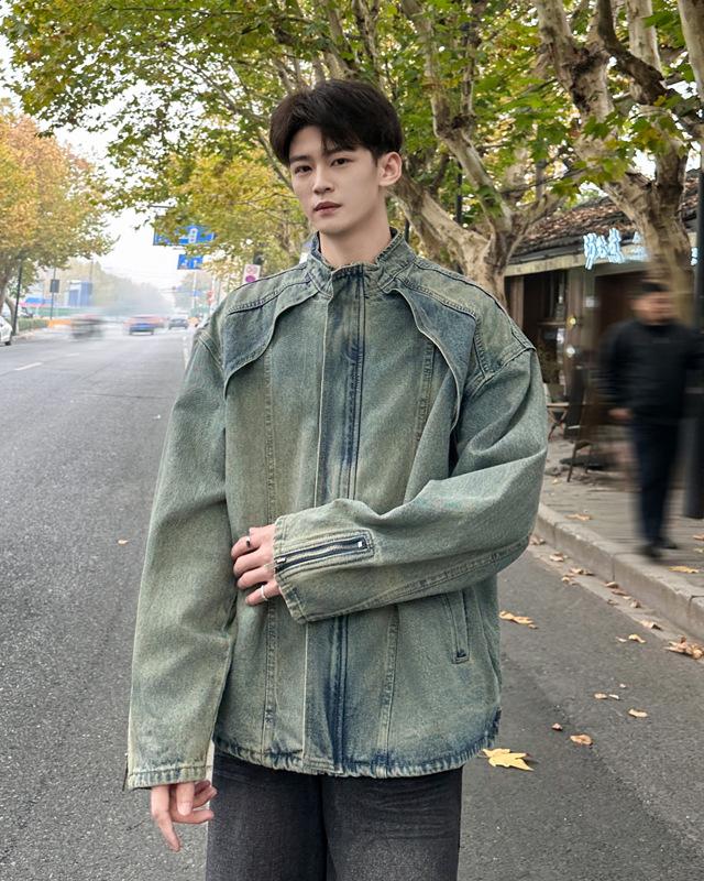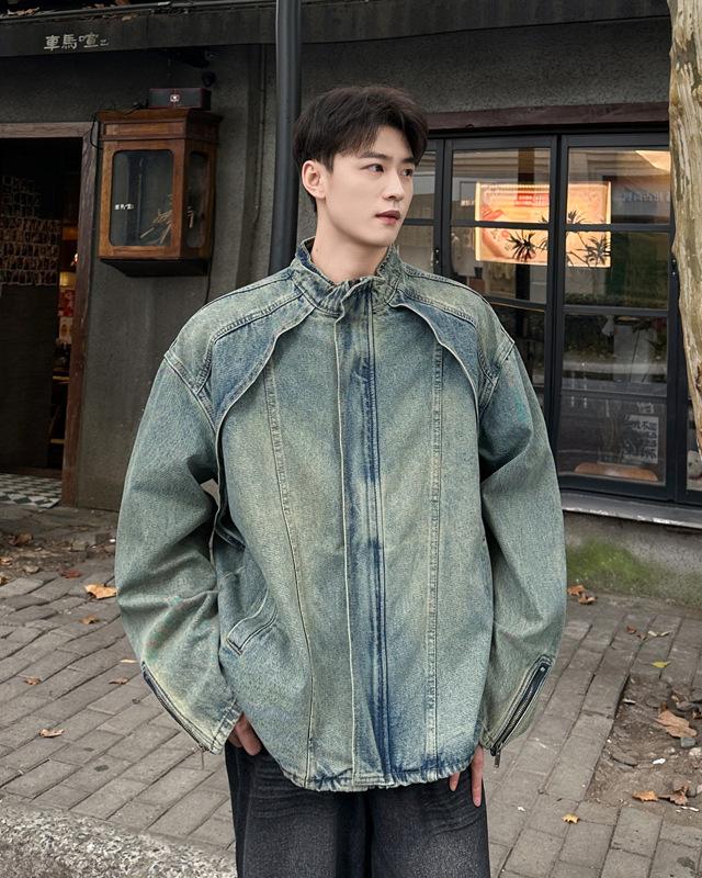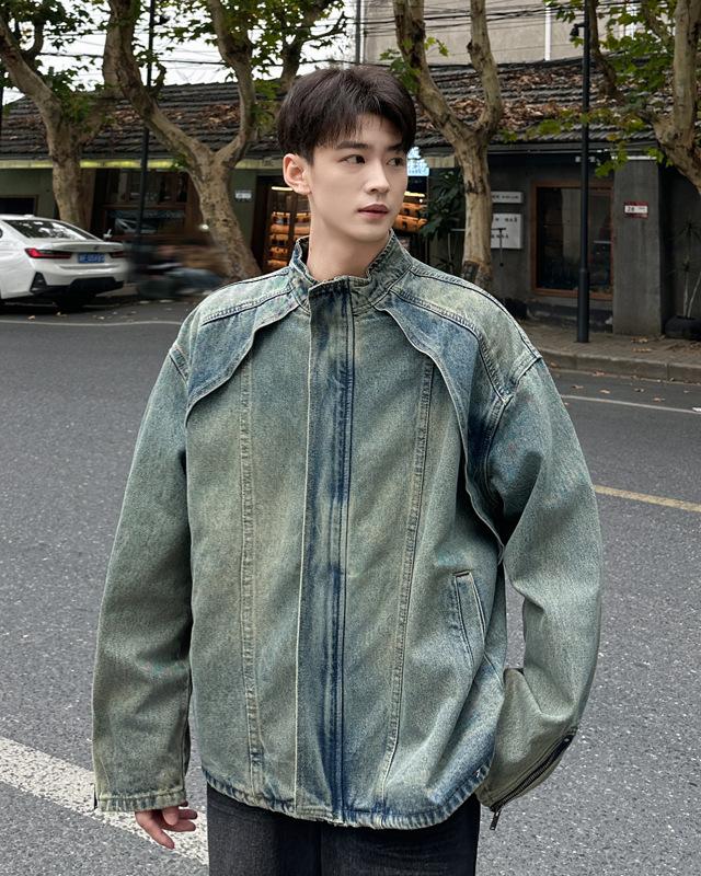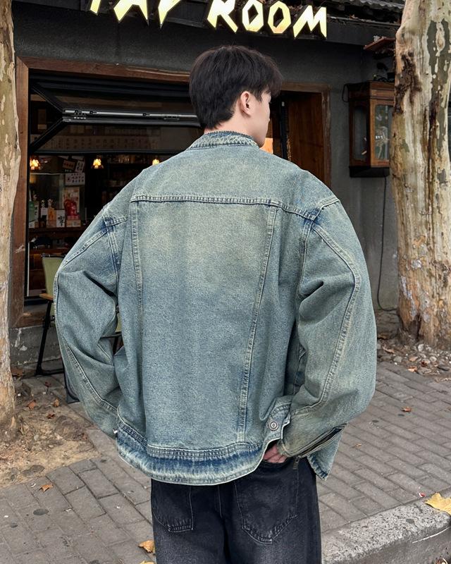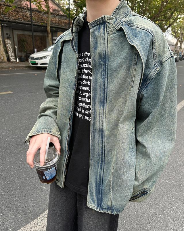 Jaqueta jeans estilo americano vintage lavada de marca antiga com gola vertical para nicho masculino primavera e outono casual solta jaqueta multifuncional
