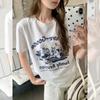 Camiseta estampada casual e confortável, de manga curta, com decote redondo, para primavera e verão 2025, para todos os tipos de ocasiões, de algodão solto, 93579