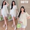 Roupa de Maternidade 2025 Verão Novo Estilo Coreano Floral Doce Camisa Babydoll + Shorts de Suporte para Barriga Conjunto de Maternidade de Duas Peças