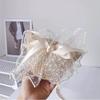 Pearl Bow, Ruffled Lace, Long Ribbon Bow, Beige ruffled lace