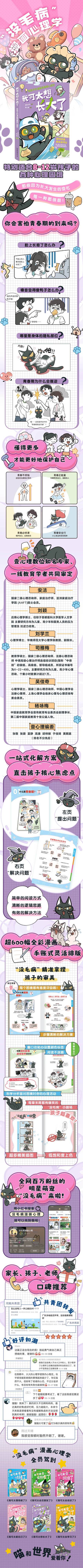 Este livro é uma história em quadrinhos de autoajuda psicológica para crianças, compilada e ilustrada pela Manyou Culture e supervisionada por Yixinli. O livro utiliza a fofa imagem do gato preto "Meimaobing" para contar às crianças, especialmente aquelas nas séries iniciais do ensino fundamental, sobre os dilemas psicológicos relacionados à adolescência. As cenas cômicas retratam quase cem problemas comuns da vida adolescente, e uma equipe profissional de psicólogos oferece soluções com apenas um clique. As imagens são ricas, o layout é flexível e o conteúdo é profissional, sem ser enfadonho. O livro explica em detalhes as mudanças físicas e psicológicas que ocorrem durante a adolescência para os leitores, responde a perguntas relacionadas à adolescência e permite que as crianças aprendam a se proteger melhor, a abraçar a adolescência com alegria e tranquilidade e a abraçar o crescimento.