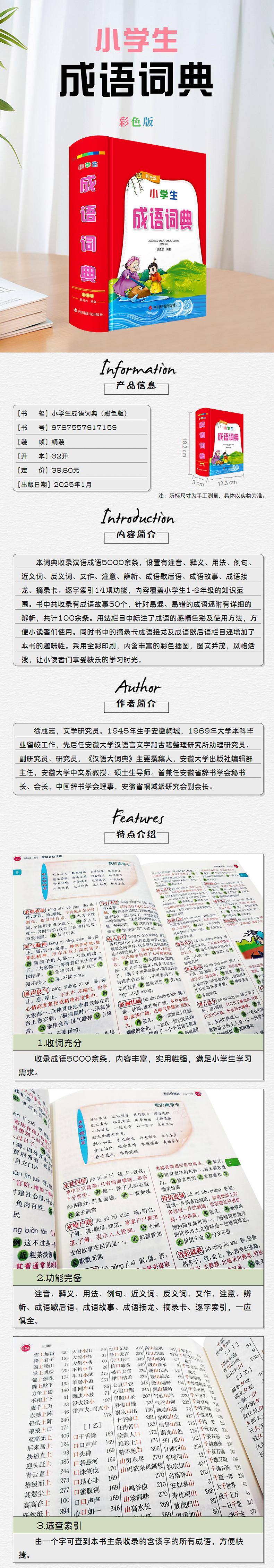 Este dicionário contém mais de 5.000 expressões idiomáticas chinesas, com 14 funções, incluindo notação fonética, interpretação, uso, exemplos, sinônimos, antônimos, também escritos como, atenção, análise, expressões idiomáticas e ditados alegóricos de duas partes, histórias idiomáticas, cadeia idiomática, cartões de trechos e índice palavra por palavra. O conteúdo abrange a gama de conhecimento de alunos do ensino fundamental da 1ª à 6ª série. Há 50 histórias idiomáticas no livro, e uma análise detalhada também é anexada para expressões idiomáticas que são fáceis de confundir e fáceis de cometer erros, totalizando mais de 100. A cor emocional e o uso das expressões idiomáticas são marcados na coluna de uso, o que é conveniente para os jovens leitores usarem. Ao mesmo tempo, a cadeia idiomática do cartão de trechos e as colunas de ditados alegóricos de duas partes do idioma no livro também aumentam a diversão do livro. Este dicionário é impresso em cores, contém ilustrações ricas em cores e é ilustrado com um estilo animado, permitindo que os jovens leitores desfrutem de um momento de aprendizado feliz.