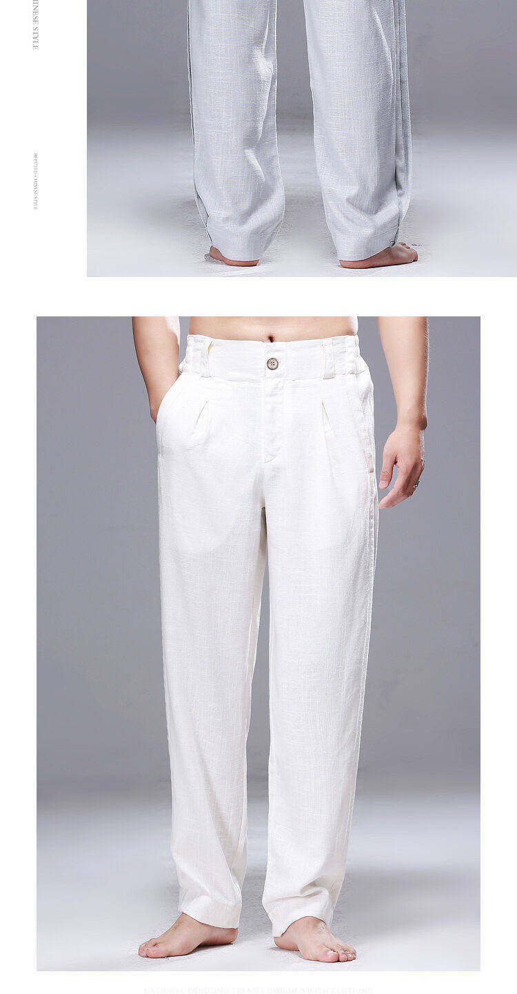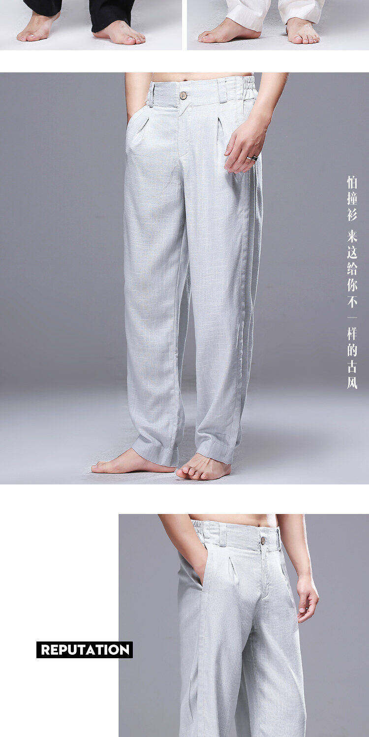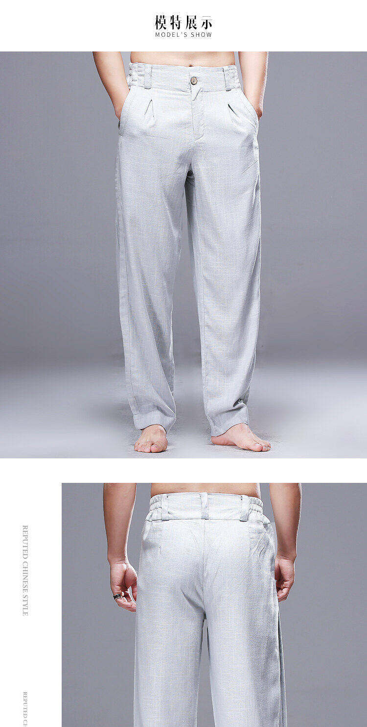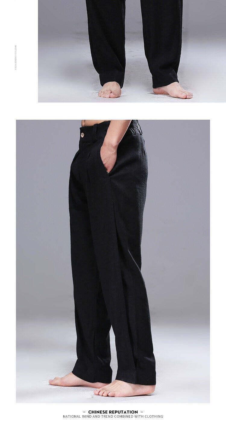 2025 Verão Novo Estilo Chinês Calças Casuais Masculinas Soltas Plus Size Pernas Largas Calças Compridas Modernas Algodão e Linho Calças Hallen Masculinas