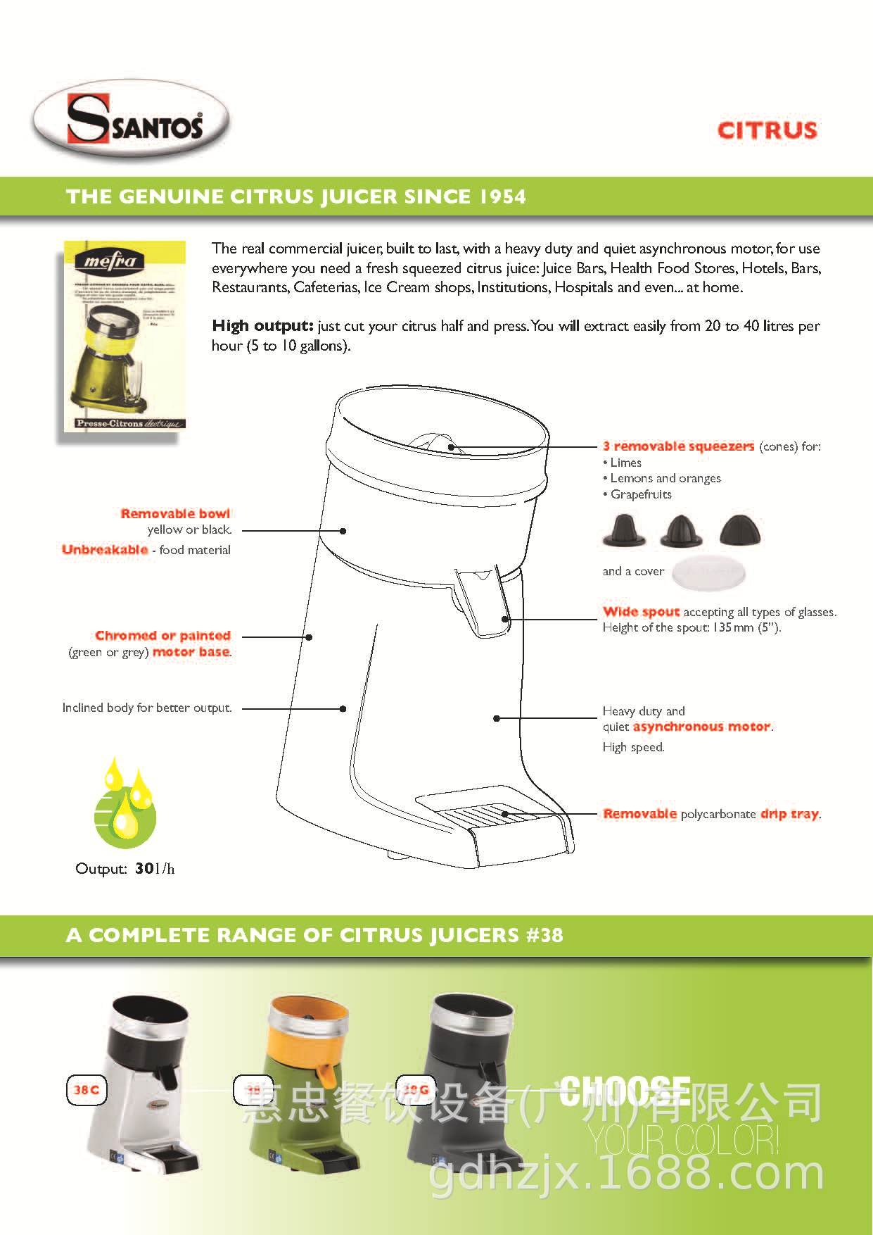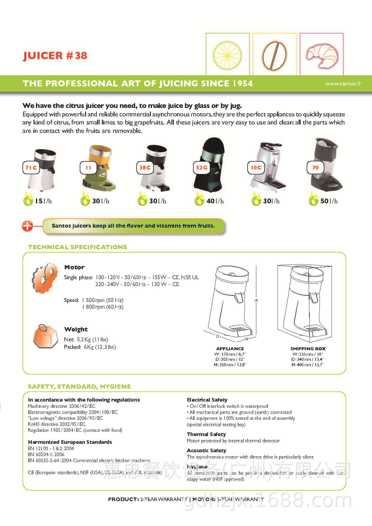 Motor assíncrono Monofásico220-240 V - 50/60 Hz - 130 W100-120 V - 50/60 Hz - 155 W1500 RPM (50 Hz) - 1800 RPM (60 Hz)ConstruçãoBase em liga de alumínio sanitário.Tigela inquebrável em policarbonato sanitárioPeso- Peso líquido: 5 Kg (11 lbs)- Peso para envio: 6 Kg (13 lbs)Dimensões / embalado (caixa):- Altura 350 mm (14') / 400 mm (15.7')- Largura 200 mm (8') / 255 mm (10')- Profundidade 300 mm (12') / 340 mm (13.4')- Cubagem para envio 0,035m3- 1,2 pés cúbicosFácil de limpar- Todo o conjunto da tigela, incluindo tigela, polpas, grelha de filtro e espremedor (cone), é facilmente removido da base em um movimento simples.- Base de uma peça (bloco do motor) lisa e polida- Bandeja coletora de gotejamento de plástico removível2 Espremedores removíveis (Cone extrator)- 1 espremedor para limões e laranjas,- 1 espremedor para toranjas.Particularmente adaptado para produção contínua- Basta cortar as frutas cítricas em 2 partes e espremer.- Extração máxima de suco devido à alta velocidade do motor.- Corpo inclinado para uma melhor saída.- Todos os tipos de copos Altura do bico 135 mm (5')Bloco do motor à prova d'águaAlta estabilidade3 Versões DisponíveisBase pintada de cinza, tigela branca N°38 (Cinza)Base pintada de amarelo, tigela amarela N°38 (Amarelo)Base cromada, tigela preta N°38 COpcionalmente tigela amarela, branca ou preta para cada tipo de baseNormas:- Versões 38 & 38C (220-240V - 50/60Hz): CE, GS, RoHS.- Versões 38V1 & 38CV1 (100-120V - 50/60Hz): CE, UL, NSF, RoHS.