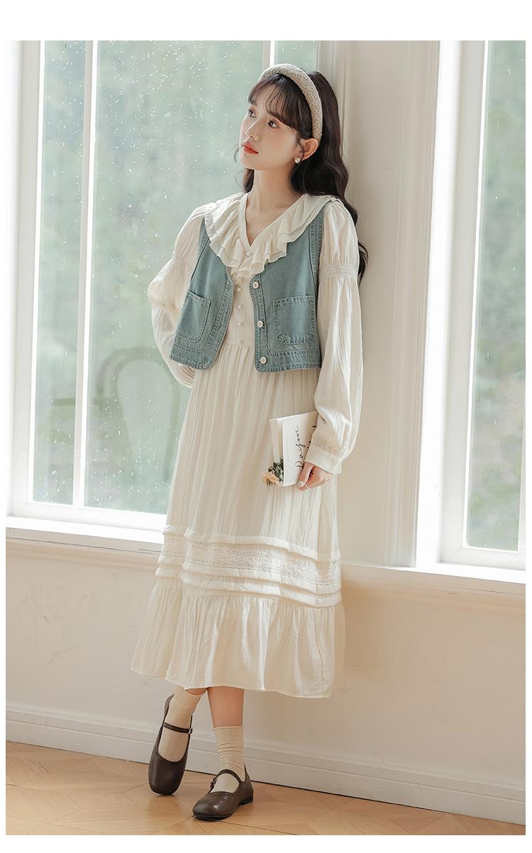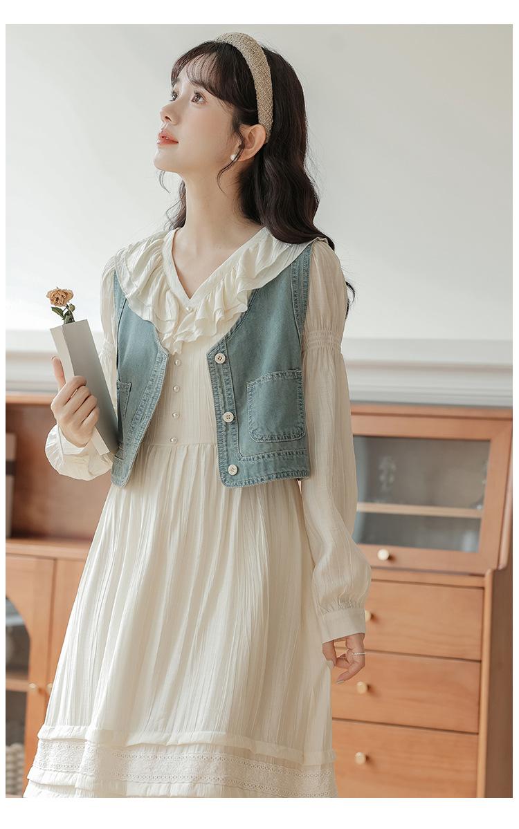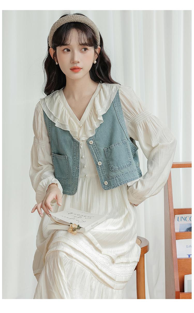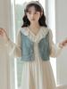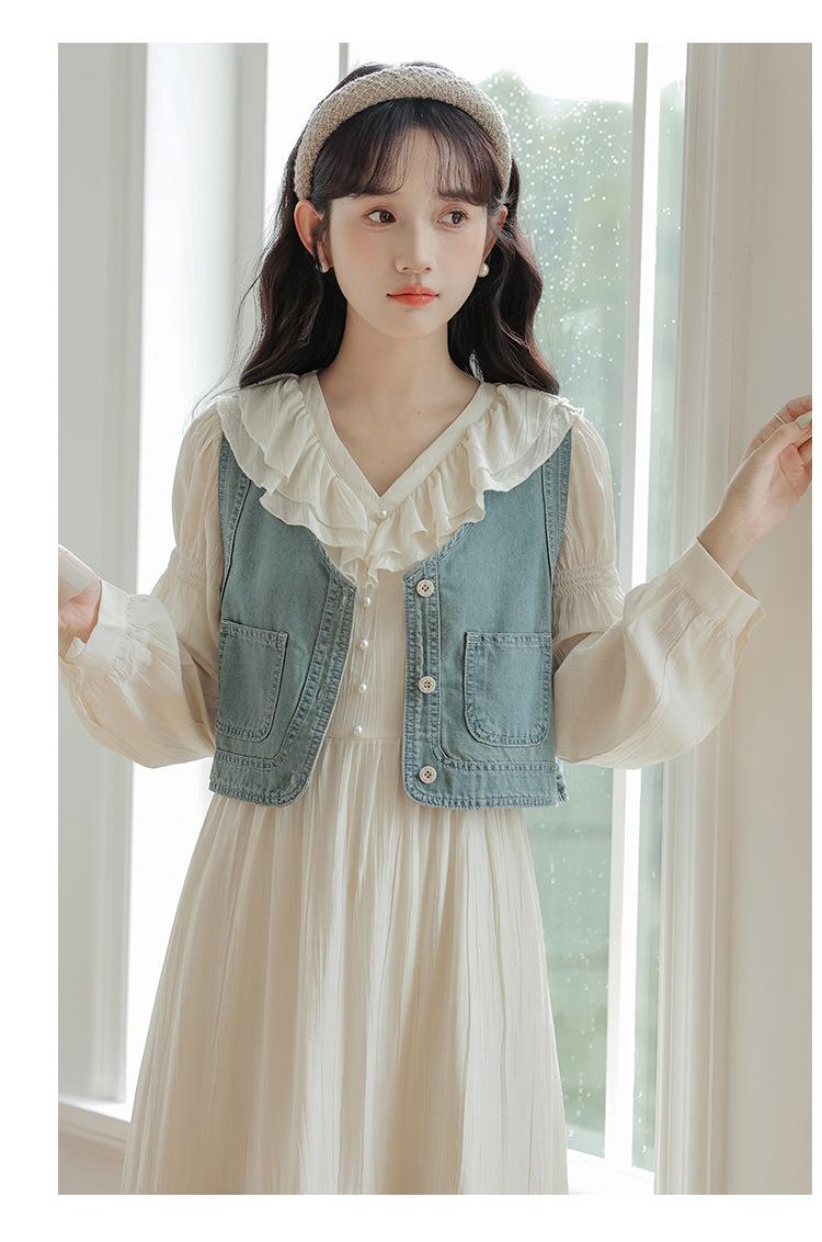 Blue vest, Apricot dress