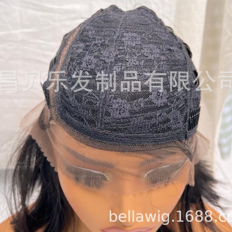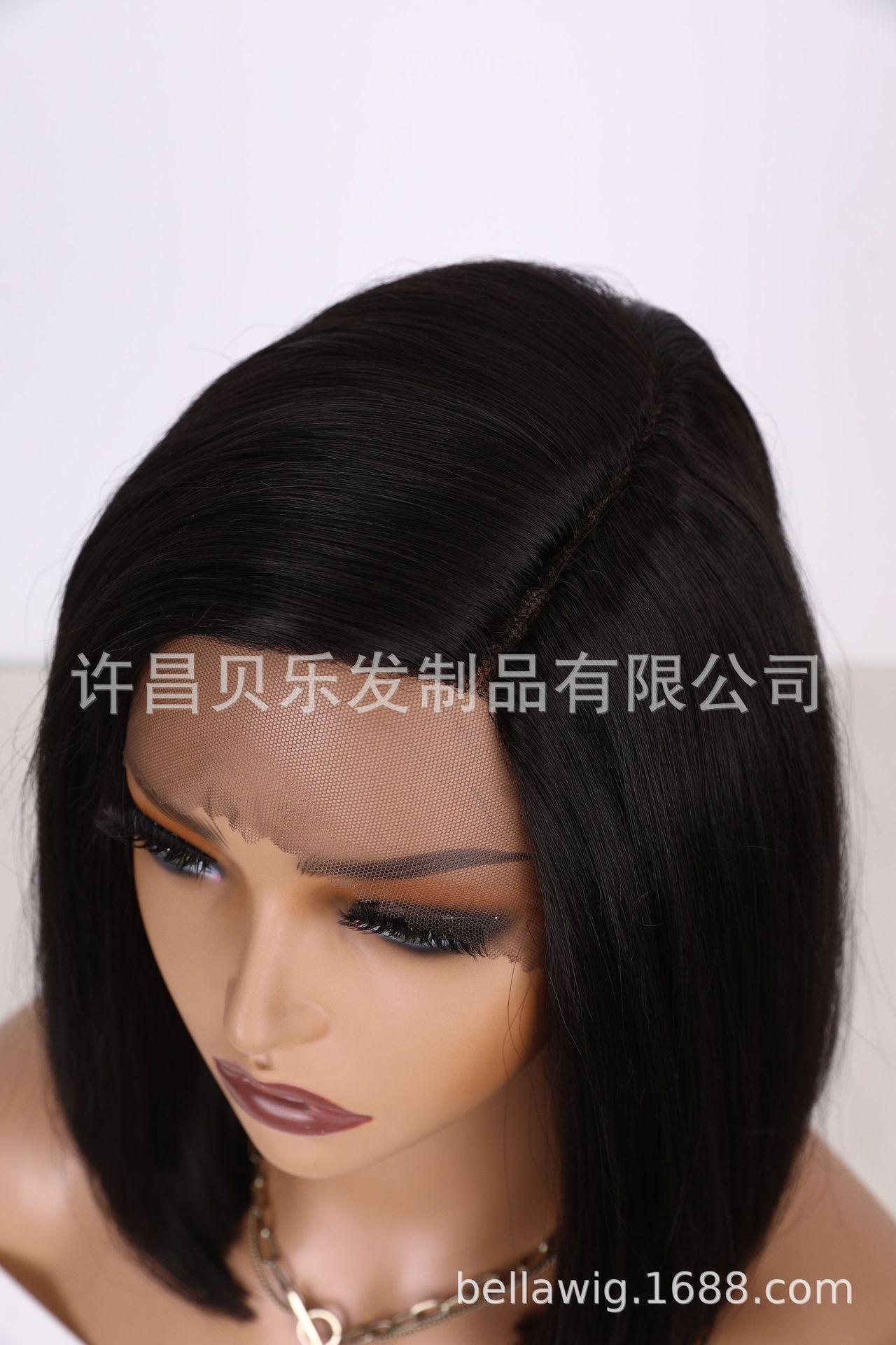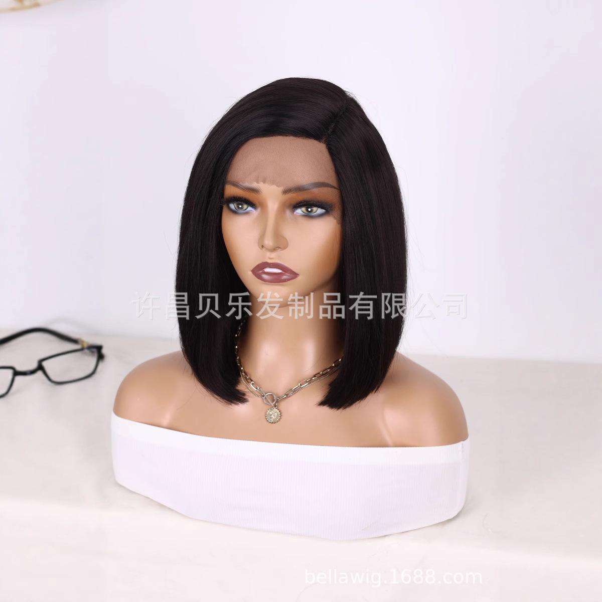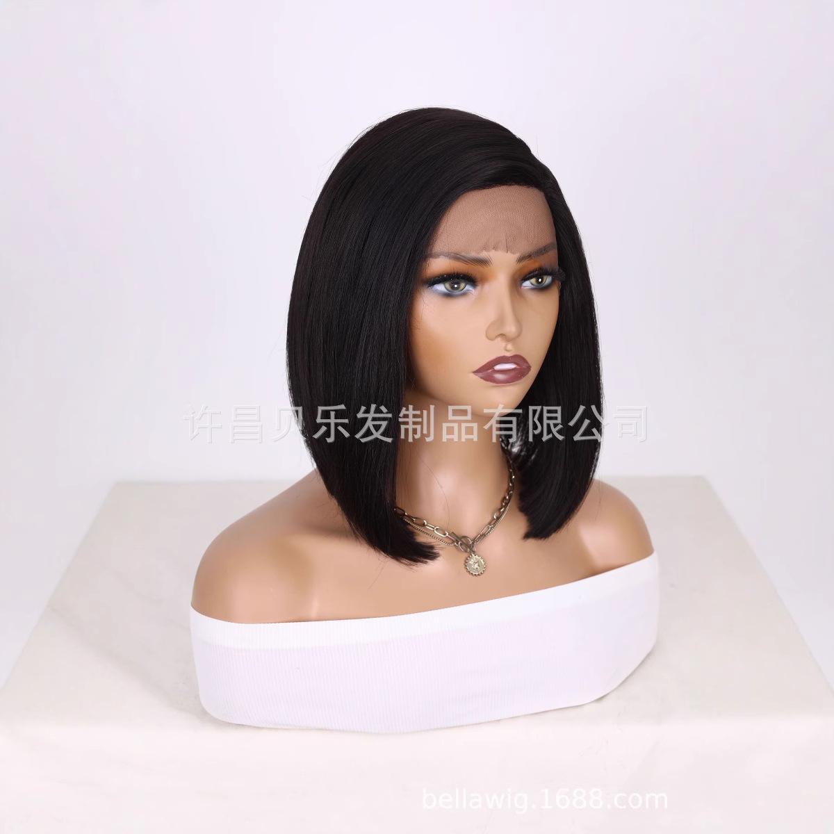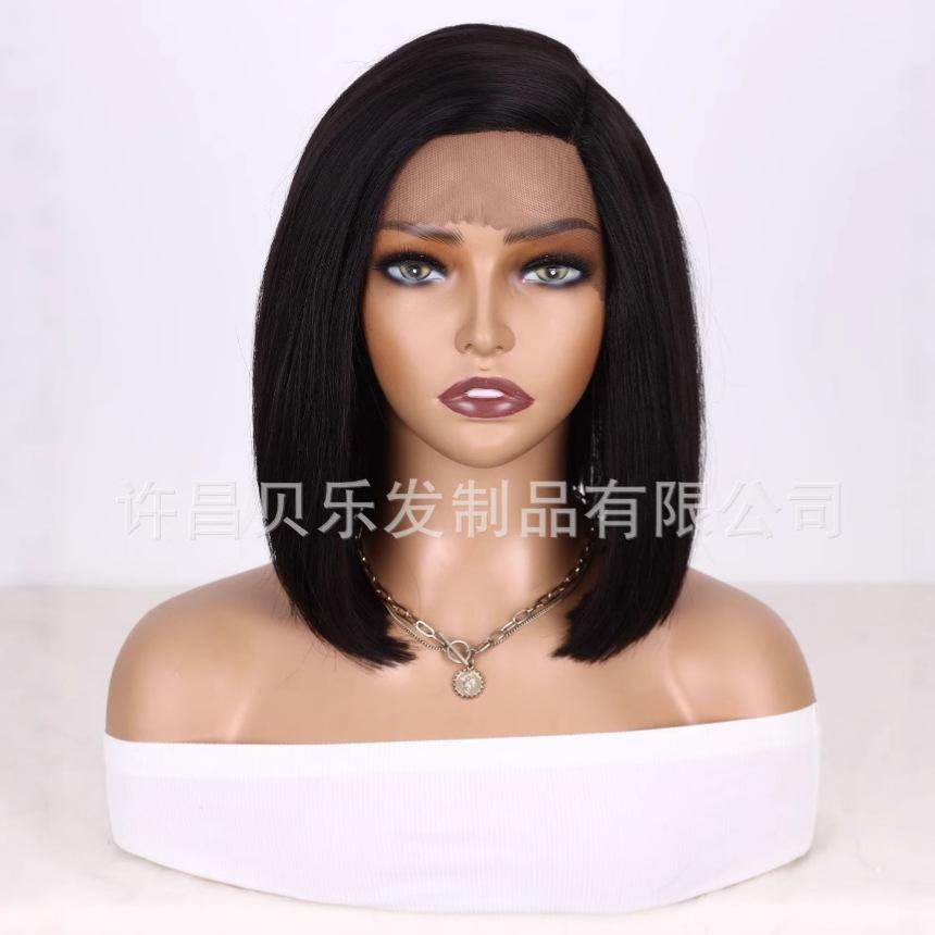 Peruca Transfronteiriça para Mulheres Moda Europeia e Americana Renda Frontal Repartição Lateral Bob Cabelo Curto Liso 12 polegadas Peruca de Fibra Sintética de Alta Temperatura