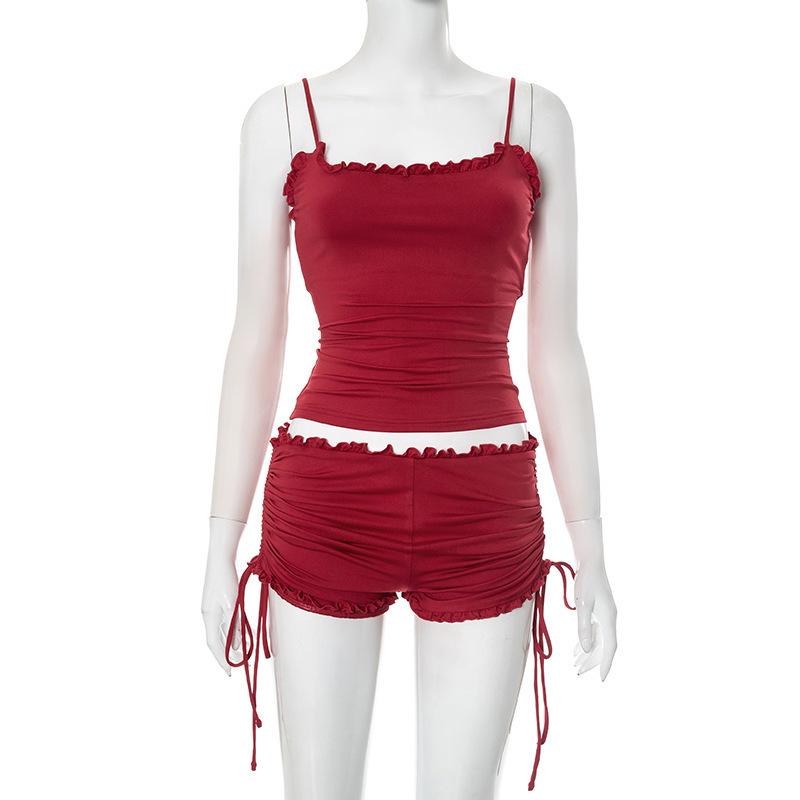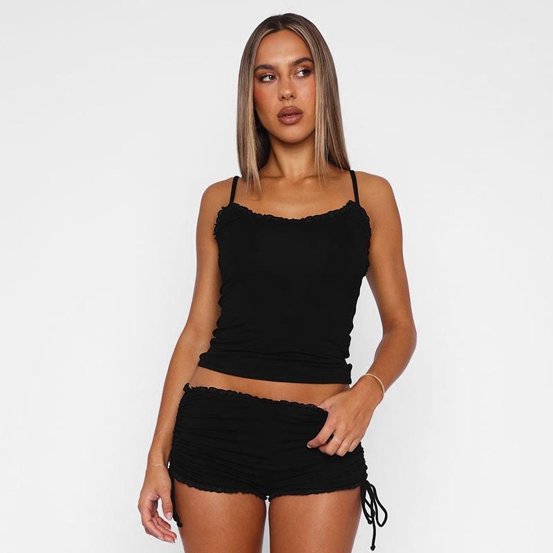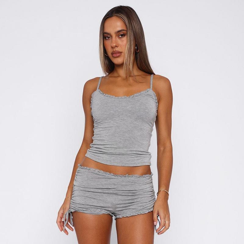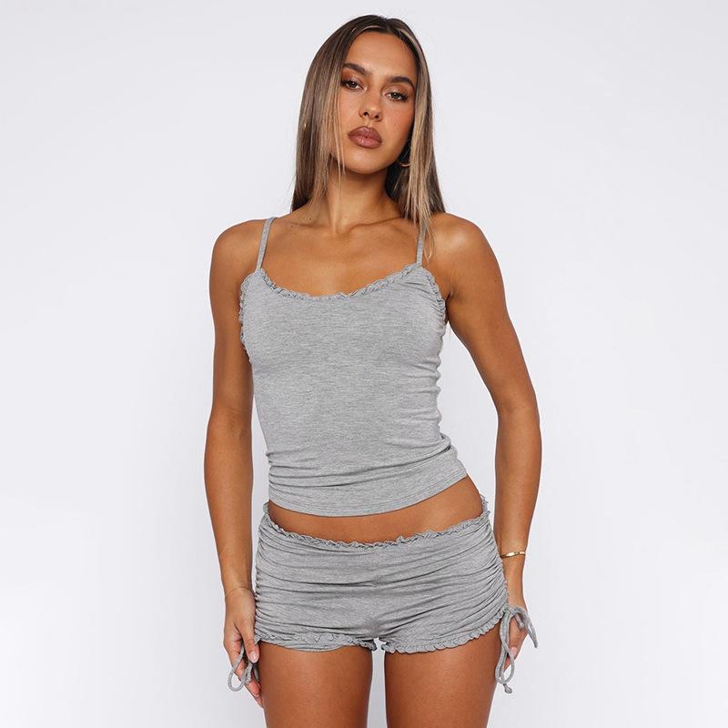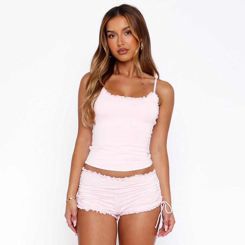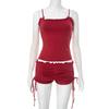 Europa e Estados Unidos verão transfronteiriço cor sólida novo sem mangas renda alça regata casual cordão plissado shorts terno atacado
