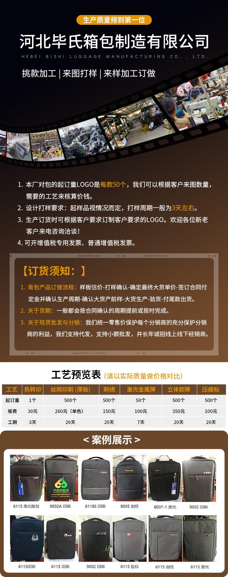 Hebei Bishi Fabricação de Bagagens Co., Ltd. é uma empresa especializada na produção e processamento de mochilas executivas, bolsas para computador, bolsas fitness, pochetes, pochetes de cintura e outros produtos. Está localizada em Baigou, a capital da bagagem, com localização geográfica superior e transporte conveniente. A empresa produz e personaliza principalmente vários tipos de bagagem. Nossa empresa oferece serviços personalizados para diversos produtos de costura. Bem-vindos a fornecer amostras para consulta. ). E a personalização OEM é o foco principal. A empresa sempre aderiu ao espírito de "inovação pragmática" e ao conceito de "gestão honesta", utilizando serviços humanizados para criar produtos finos para elites de todas as esferas da vida. Atualmente, processou e produziu vários tipos de bagagem para muitas empresas e unidades. A empresa também tem conseguido se desenvolver de forma constante e agora se tornou uma empresa profissional de bagagem integrando produção, gestão, varejo e serviço. Nossa empresa pode projetar e produzir de acordo com suas amostras e desenhos, com preços justos e entrega pontual. Amigos de todas as partes são sinceramente bem-vindos para vir discutir negócios. Fabricante personalizado! A prova pode ser feita de acordo com os desenhos de amostra e descrições fornecidos pelos clientes