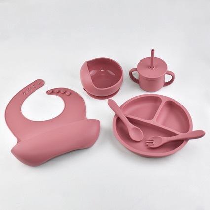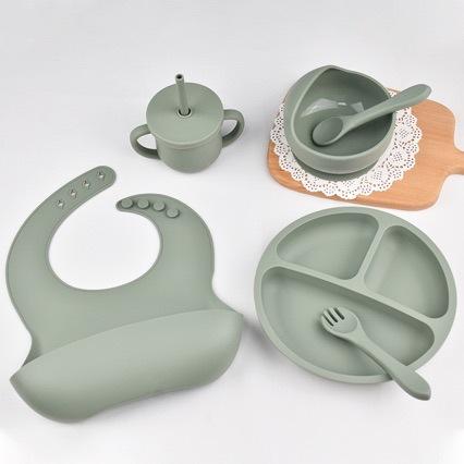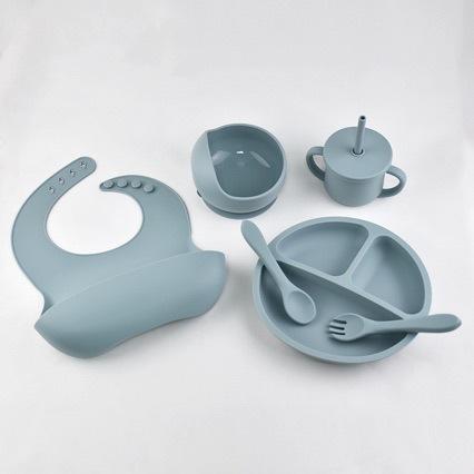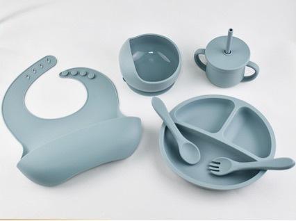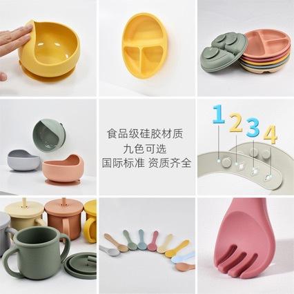 Prato de Jantar de Silicone de Grau Alimentício para Crianças, Bolso para Saliva Fácil de Limpar, Talheres de Silicone, Colher e Garfo, Conjunto de Copo para Lanche Anti-Queda