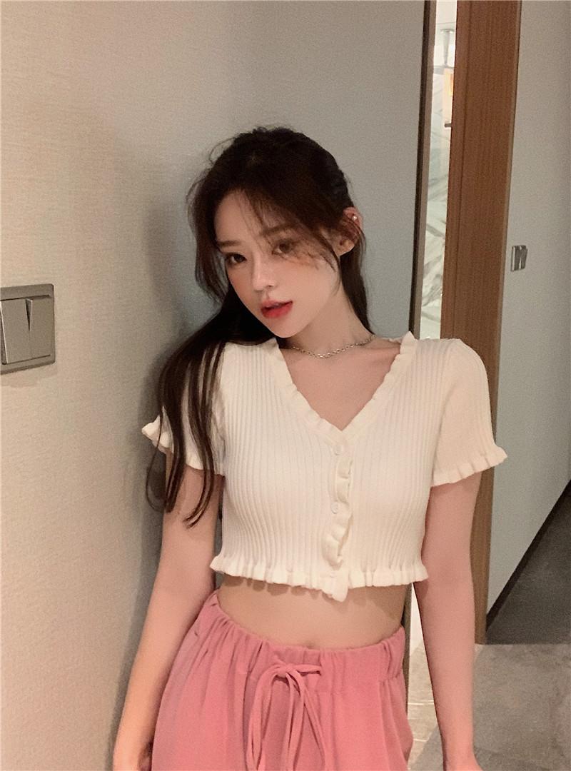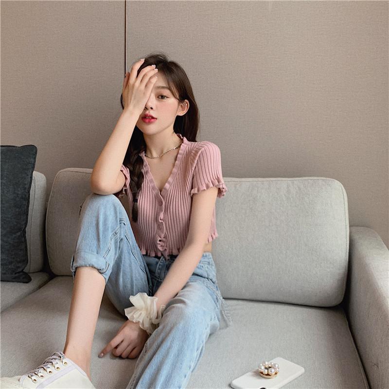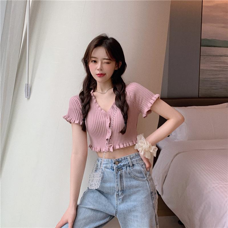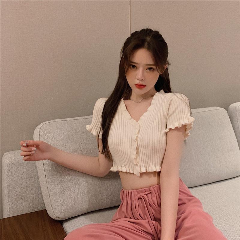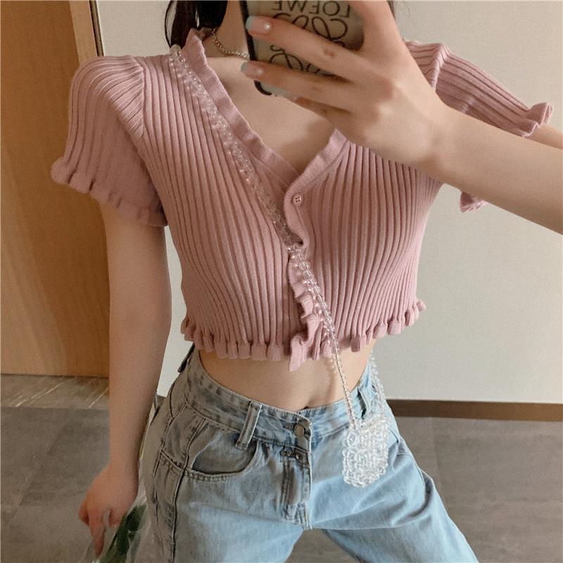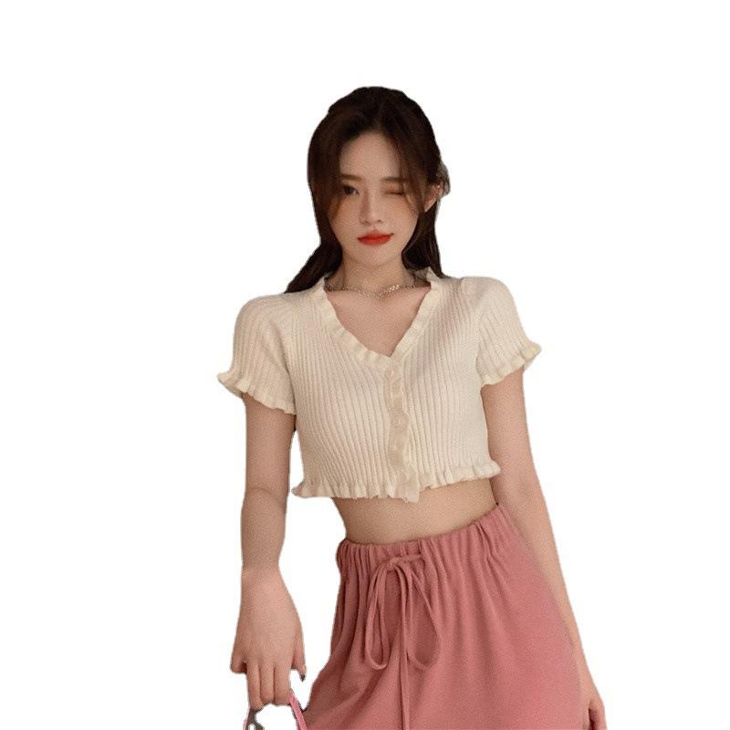 Compre Tricô de Manga Curta para Mulheres Verão Casaco Fino Curto Cintura Alta Top Cropped Transfronteiriço Outono Novo Decote V Cardigan Bm no atacado no Joom.pro