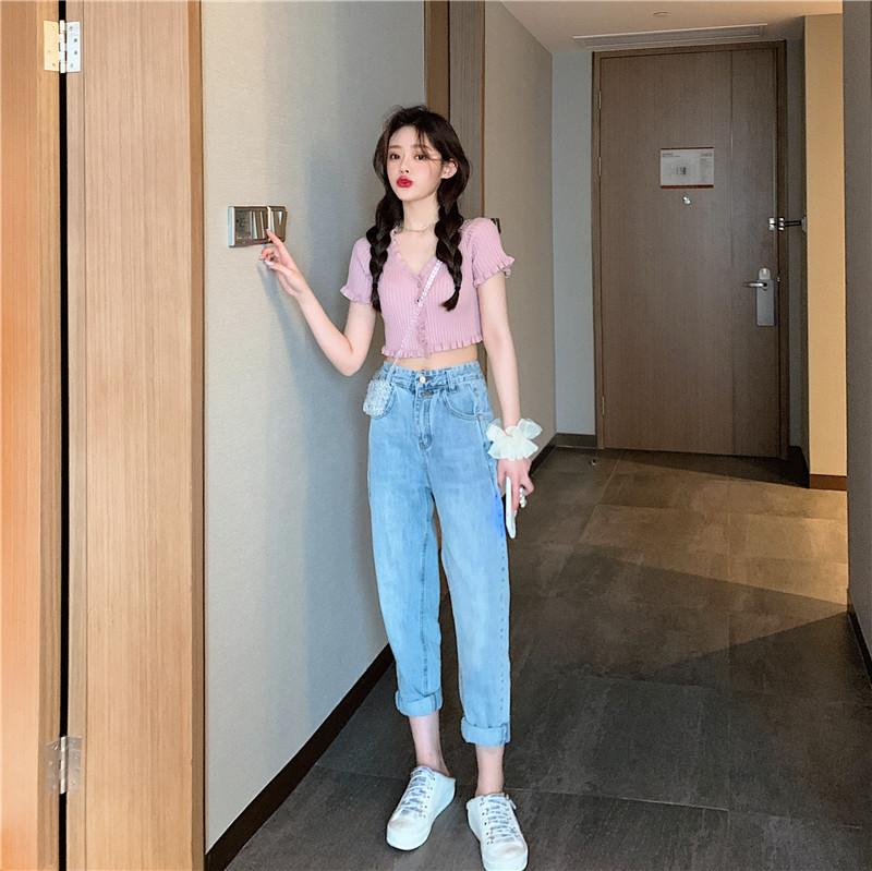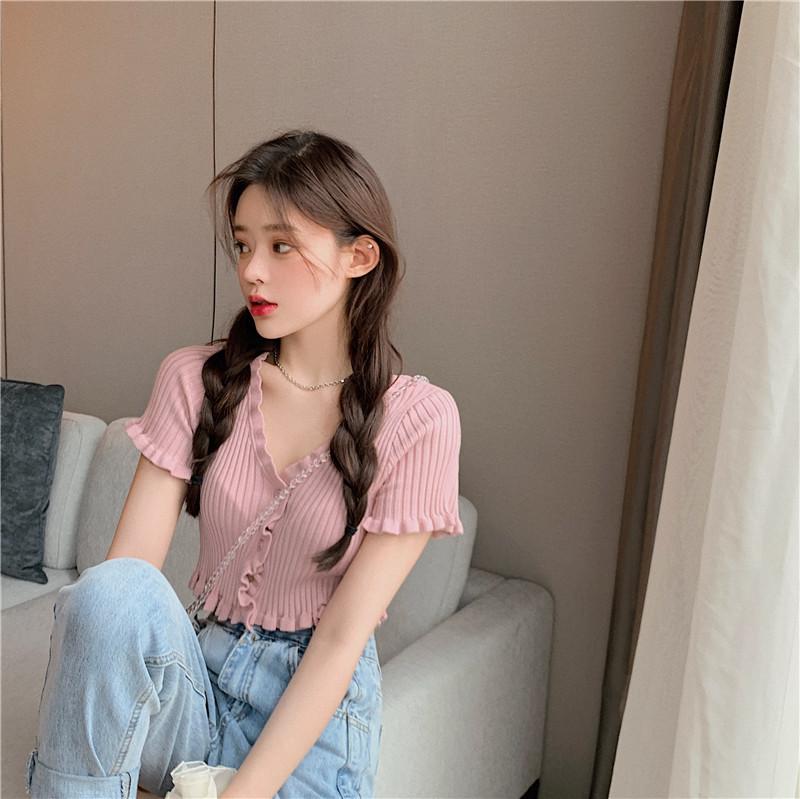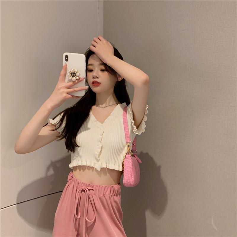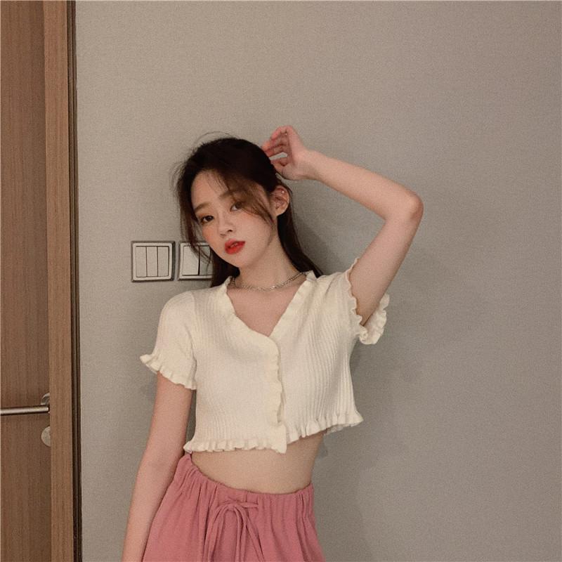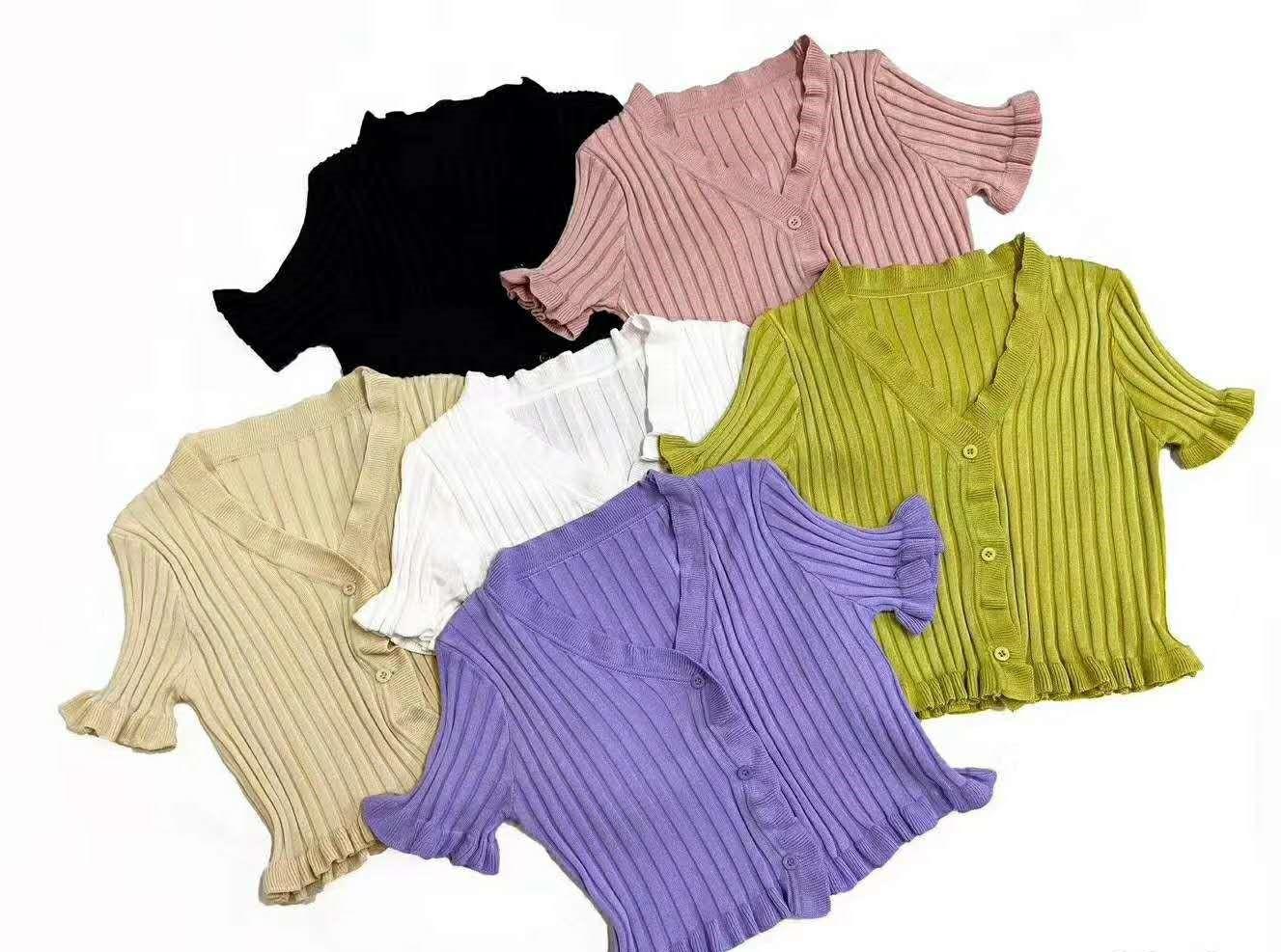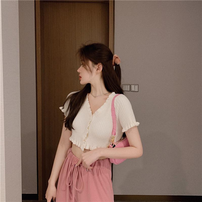 Compre Tricô de Manga Curta para Mulheres Verão Casaco Fino Curto Cintura Alta Top Cropped Transfronteiriço Outono Novo Decote V Cardigan Bm no atacado no Joom.pro