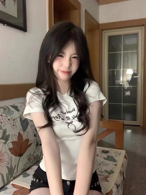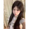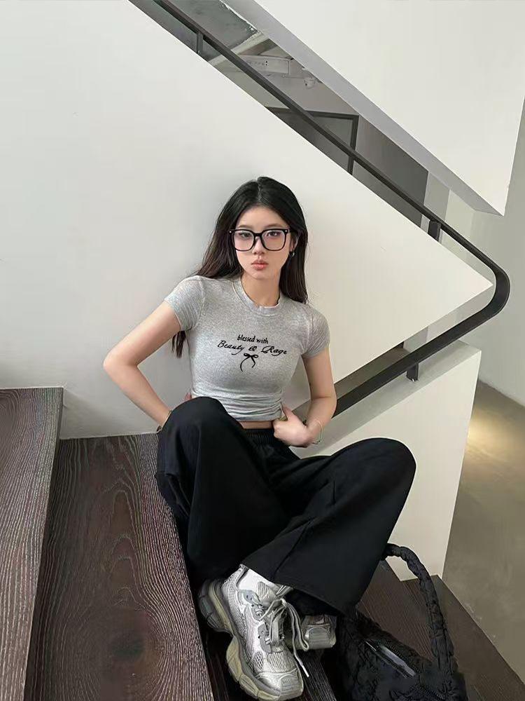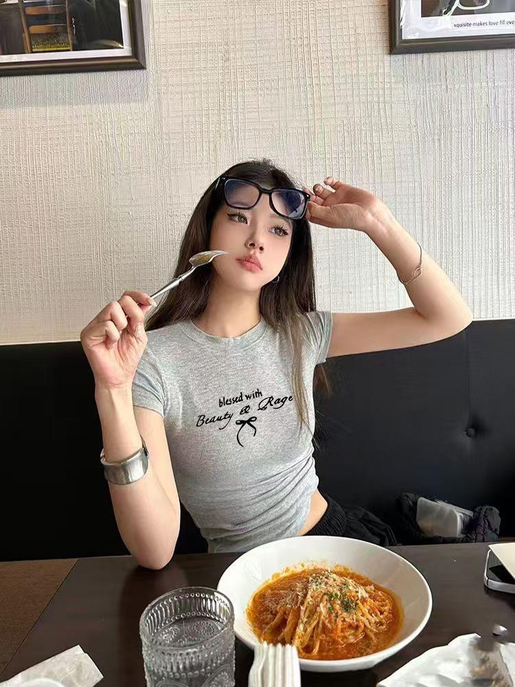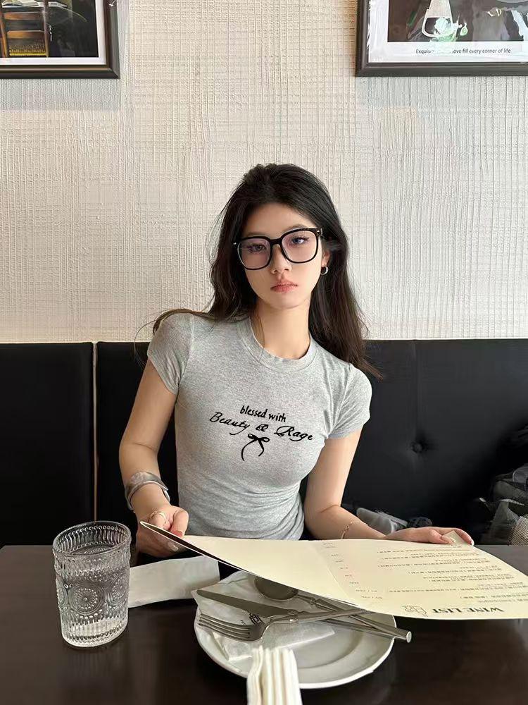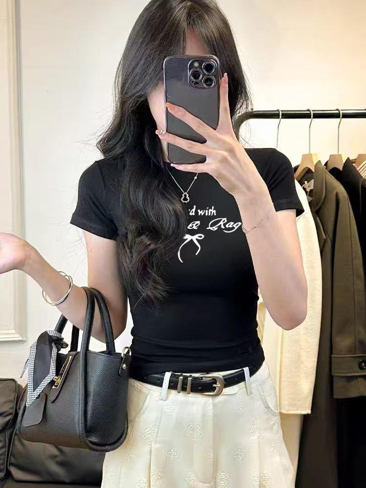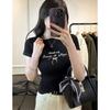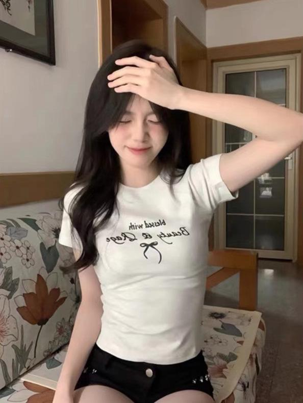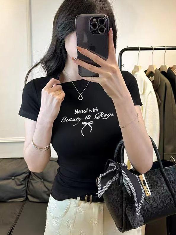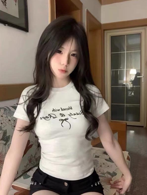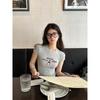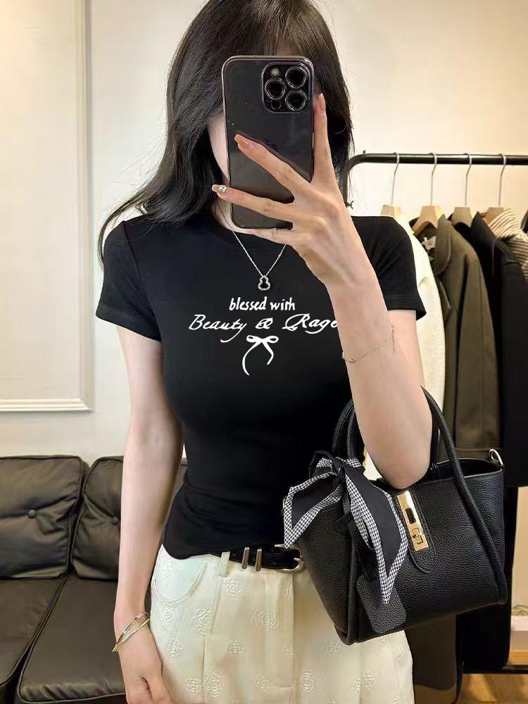 Camiseta de Manga Curta com Look Emagrecedor no Ombro Direito Gola Redonda Top Casual Estampa de Laço com Letra Americana Roupas Femininas de Boutique