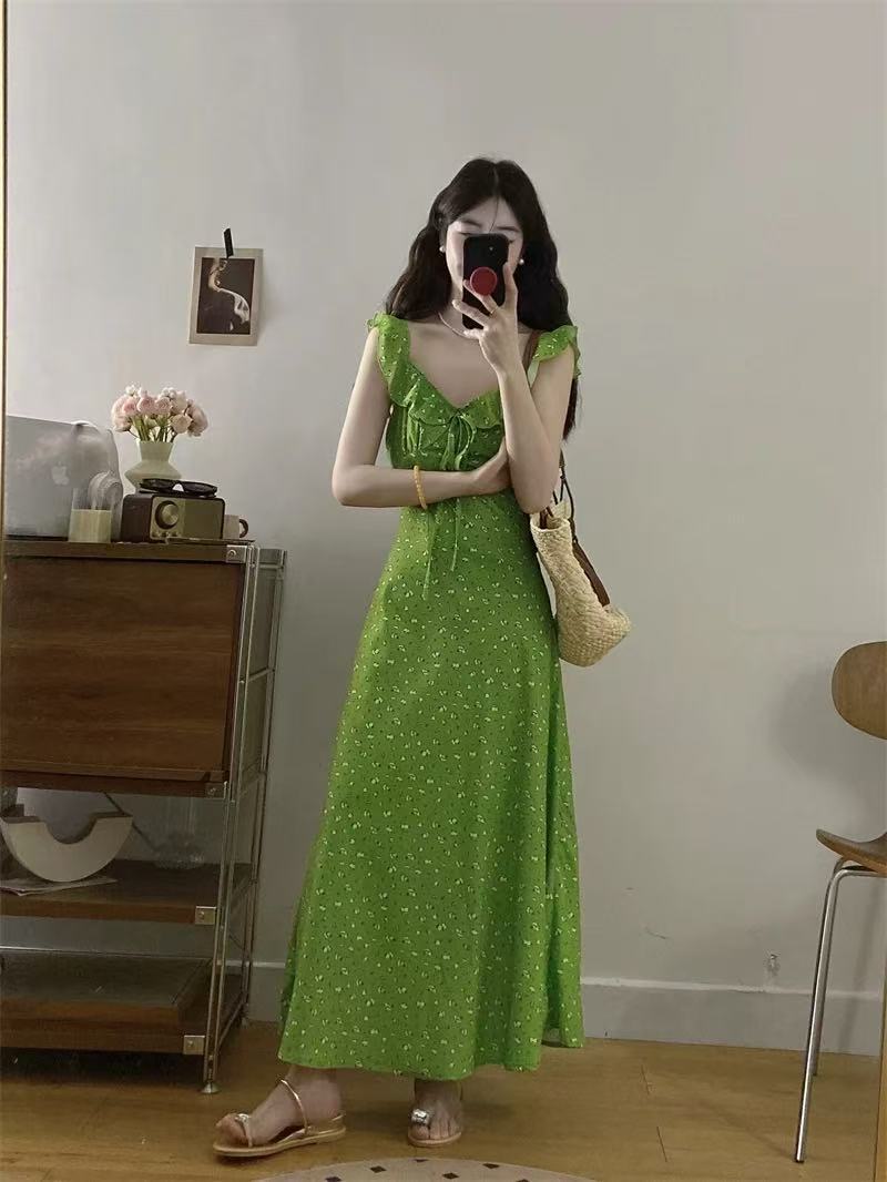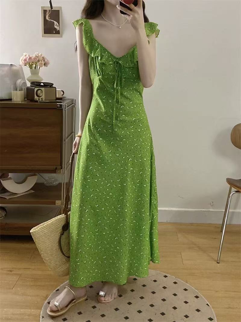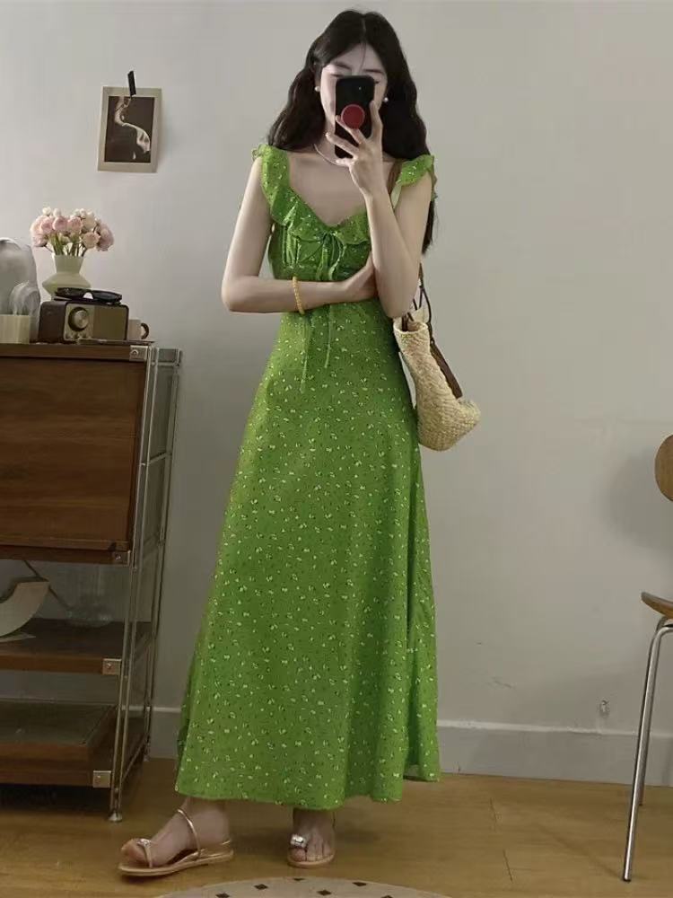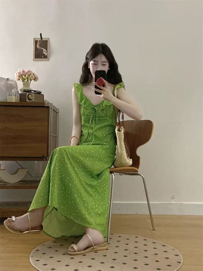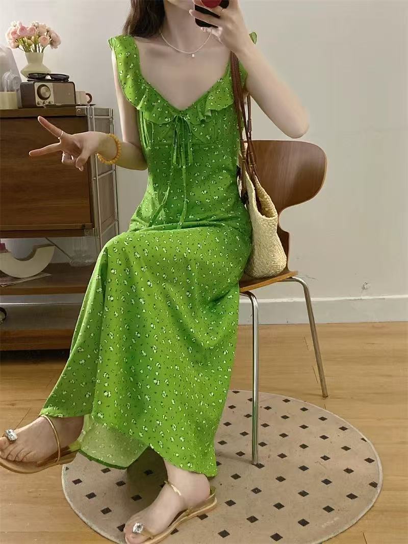 Compre Vestido Verde Floral Babado Decote V Alças Finas para Mulheres Estilo Coreano Estilo Francês Suave Look Emagrecedor na Cintura Saia Longa Linha A no atacado no Joom.pro
