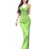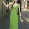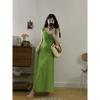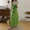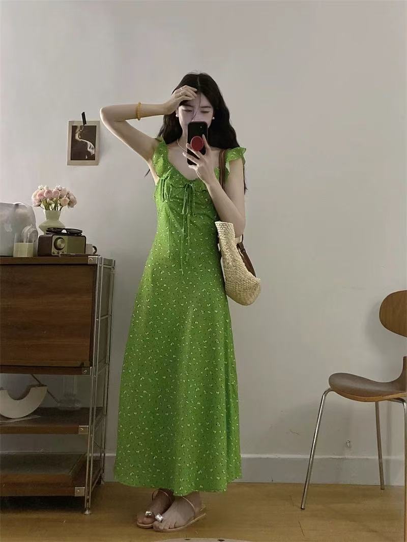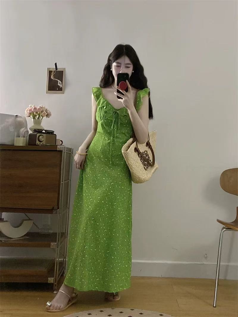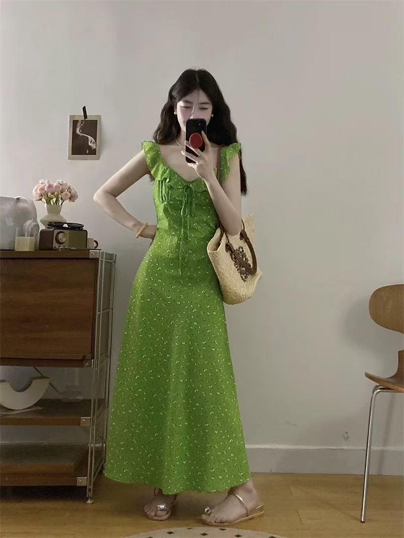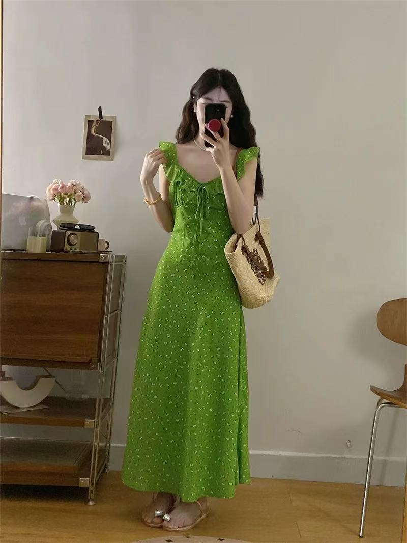 Compre Vestido Verde Floral Babado Decote V Alças Finas para Mulheres Estilo Coreano Estilo Francês Suave Look Emagrecedor na Cintura Saia Longa Linha A no atacado no Joom.pro