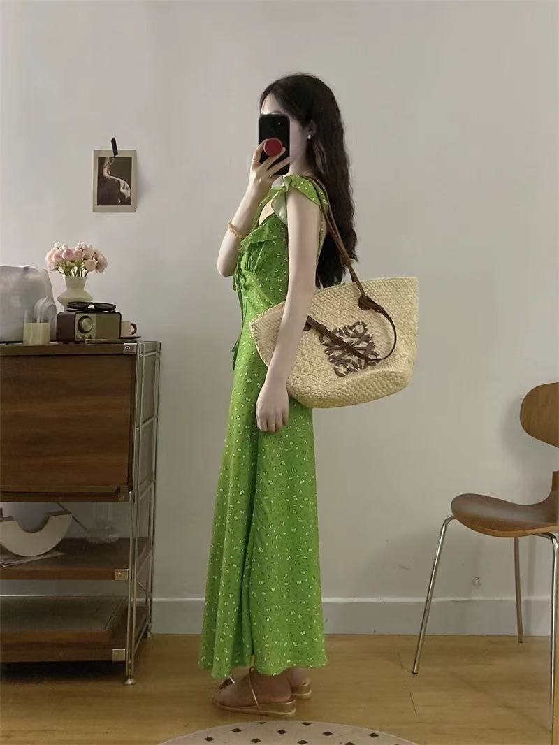 Vestido Verde Floral Babado Decote V Alças Finas para Mulheres Estilo Coreano Estilo Francês Suave Look Emagrecedor na Cintura Saia Longa Linha A