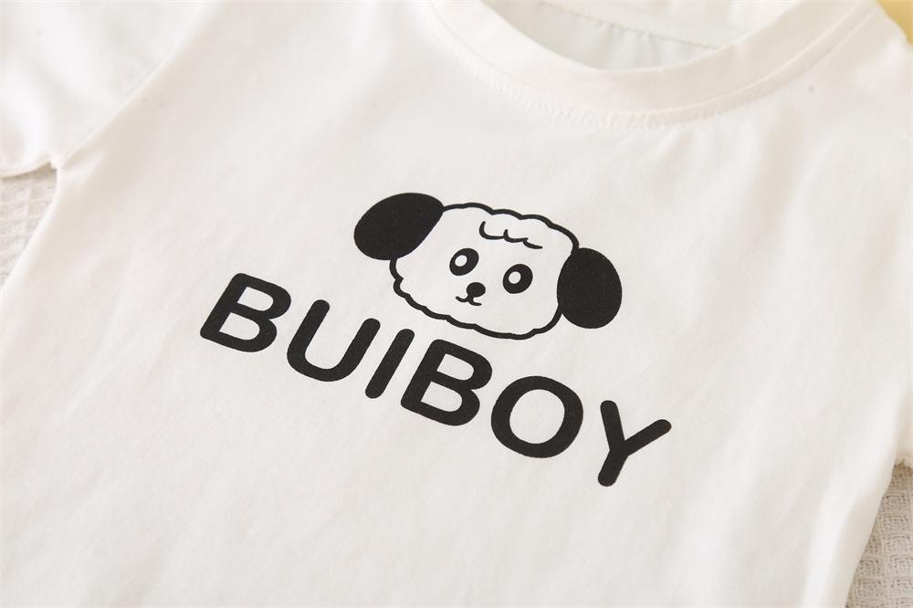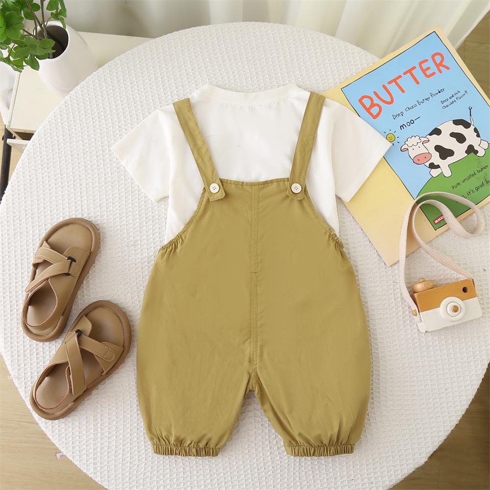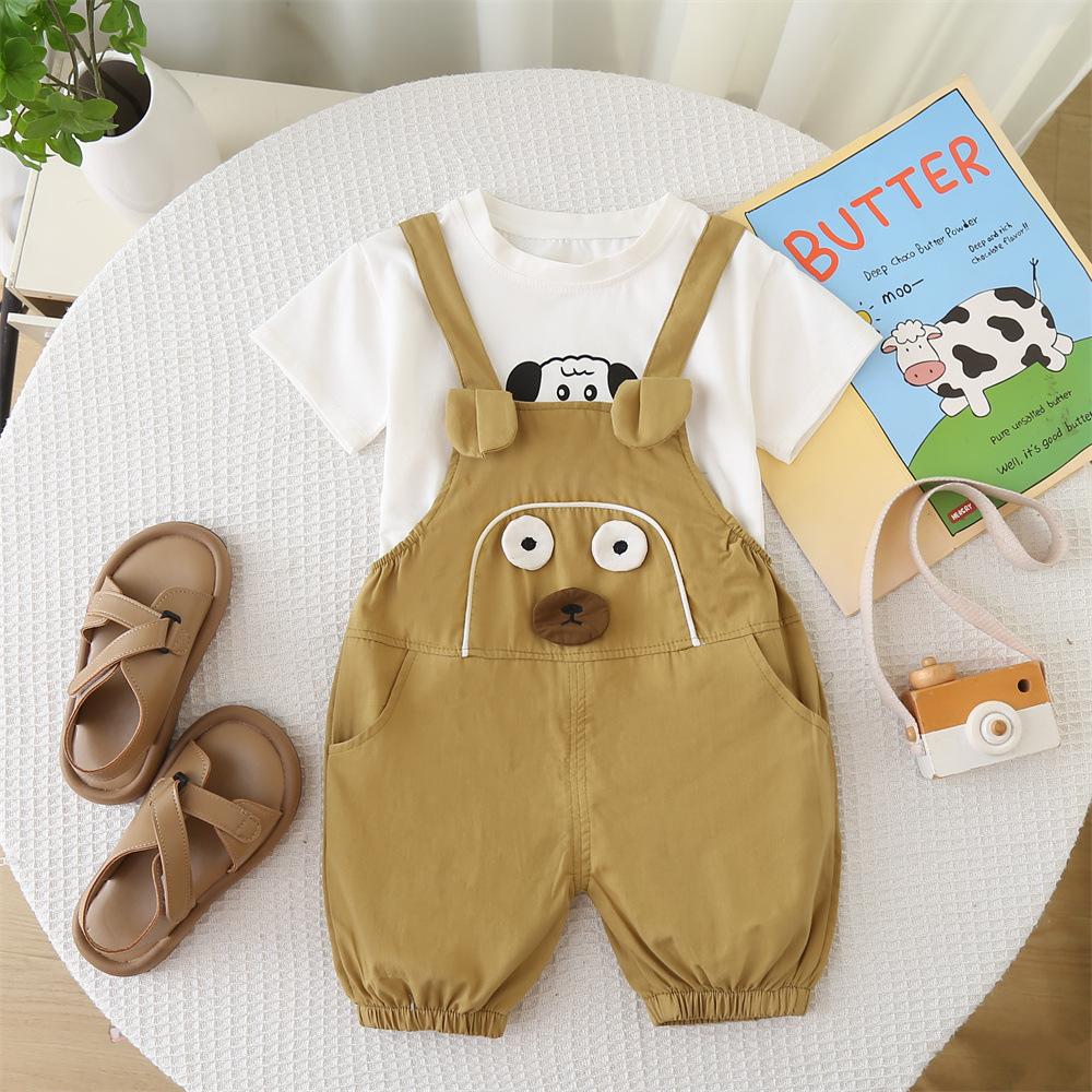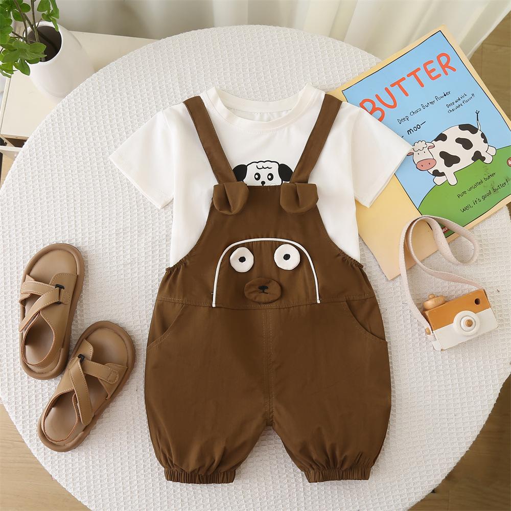 Roupas de Verão Infantis 2025 Bebê Menino Desenho Animado Cachorro de Olhos Grandes Shorts de Suspensório Conjunto de Duas Peças Moda Verão para Meninos Trendy