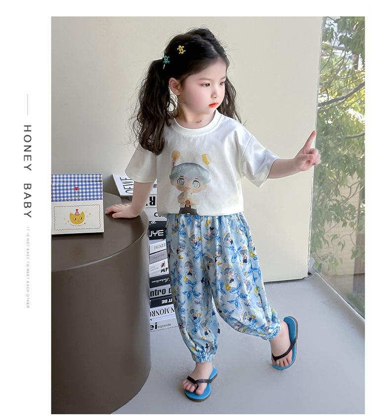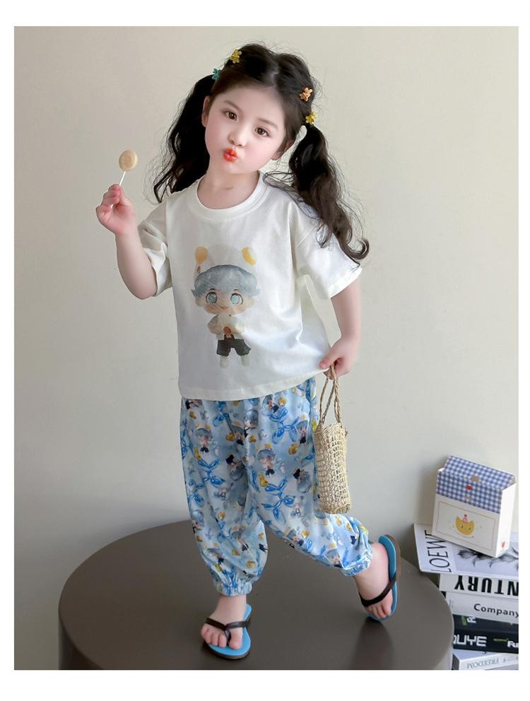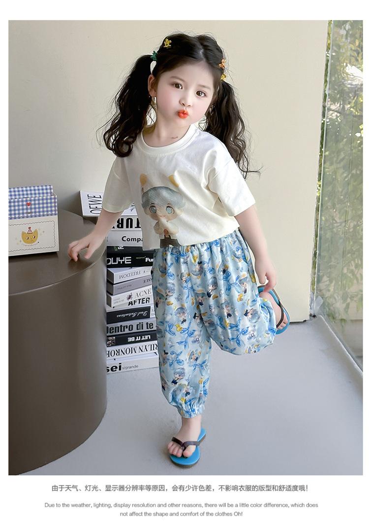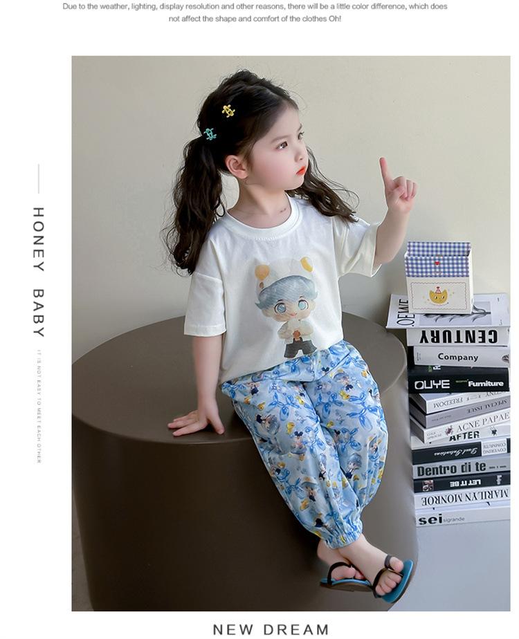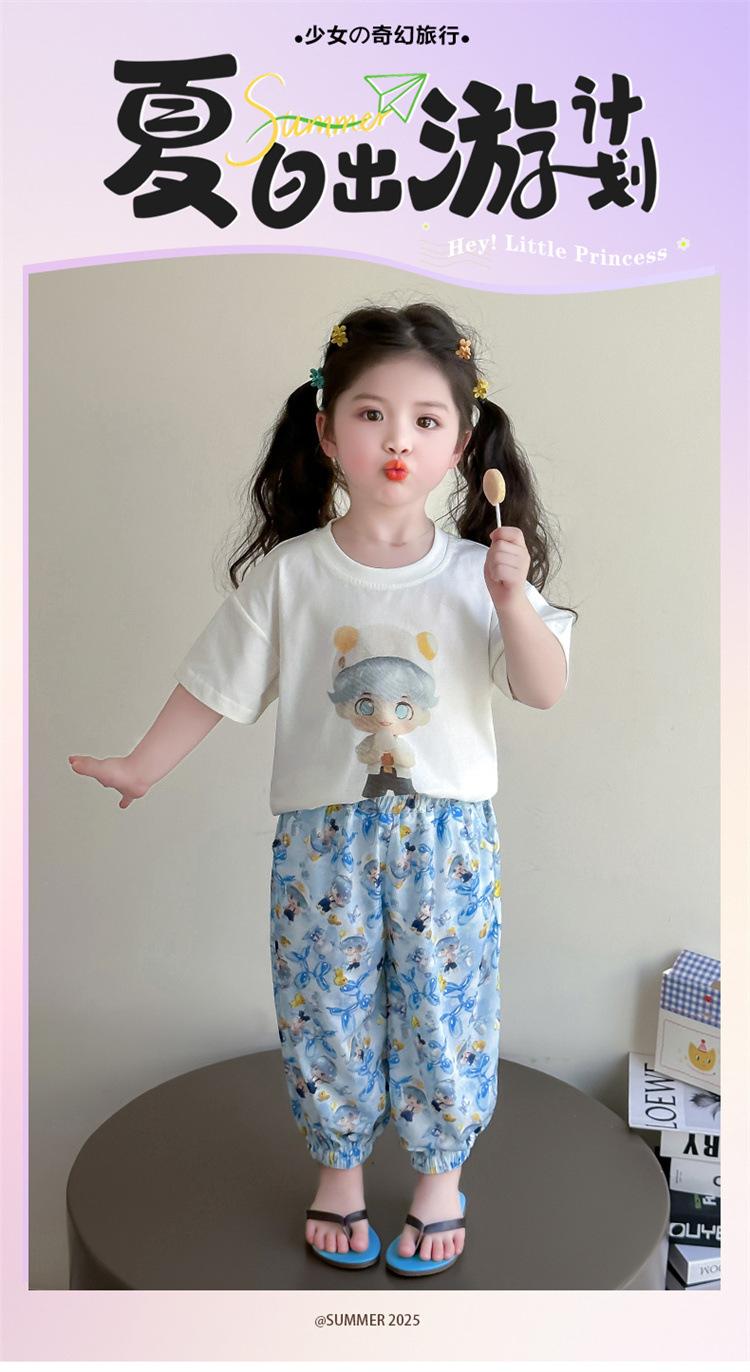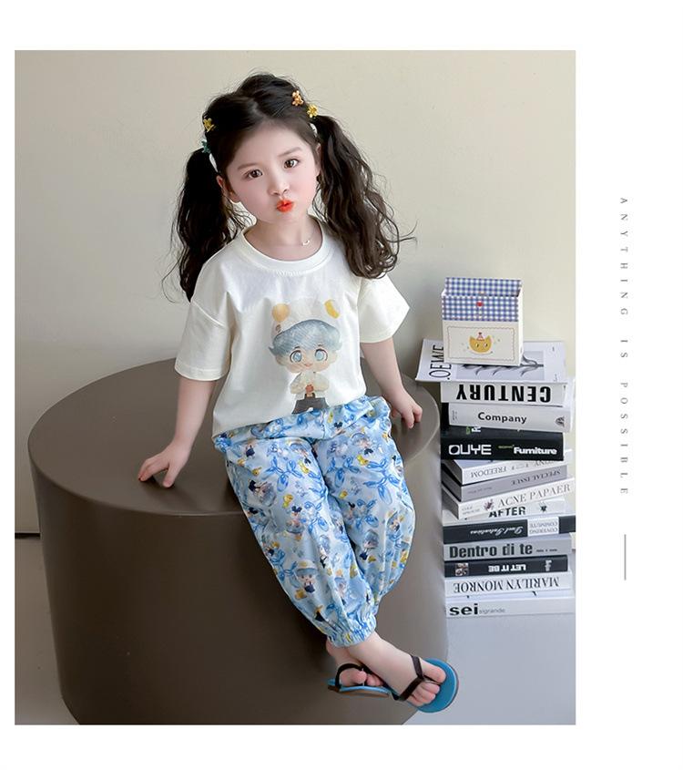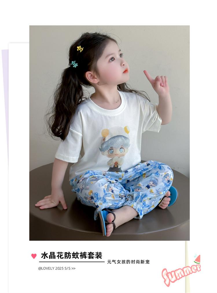 Conjunto Infantil de Verão de Manga Curta para Meninas 2025 Novo Camiseta Infantil Calça Anti-Mosquito Desenho Animado Conjunto de Duas Peças Roupas de Verão para Bebê 3