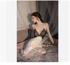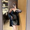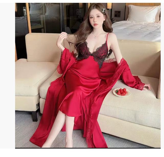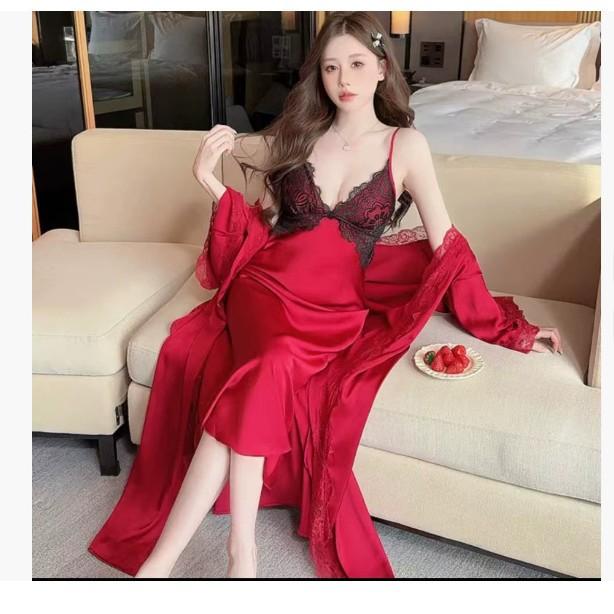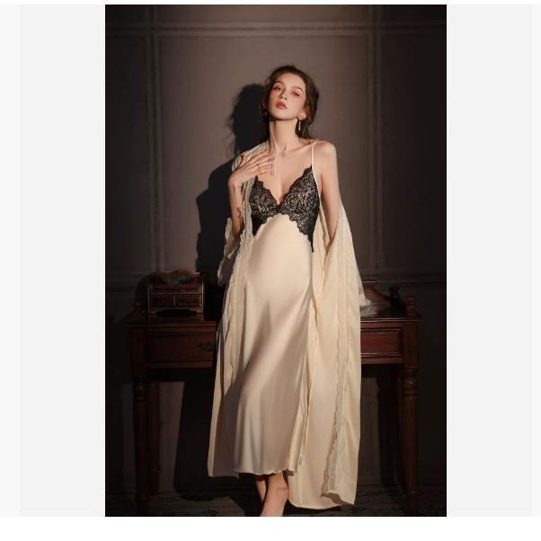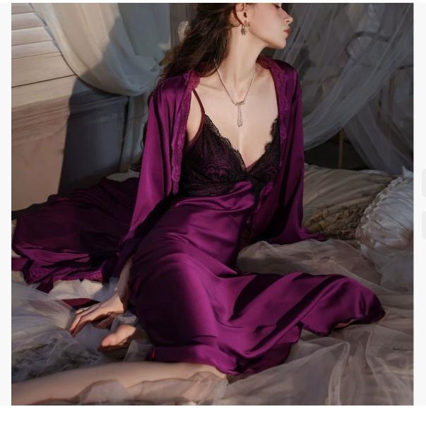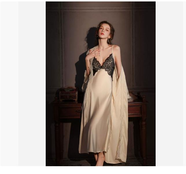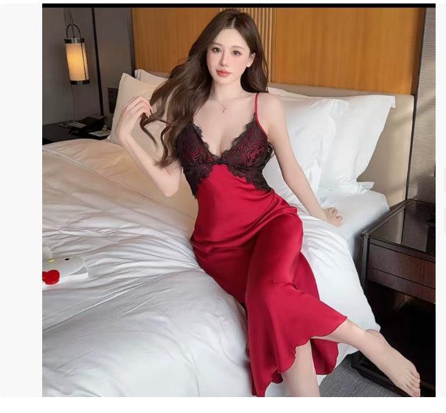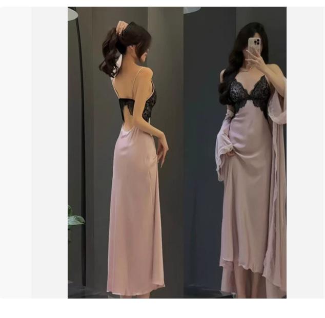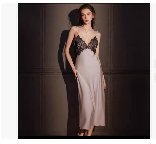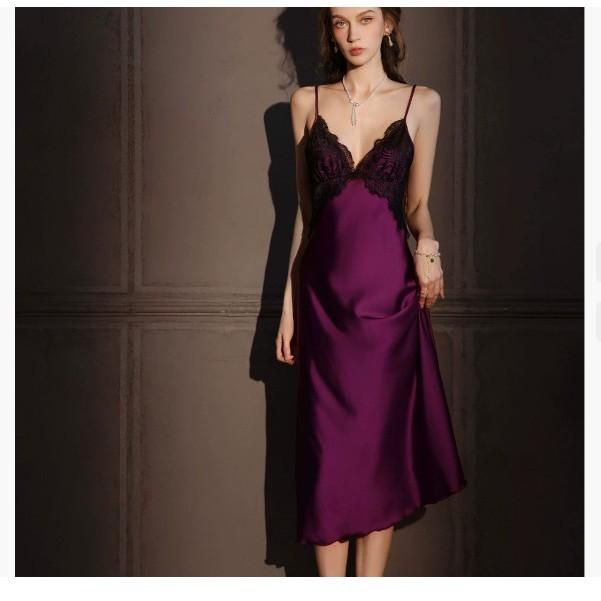 Camisola Sexy Feminina de Seda Gelo Fina Longa Acima do Joelho Estilo Francês com Bojos, Sem Costas Estilo Desejo Puro Roupa de Dormir