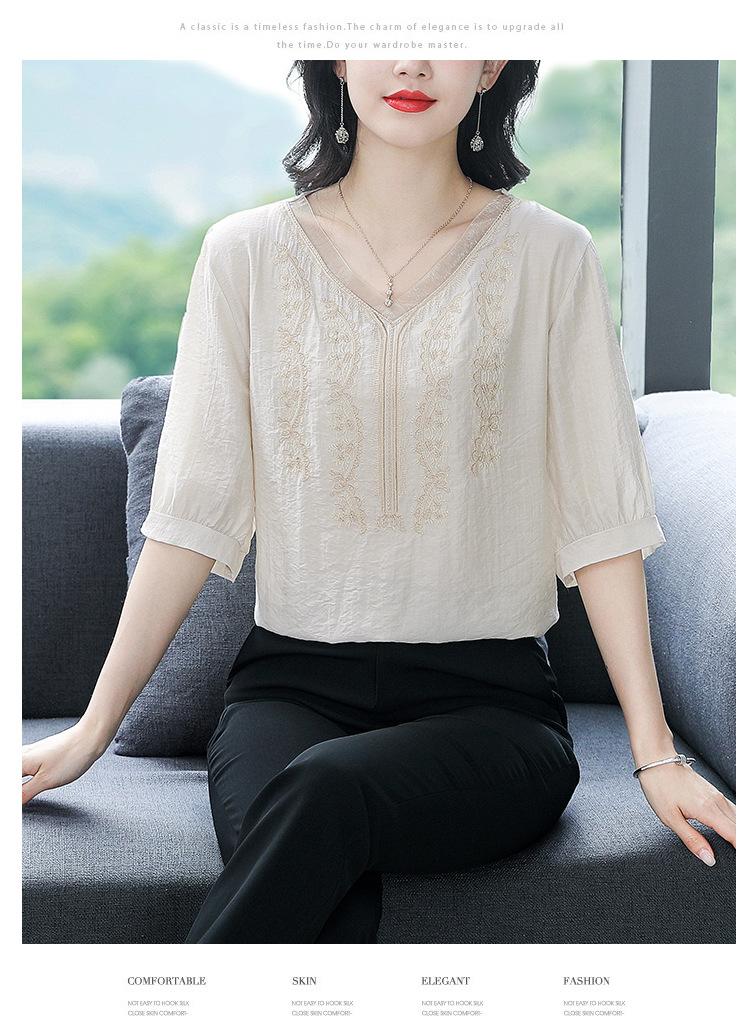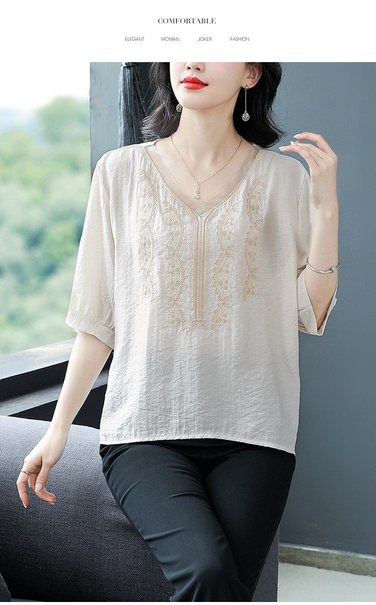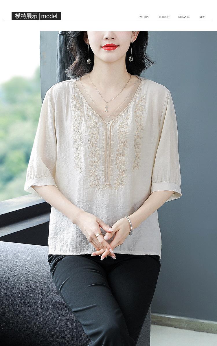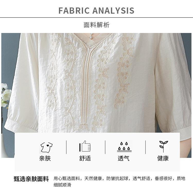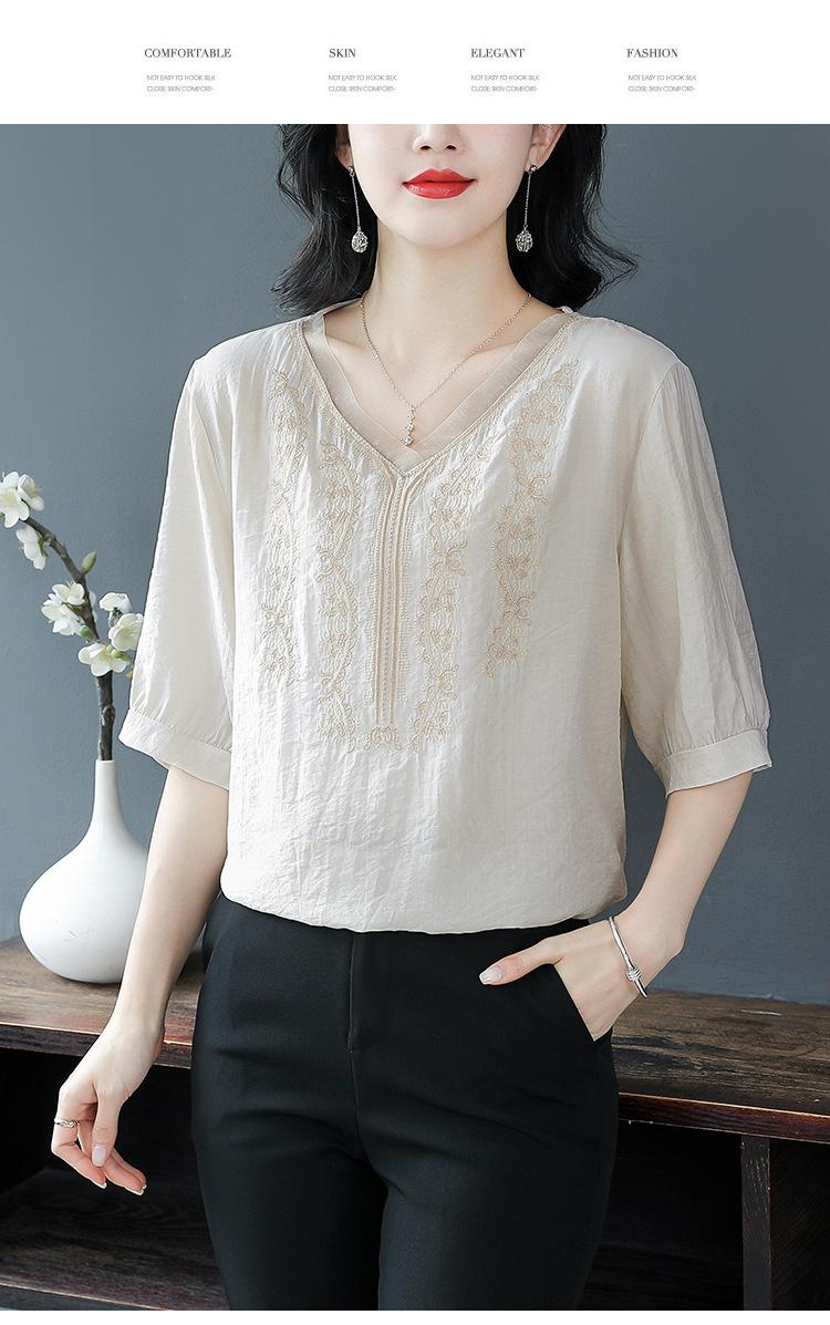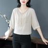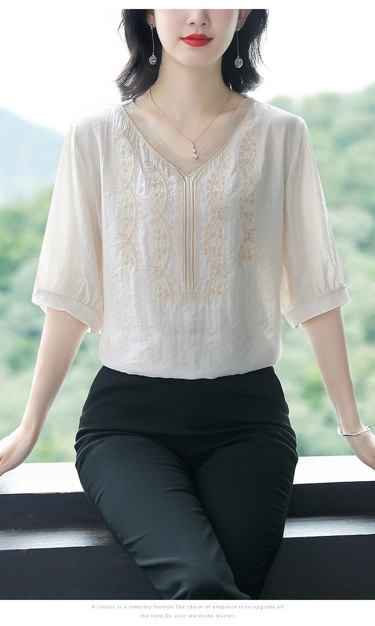 Em Estoque Foto Real Verão 2025 Novo Algodão e Linho Solto Cobrindo a Barriga Bordado Blusa Decote V Manga Curta Camiseta Blusa de Mãe