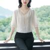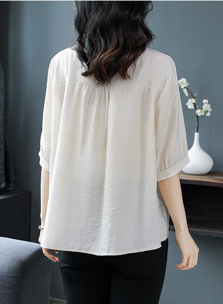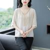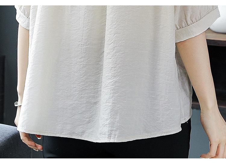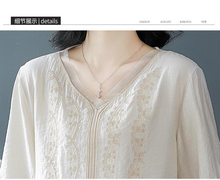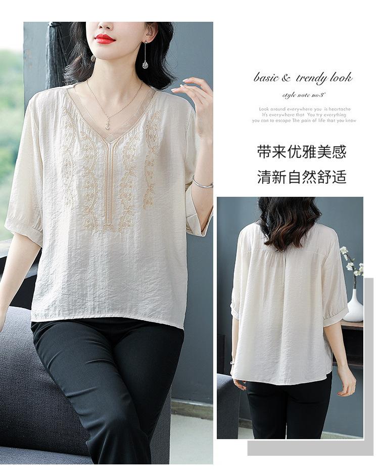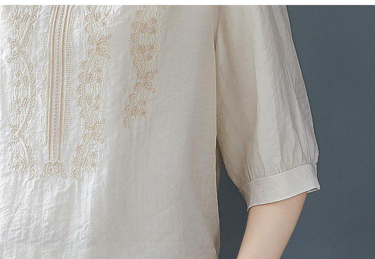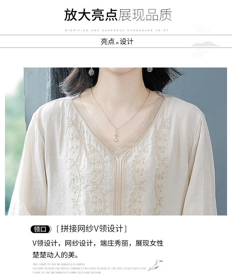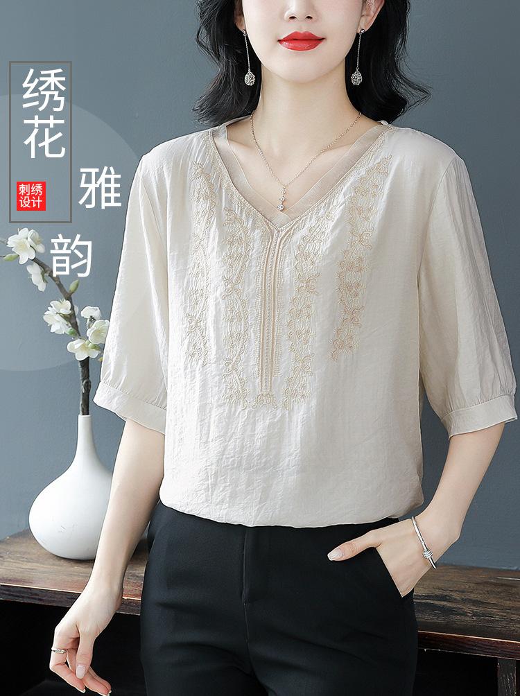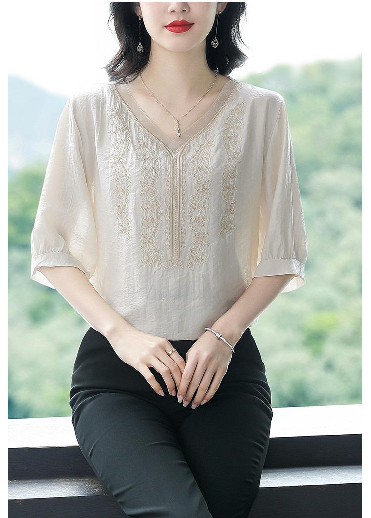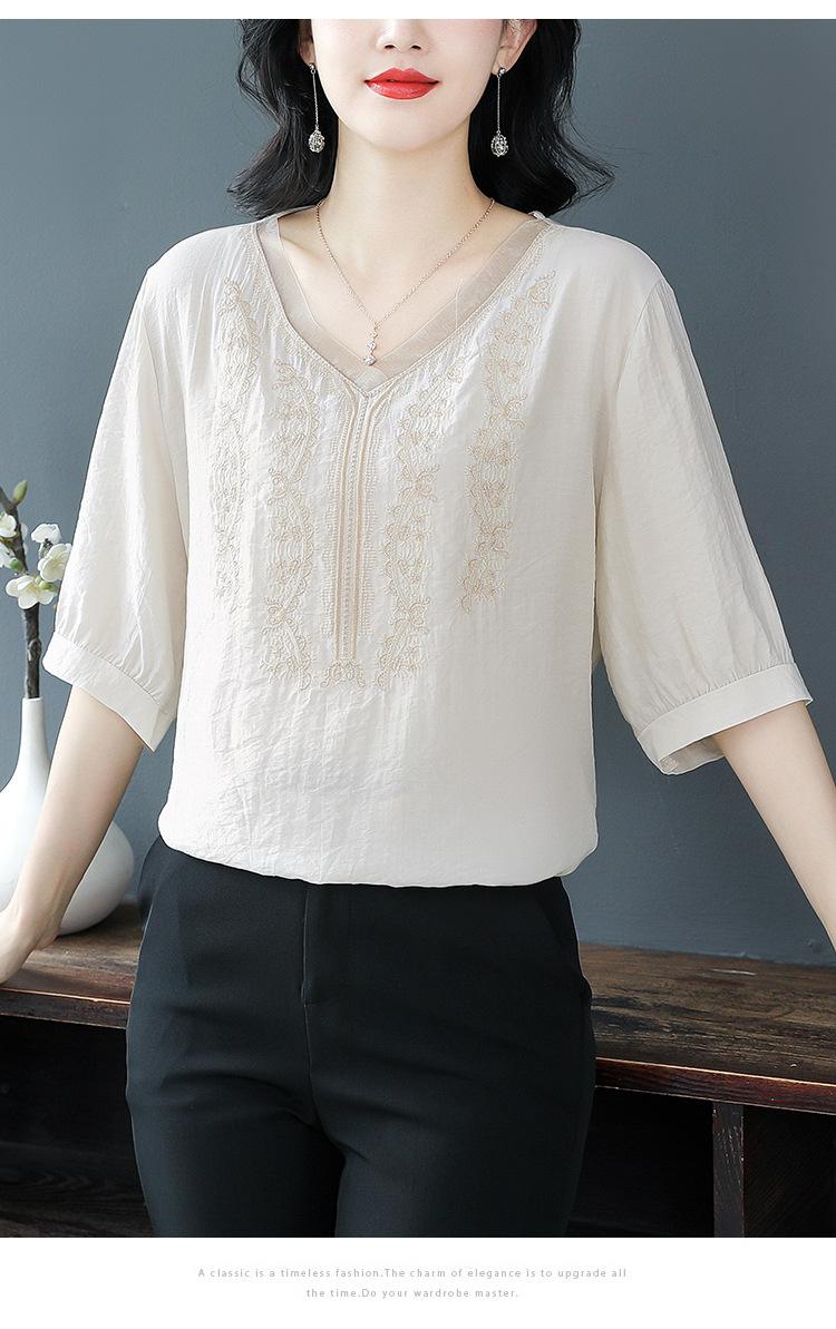 Em Estoque Foto Real Verão 2025 Novo Algodão e Linho Solto Cobrindo a Barriga Bordado Blusa Decote V Manga Curta Camiseta Blusa de Mãe