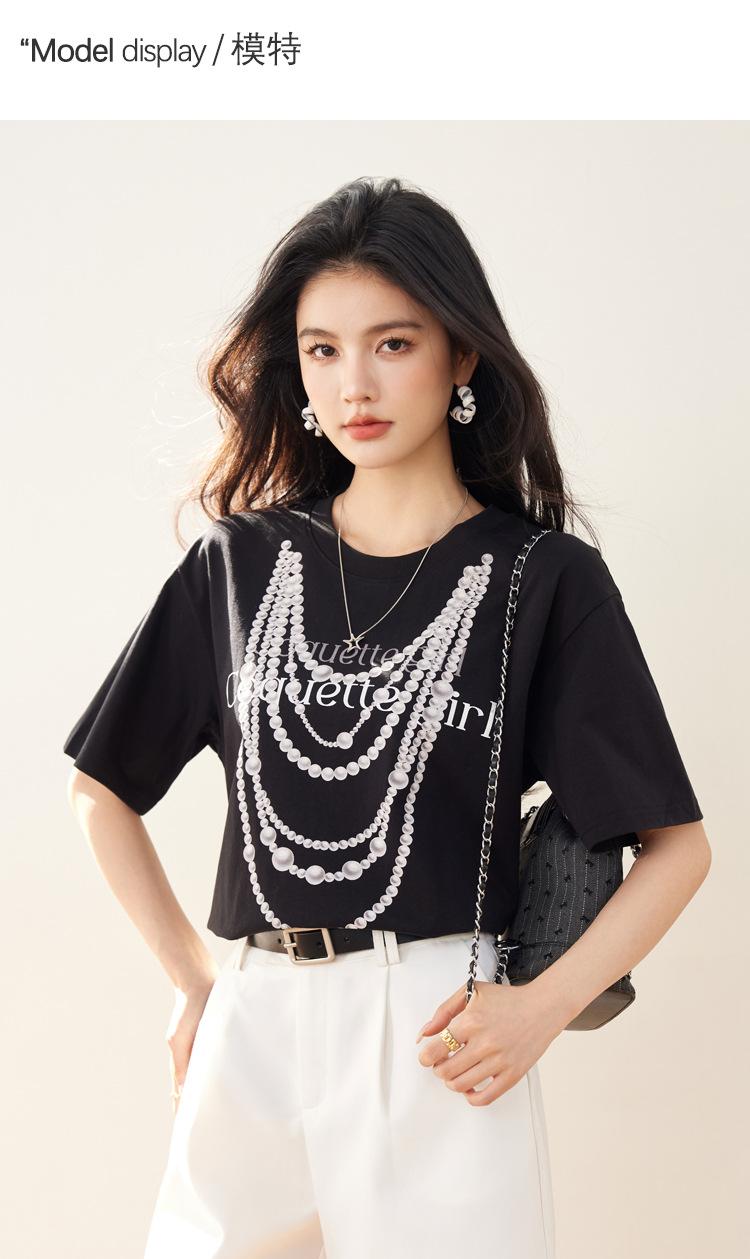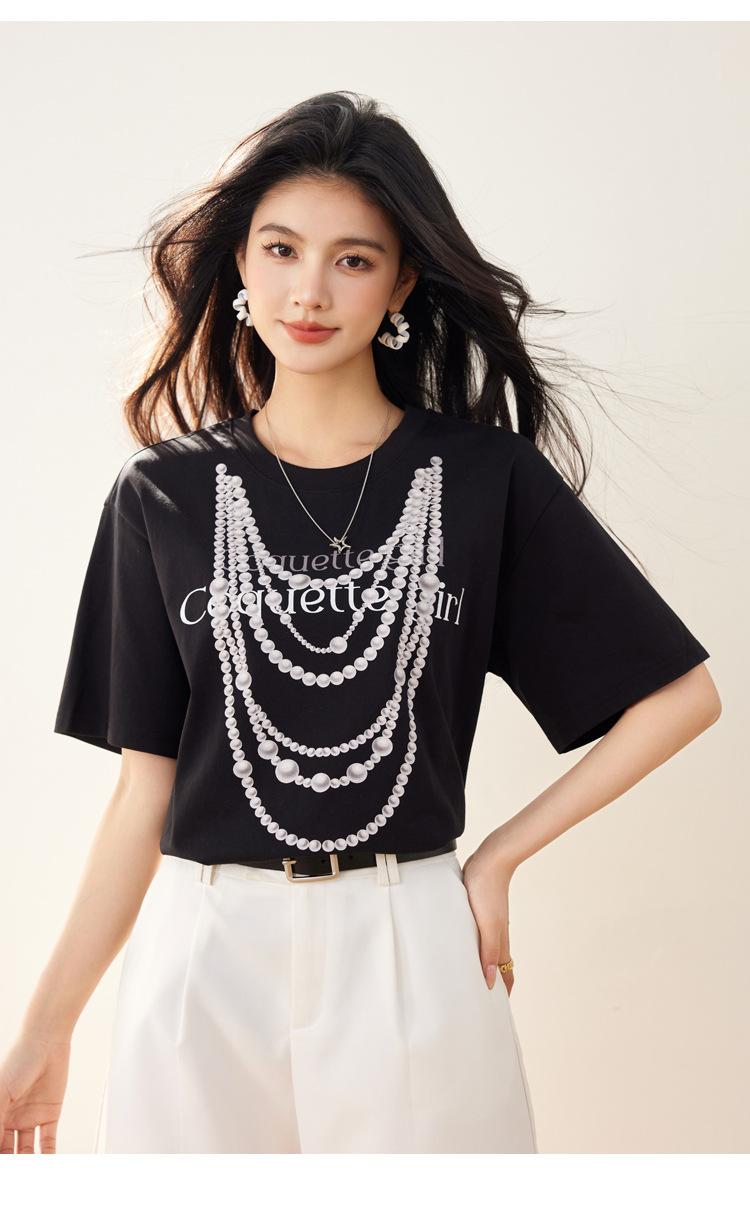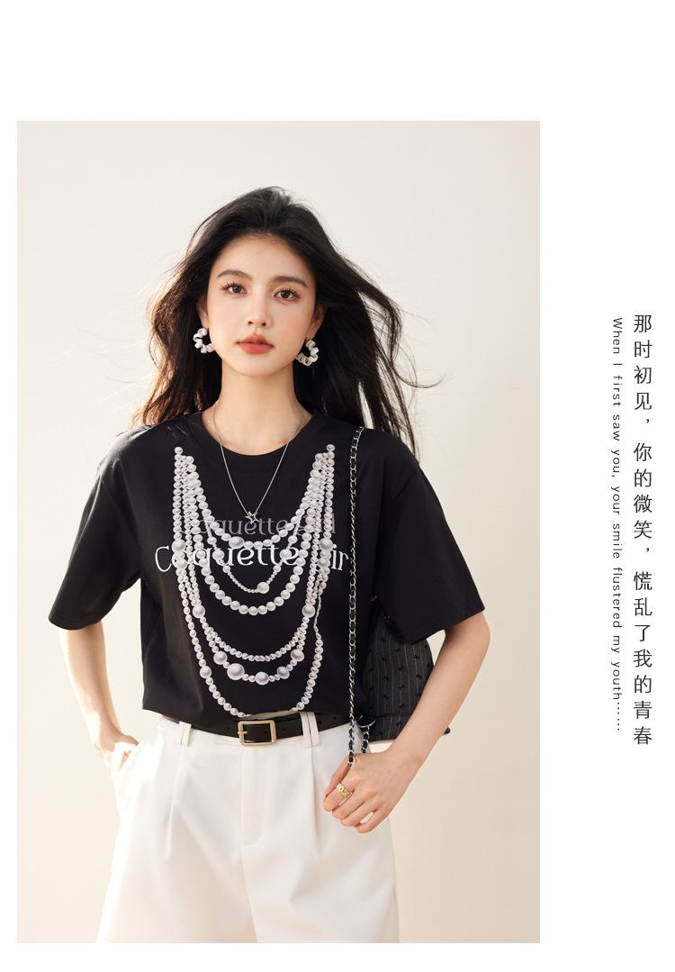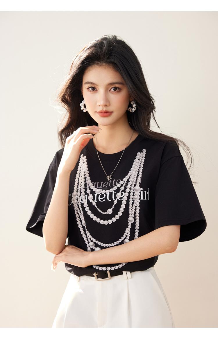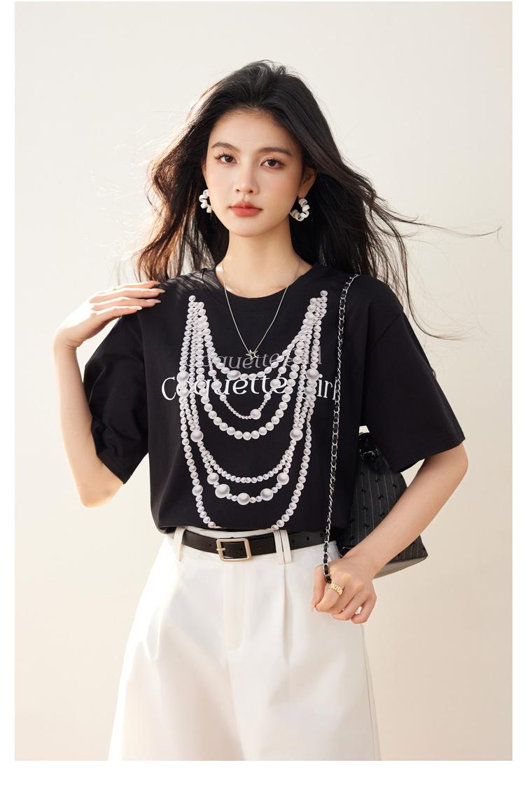 Compre 2025 Nova Roupa Feminina Estilo Americano Estampa de Pérolas Camiseta de Manga Curta Feminina Verão Retrô Solta Versátil Top no atacado no Joom.pro
