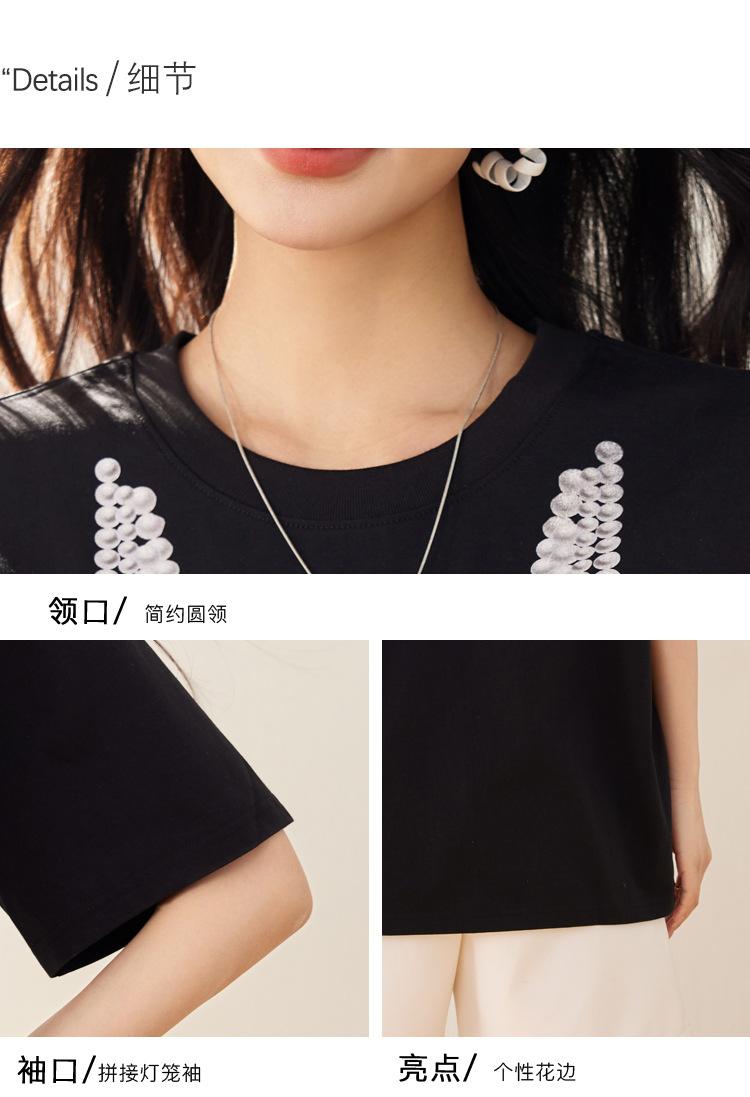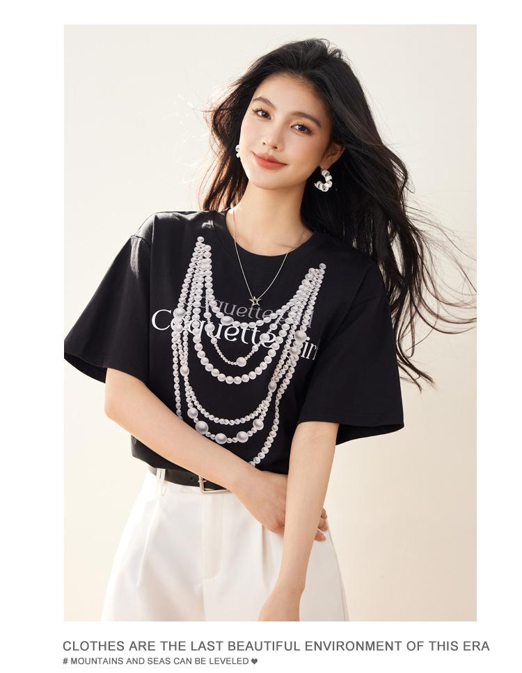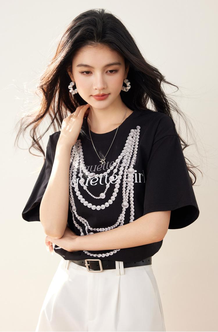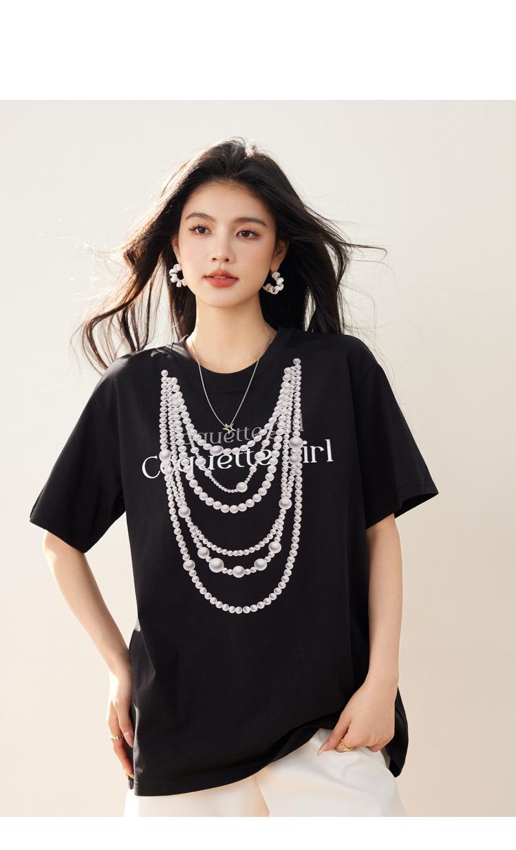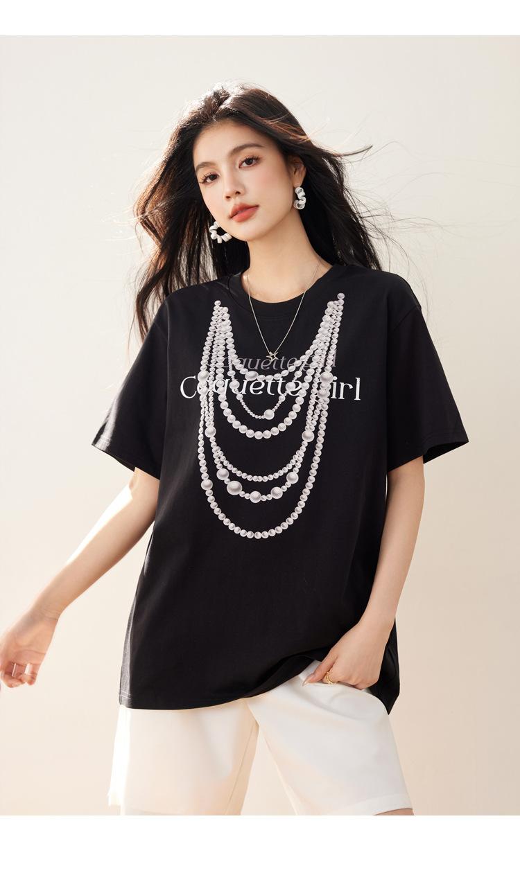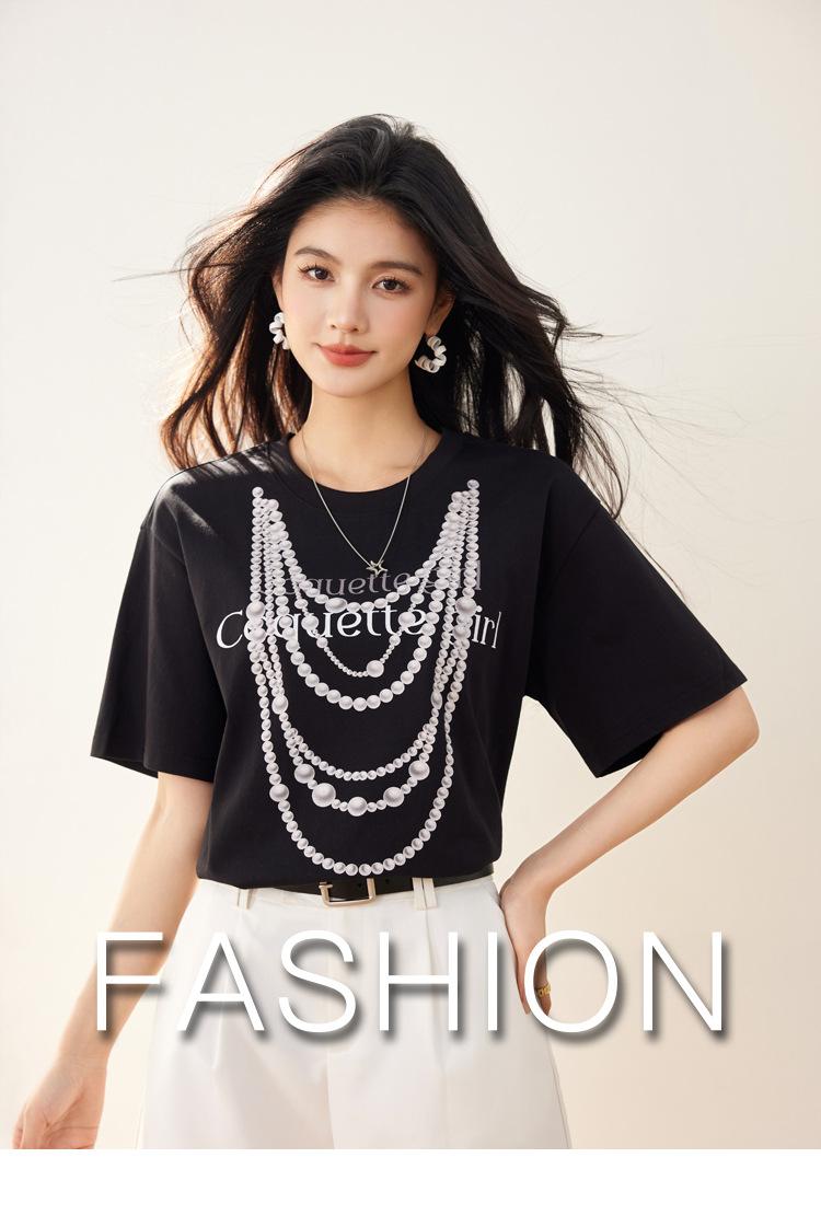 Compre 2025 Nova Roupa Feminina Estilo Americano Estampa de Pérolas Camiseta de Manga Curta Feminina Verão Retrô Solta Versátil Top no atacado no Joom.pro