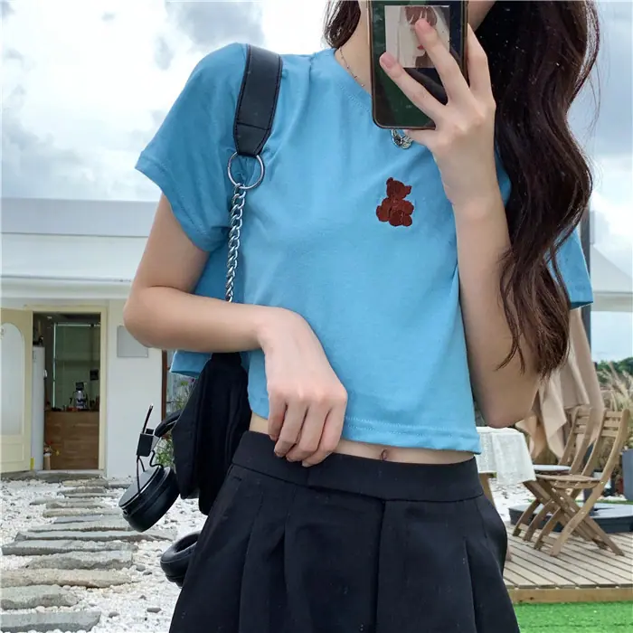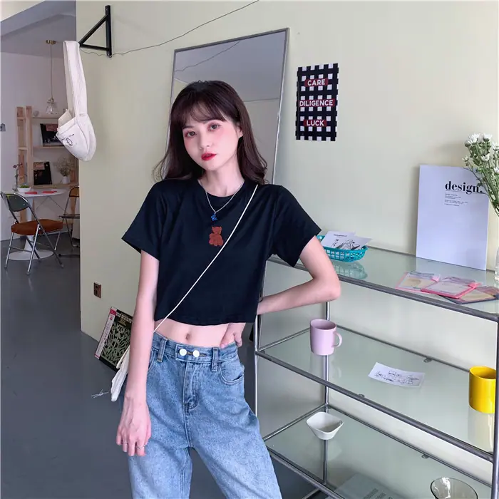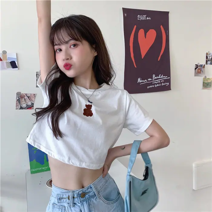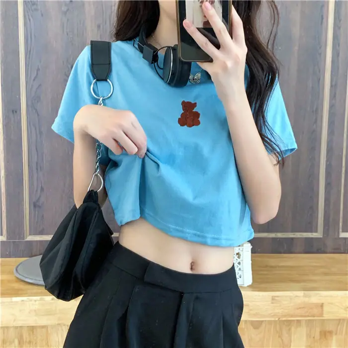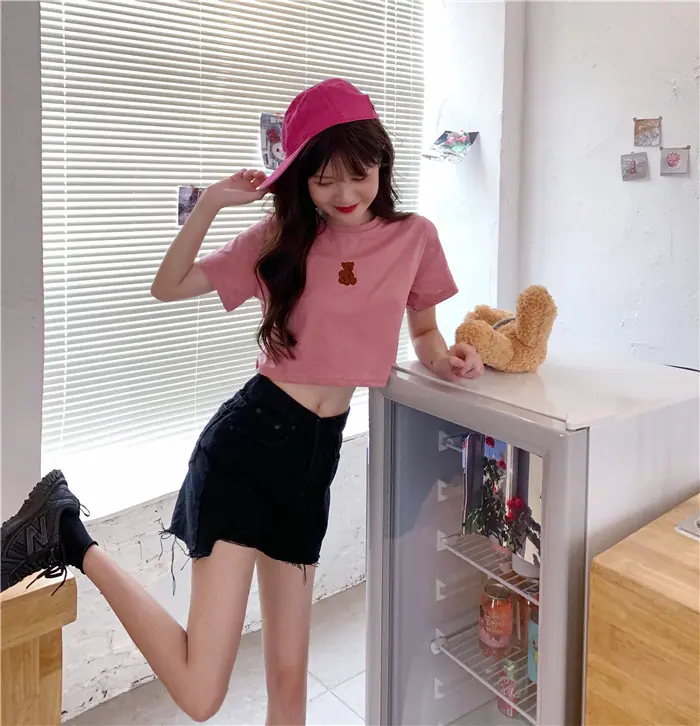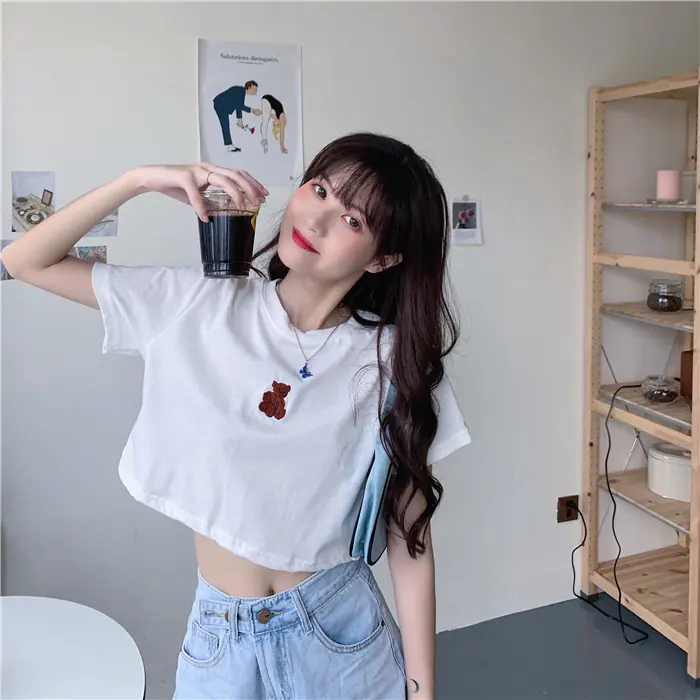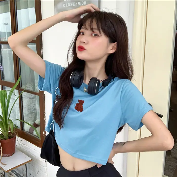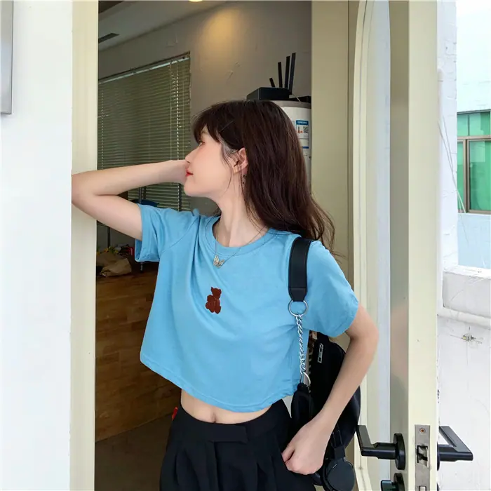 Compre Verão 2025 Estilo Coreano Novo Slim Curto Sem Cintura Urso Bordado Camiseta de Manga Curta Tops Estudantis Roupa Exterior Feminina no atacado no Joom.pro