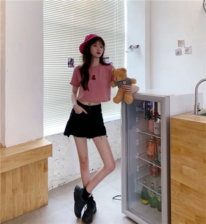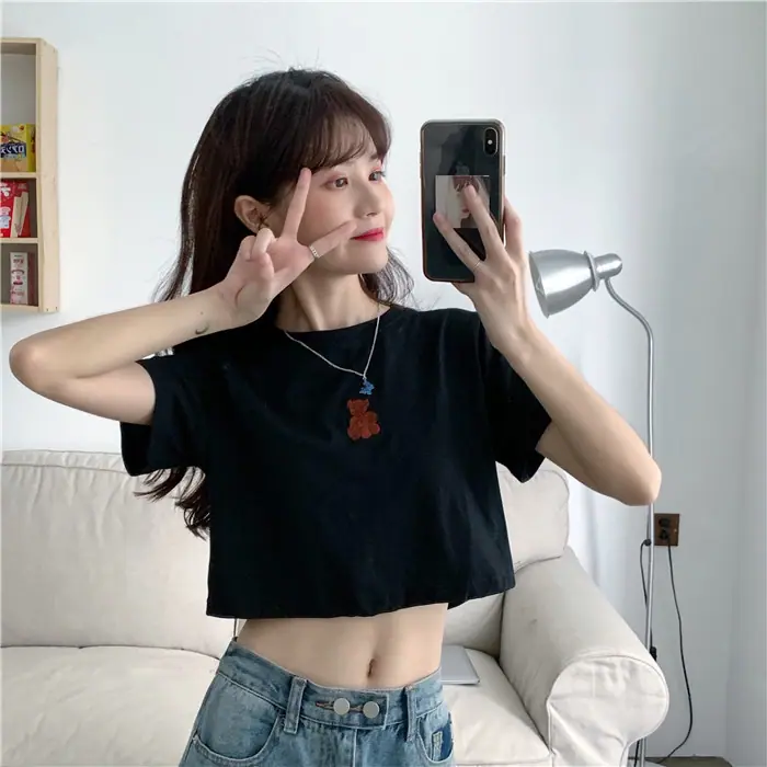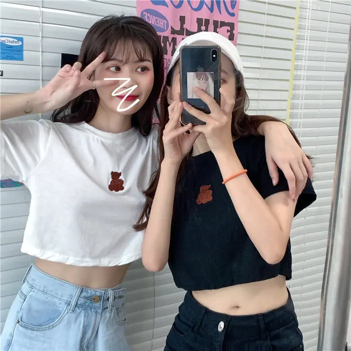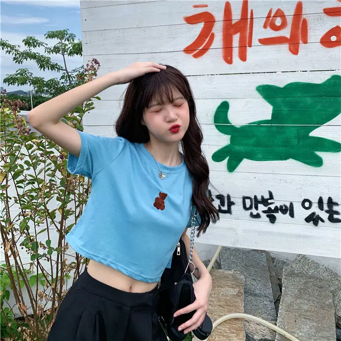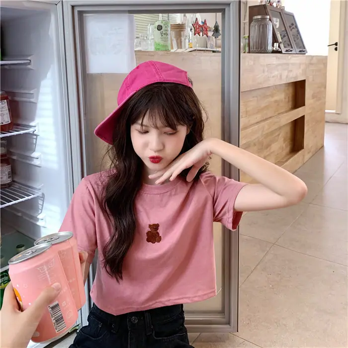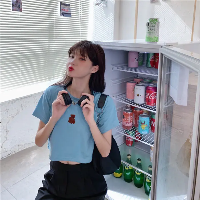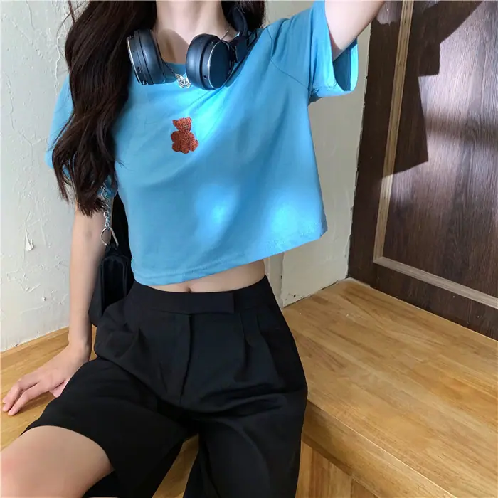 Compre Verão 2025 Estilo Coreano Novo Slim Curto Sem Cintura Urso Bordado Camiseta de Manga Curta Tops Estudantis Roupa Exterior Feminina no atacado no Joom.pro