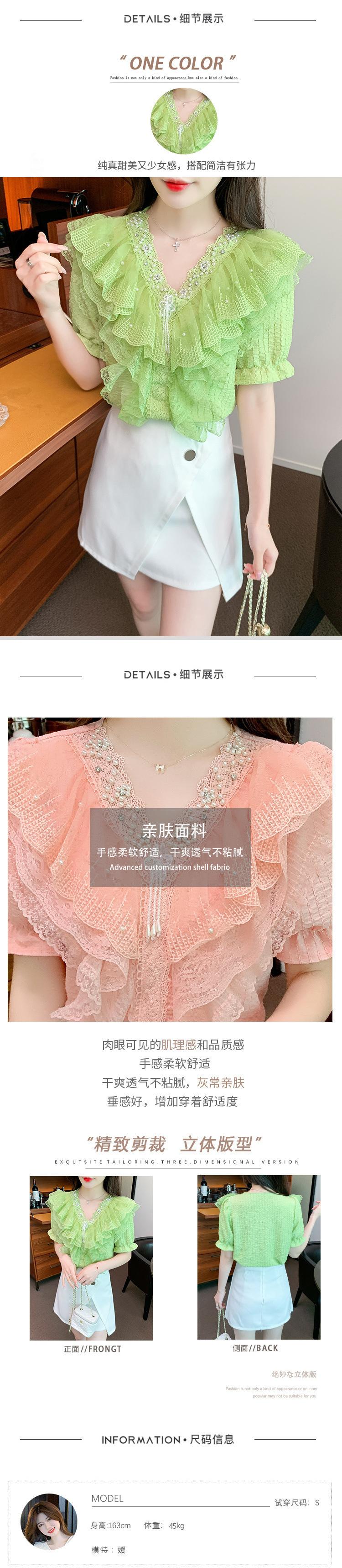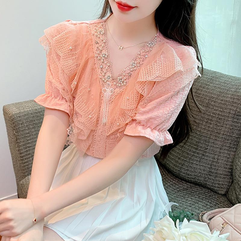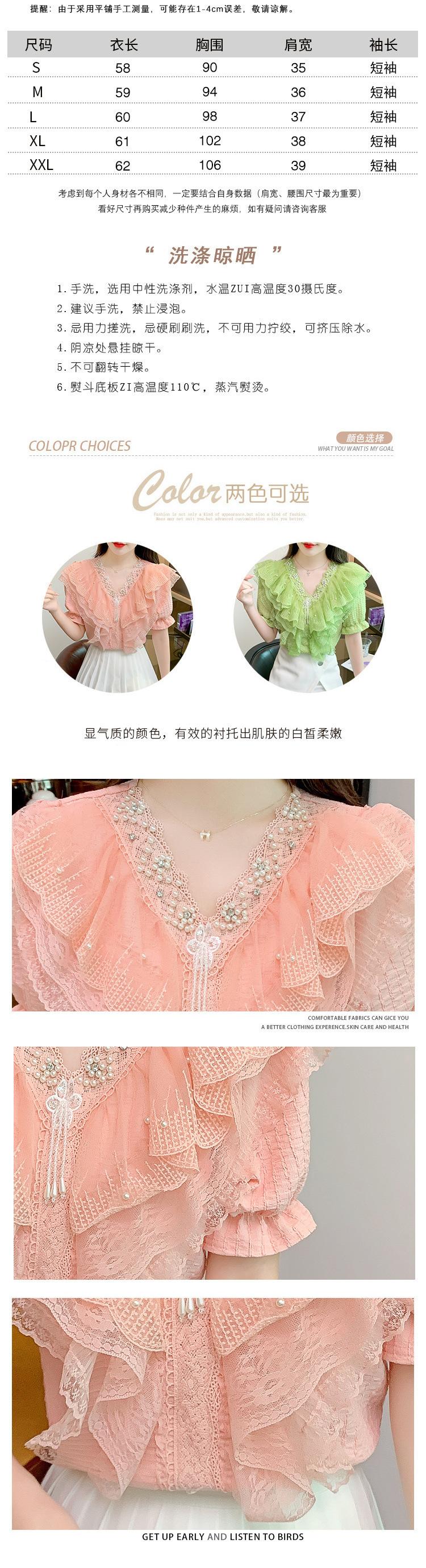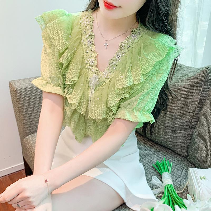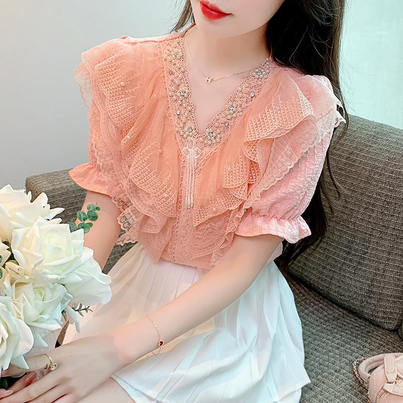 Compre Camisa Feminina de Chiffon de Manga Curta 2024 Novo Design de Verão Nicho Babados Cobrindo a Barriga Camisa Francesa Top no atacado no Joom.pro
