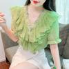 Camisa Feminina de Chiffon de Manga Curta 2024 Novo Design de Verão Nicho Babados Cobrindo a Barriga Camisa Francesa Top