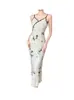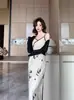 Novo Vestido de Suspensório Estampado Chinoiserie para Mulheres Verão Novo Estilo Nacional Fivela Decote V Cintura Afinando o Visual Quadril Saia Longa