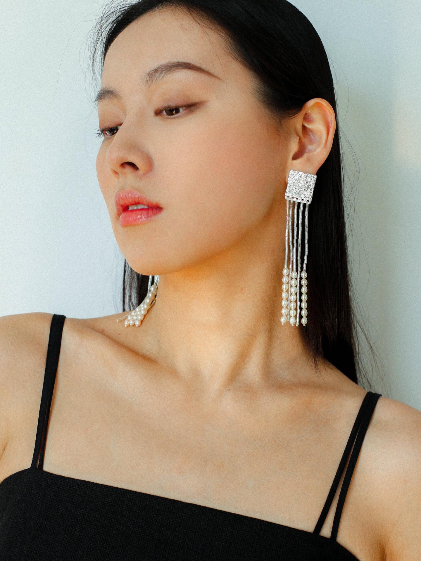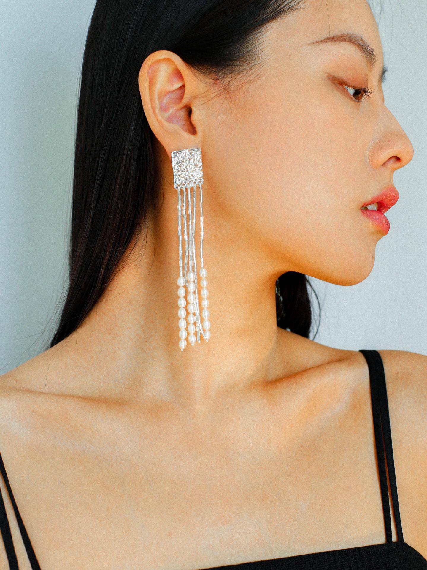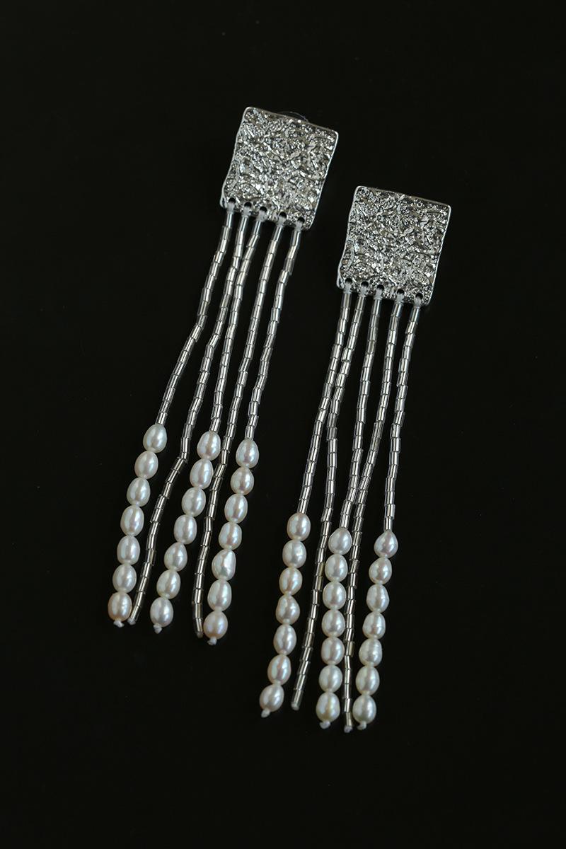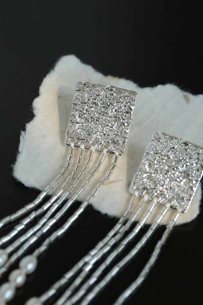 Compre Brincos tubulares quadrados de pérola de lava estilo europeu e americano design de moda de nicho feminino brincos longos prateados no atacado no Joom.pro