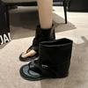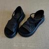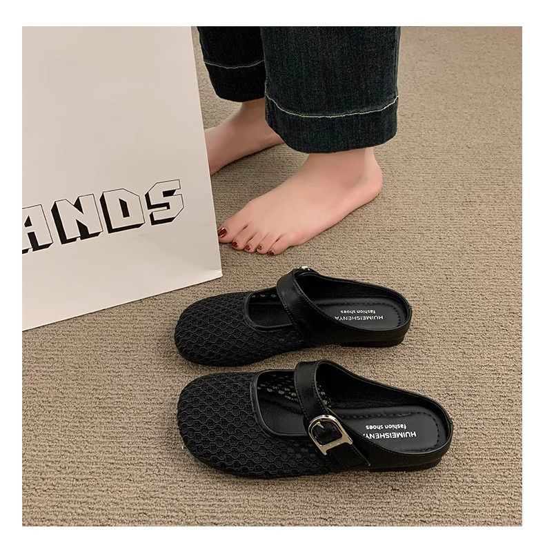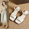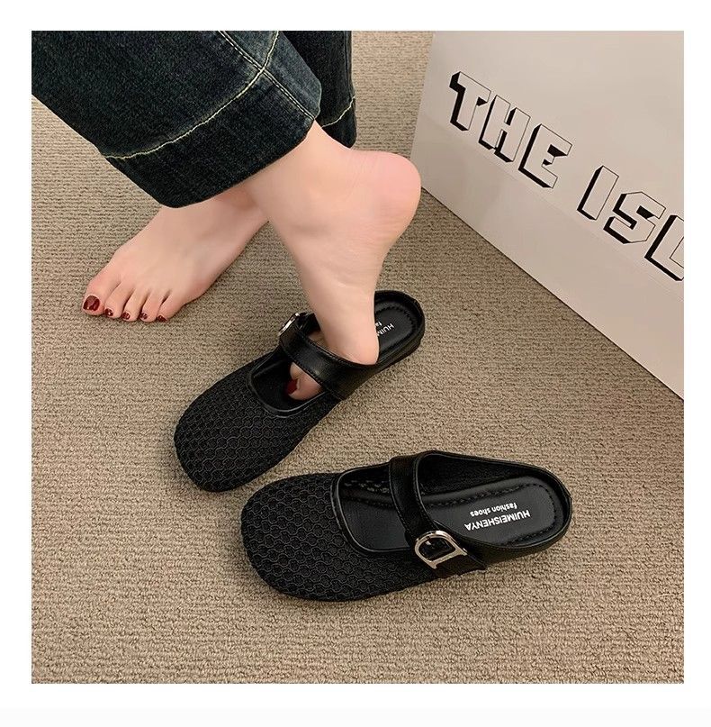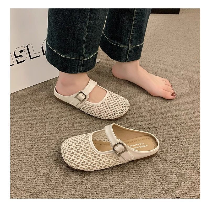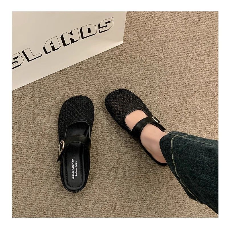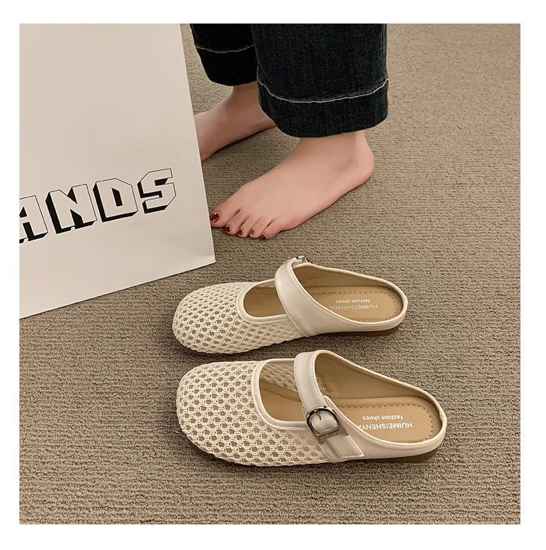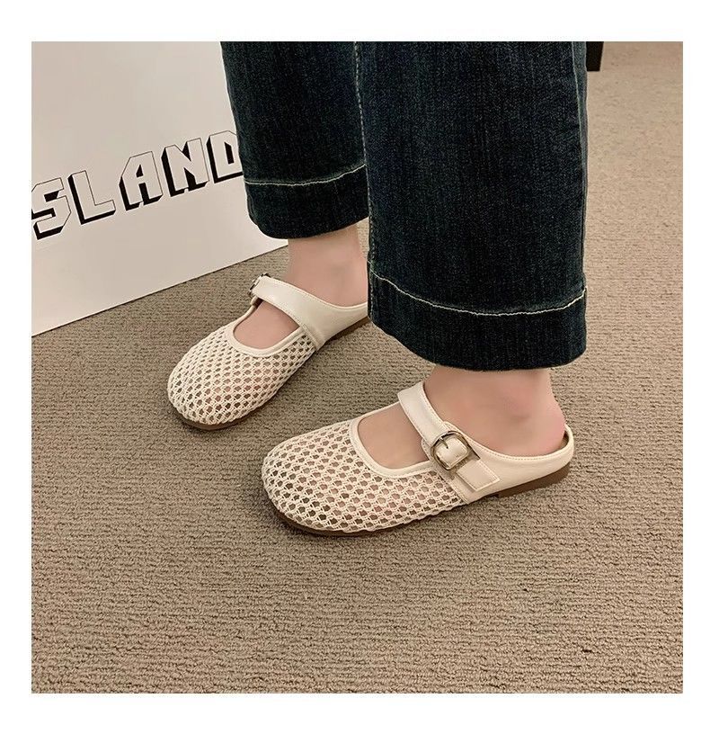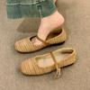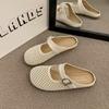Sandálias Romanas de Tira com Fivela Tecida Vazada Francesa 2025 Novo Bico Redondo Flat Mary Jane Sapatos com Furos