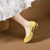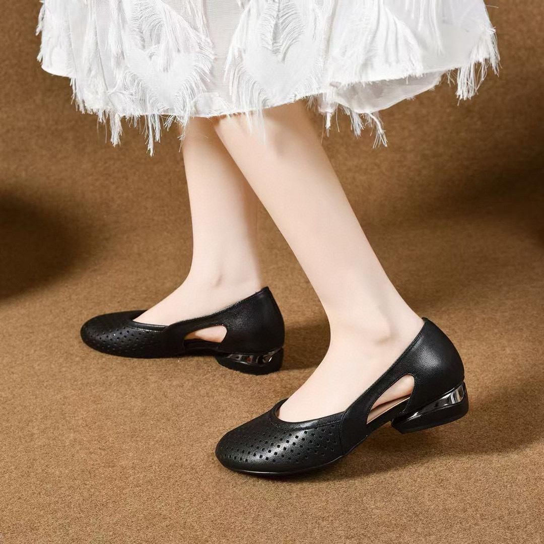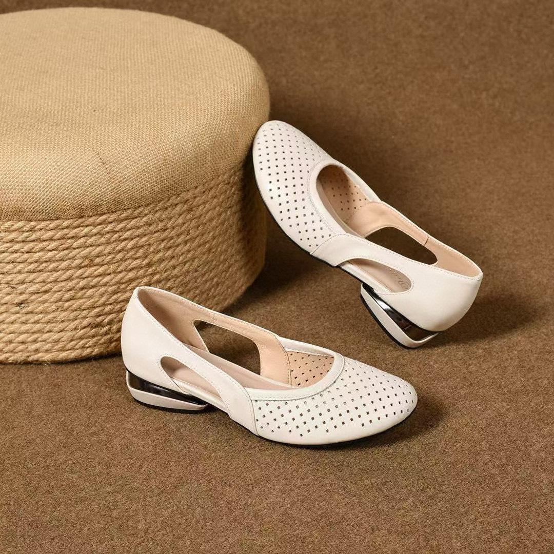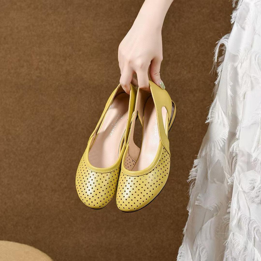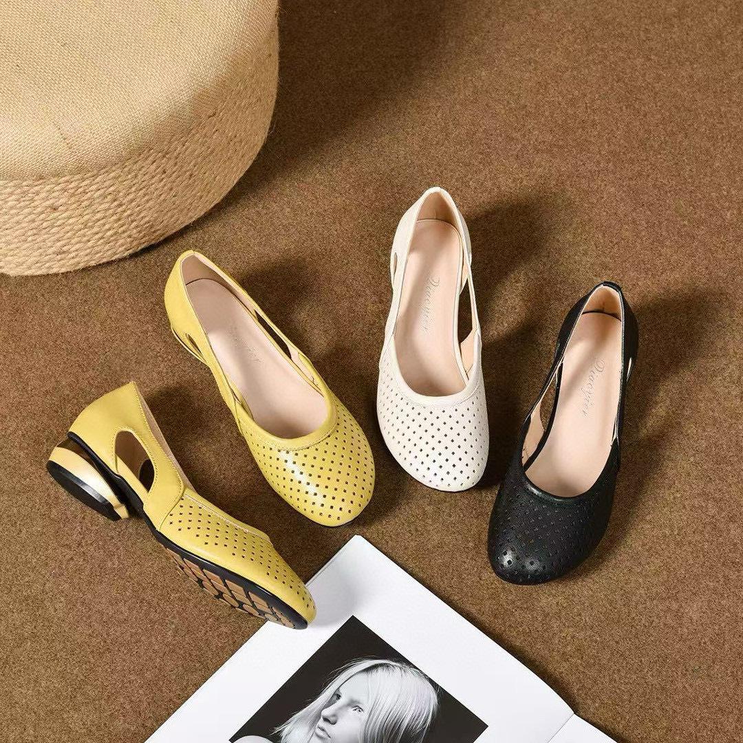 2025 Novos Sapatos Pequenos Solteiros de Bico Redondo Vazado Material: Couro Cor: Preto Amarelo Mostarda. Branco Sujo Tamanho: 34-41 Altura do salto: 2,5 cm
