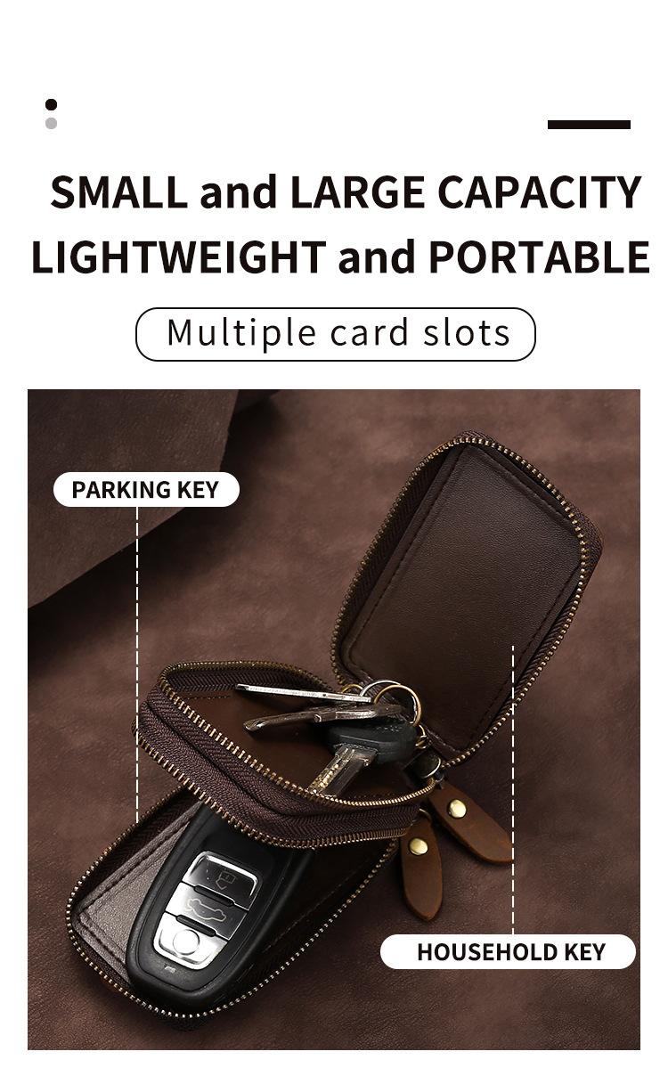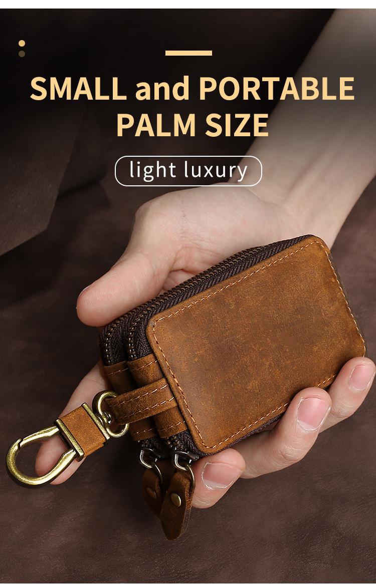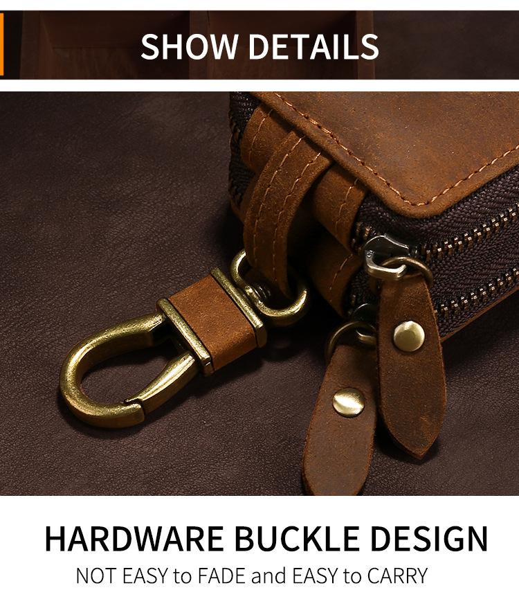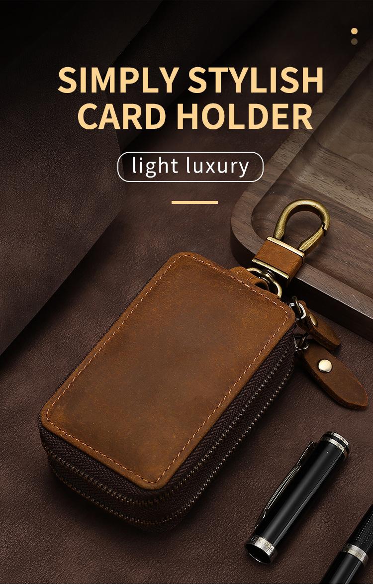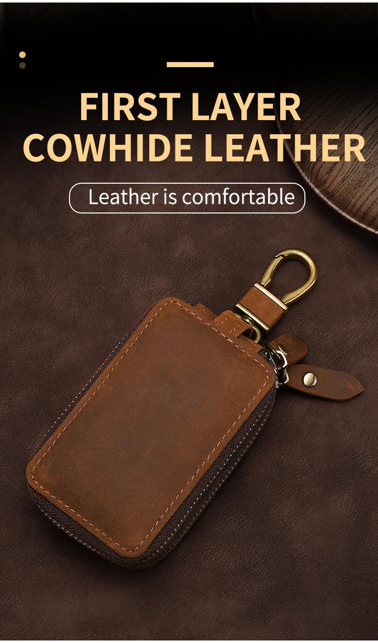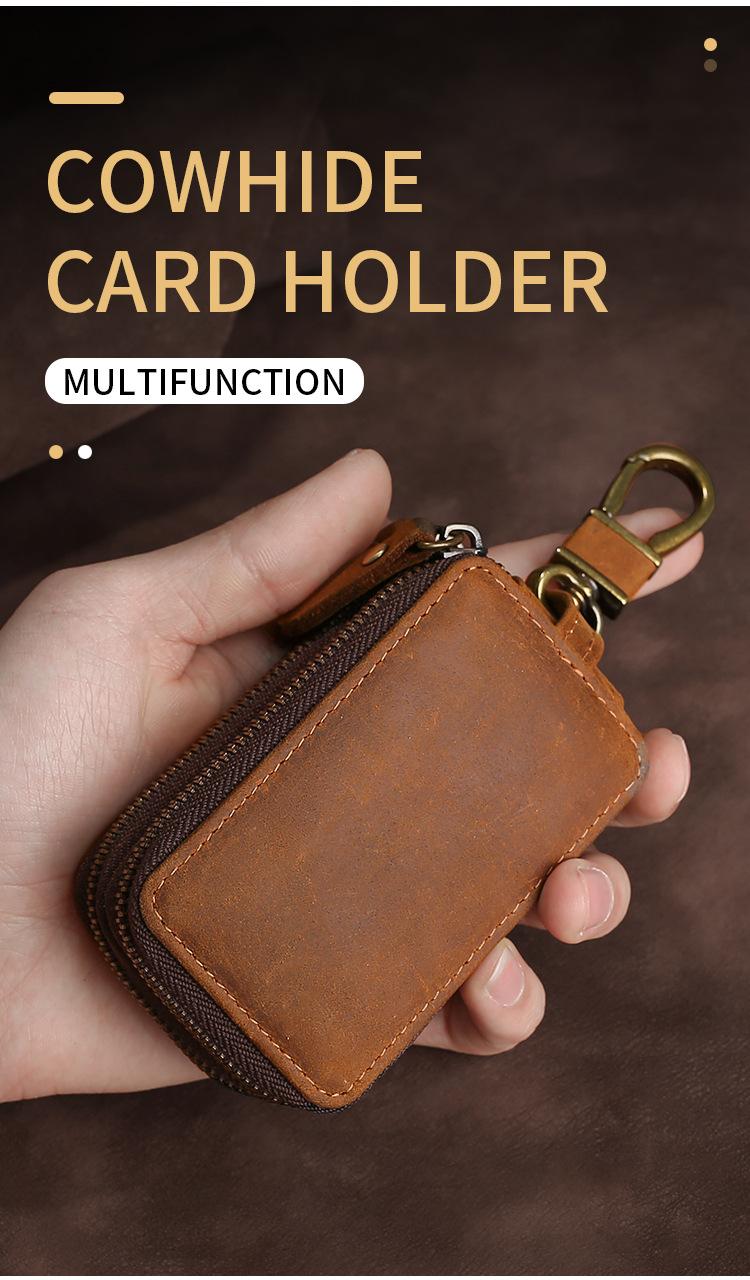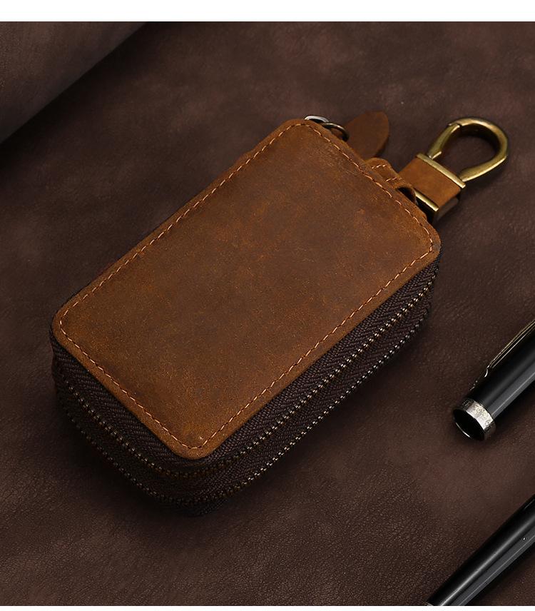 Bolsa de Chave de Carro de Couro Crazy Horse Retrô Personalizada Transfronteiriça Couro Genuíno de Camada Superior de Vaca Masculina Bolsa de Chave de Carro com Zíper Duplo