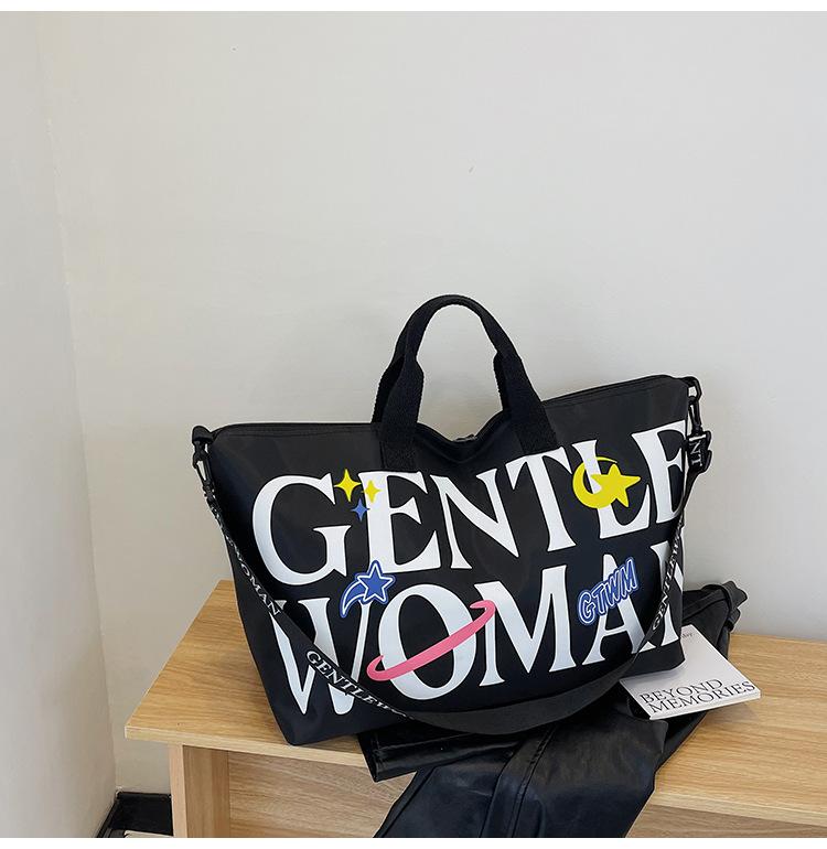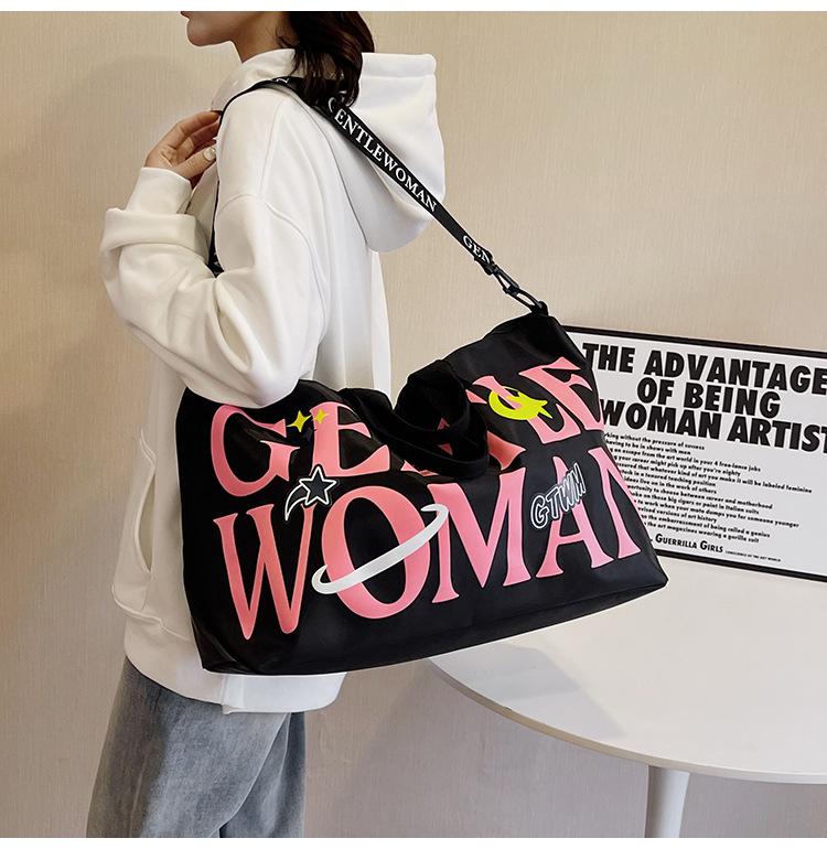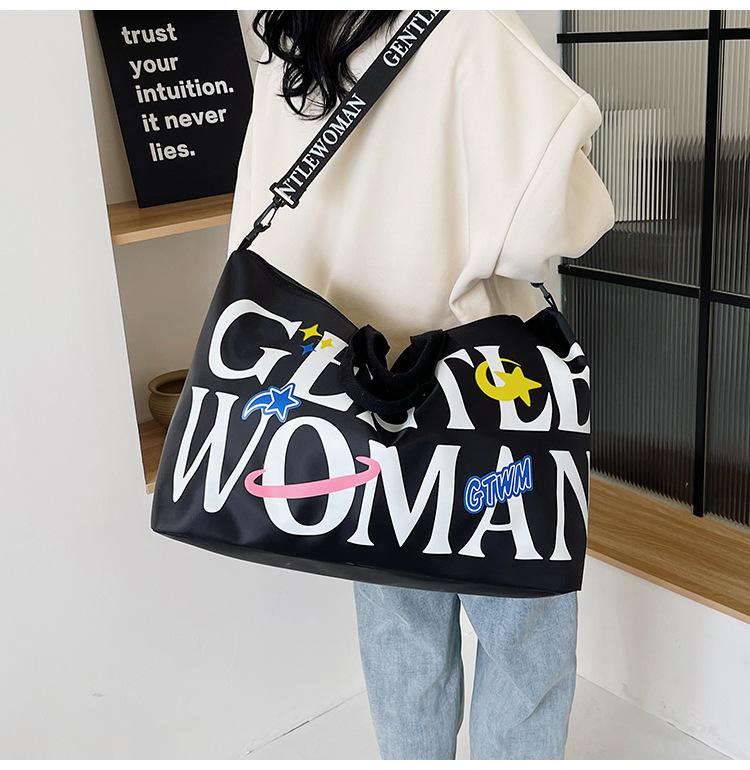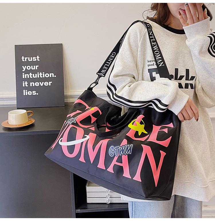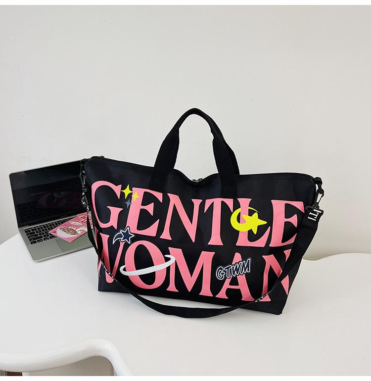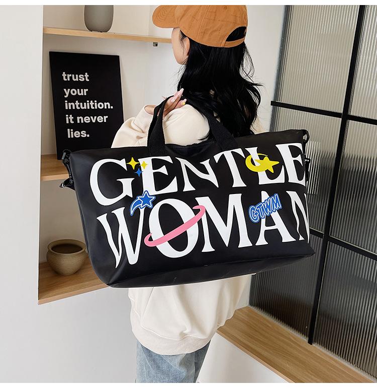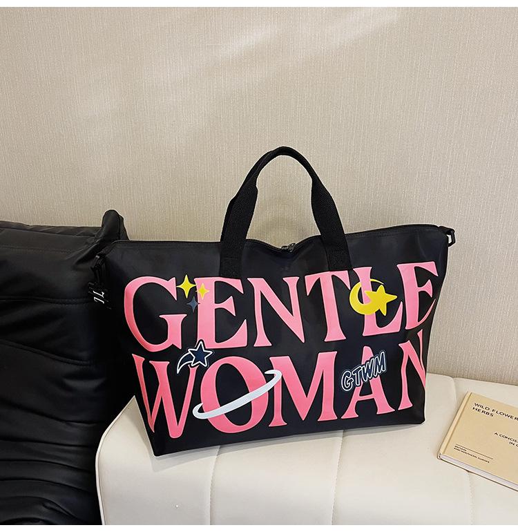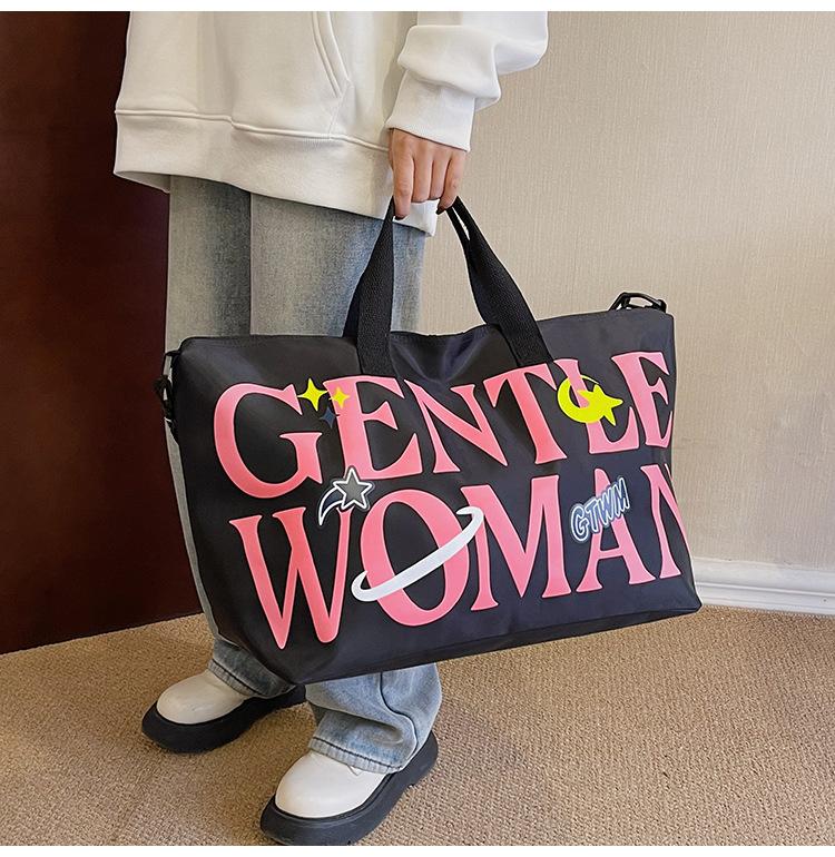 Bolsa de viagem fitness de grande capacidade para mulher gentil, nova bolsa de ombro impermeável com letras de tecido de nylon 2024