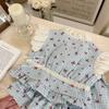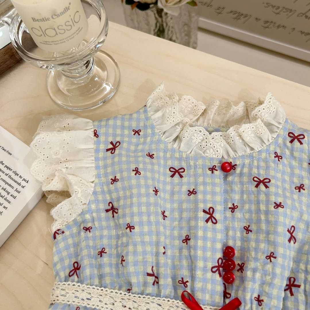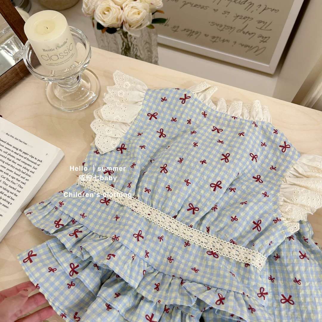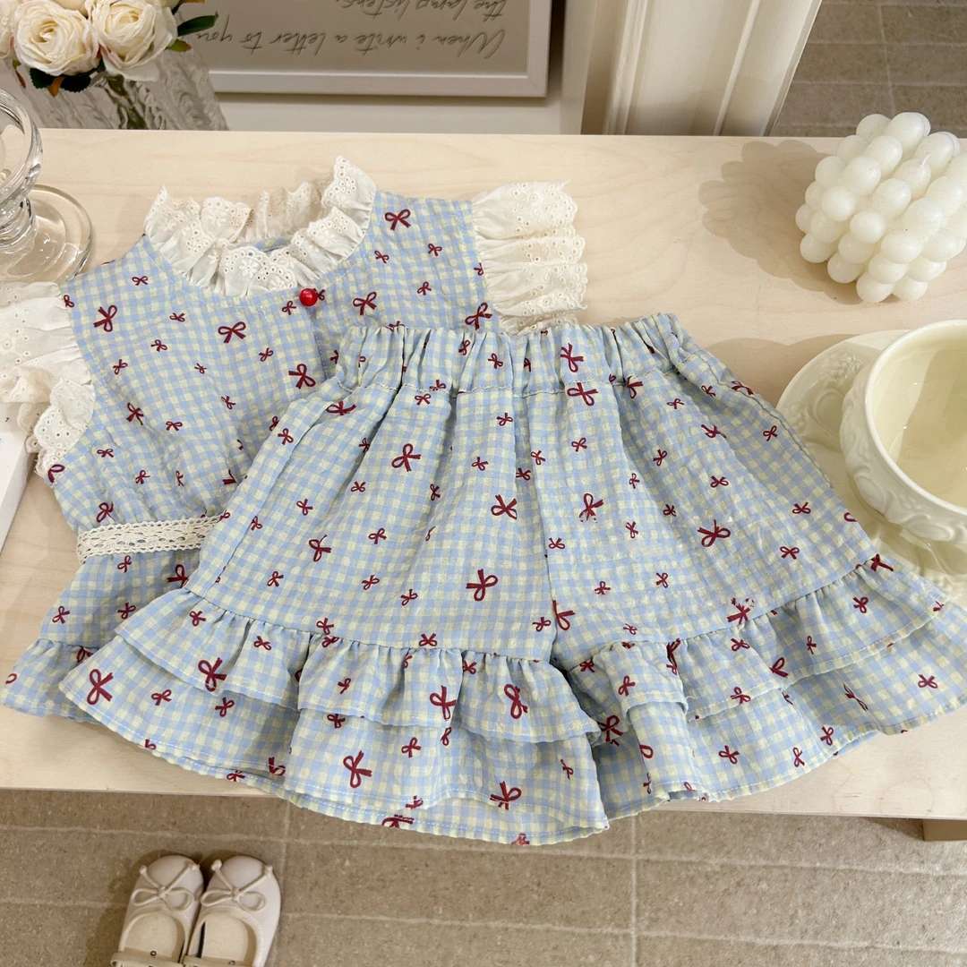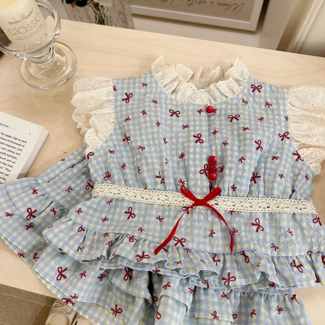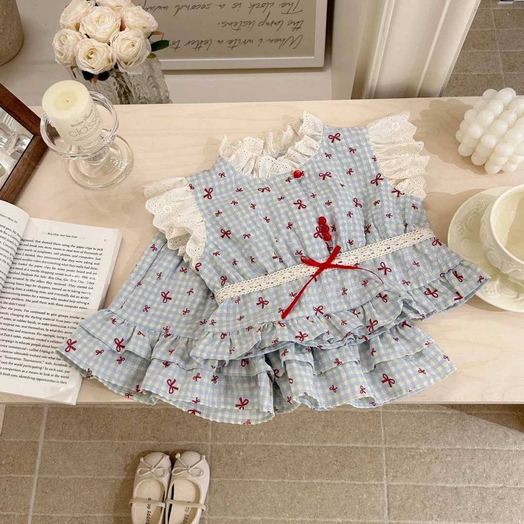 [Novos Produtos de Verão] Roupa de Verão para Meninas Xadrez Infantil Novo Conjunto de Duas Peças Doce Bebê Laço Roupas Infantis