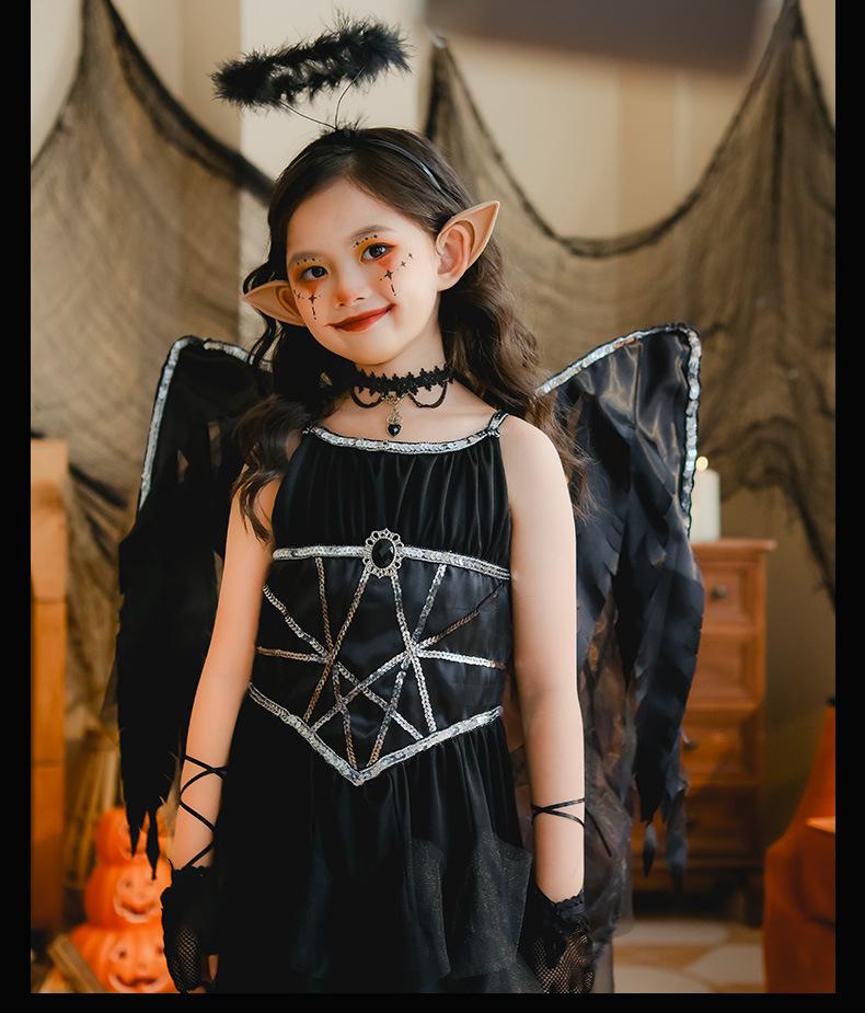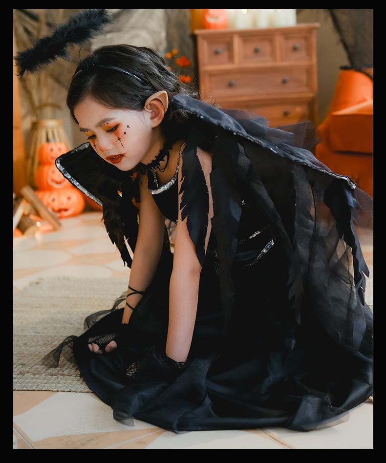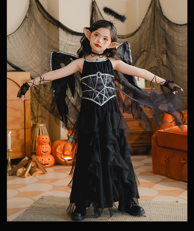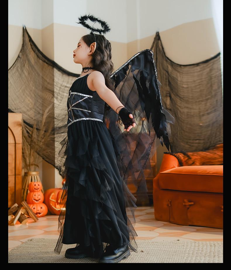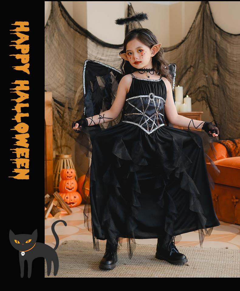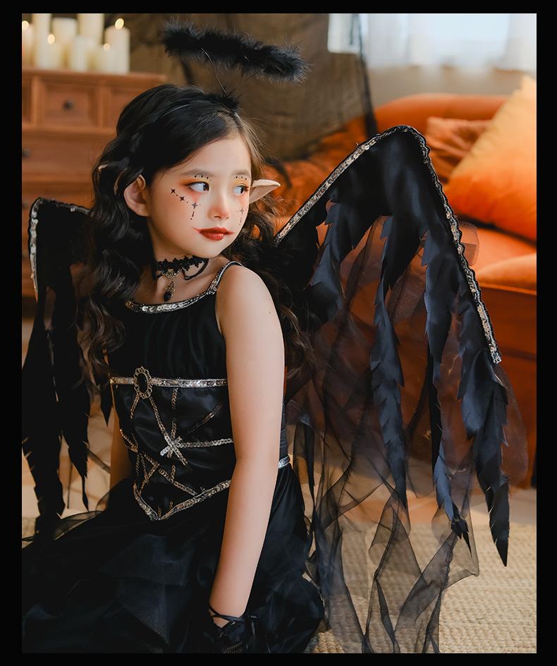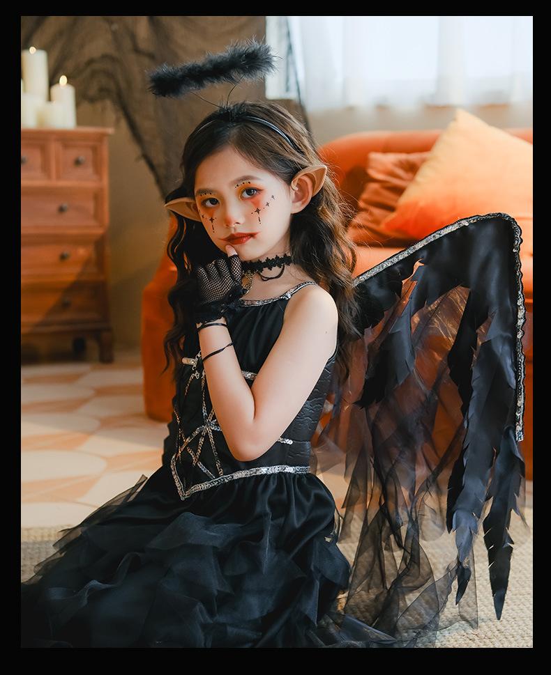Fantasia de Desempenho de Halloween para Meninas Fantasia de Feitiço Demônio Asas de Anjo Vestido Elfo Negro Fantasia Infantil