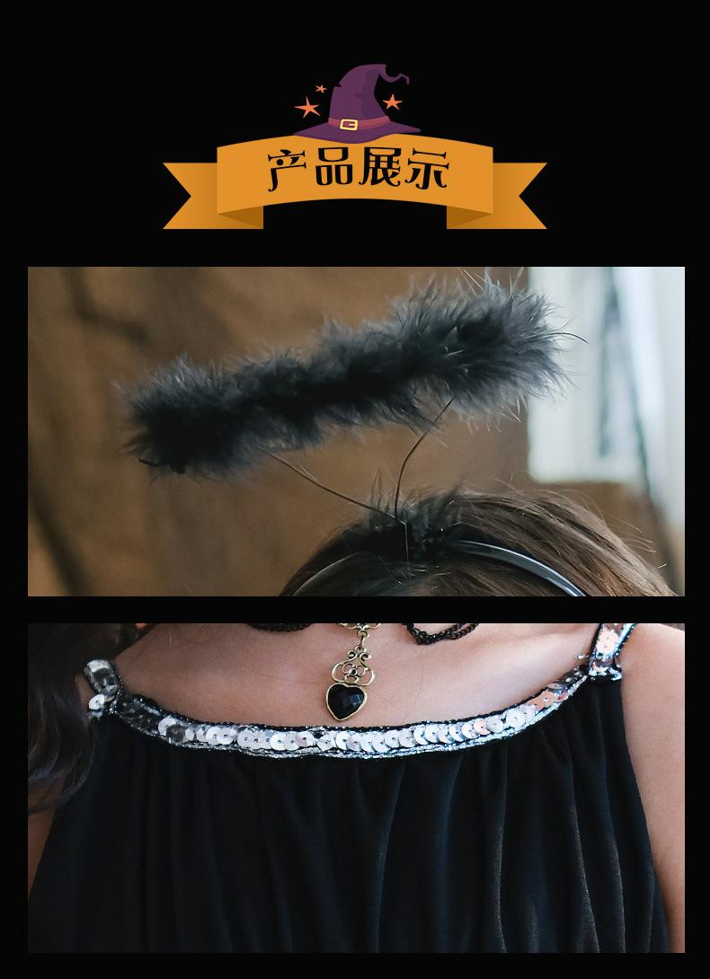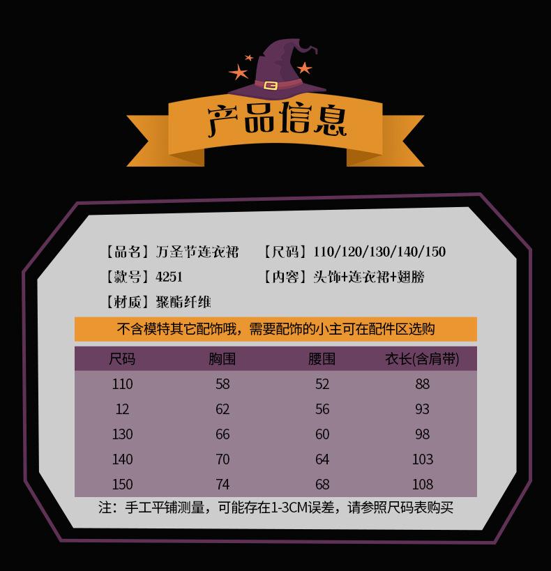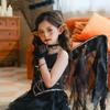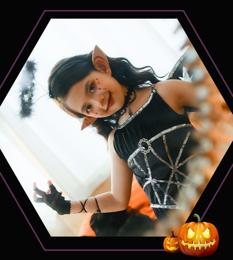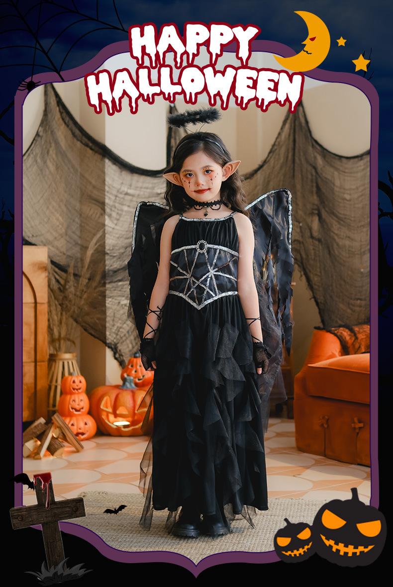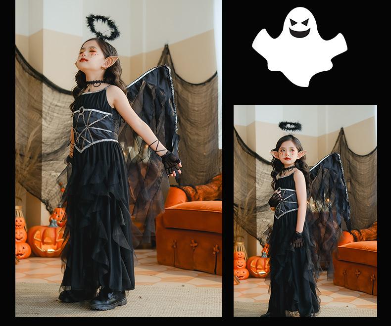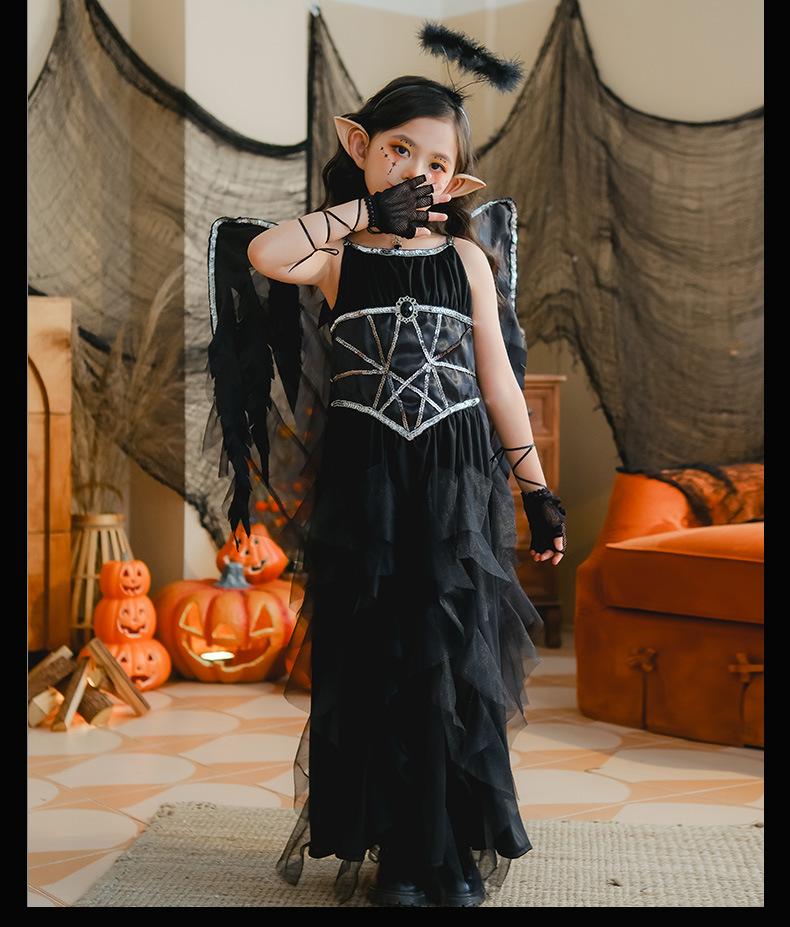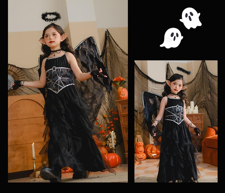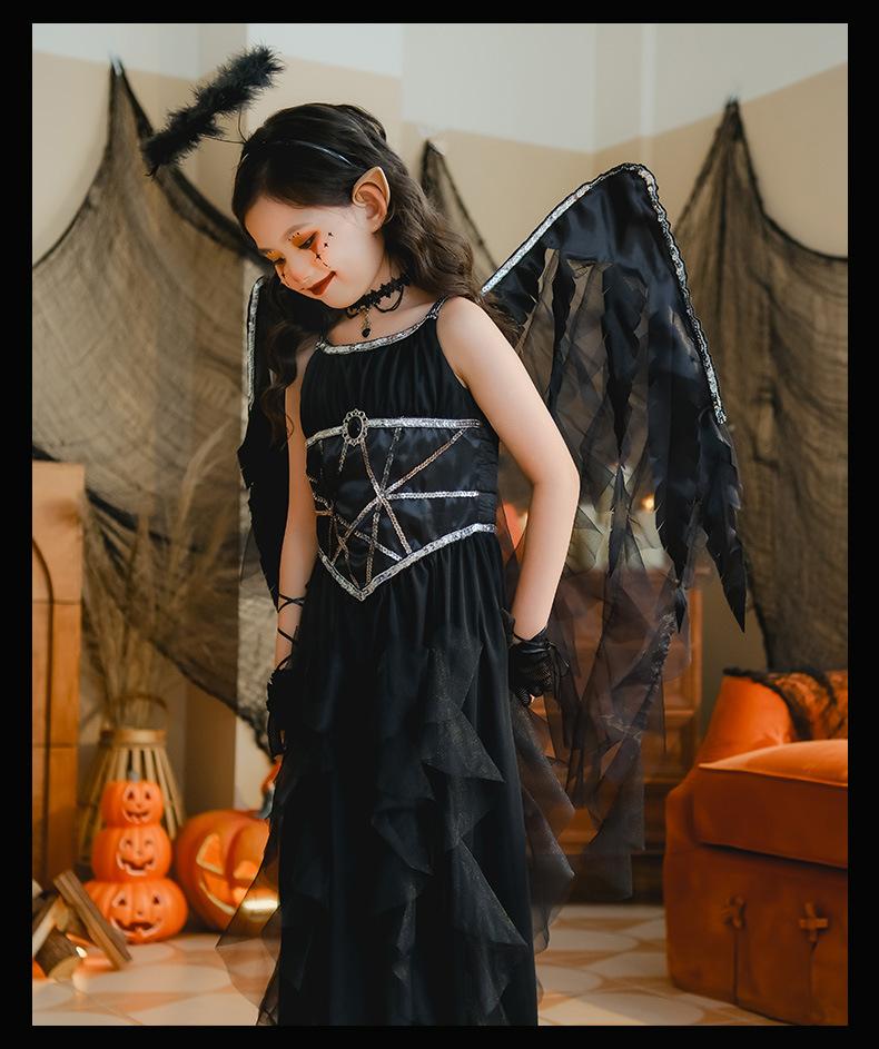 Fantasia de Desempenho de Halloween para Meninas Fantasia de Feitiço Demônio Asas de Anjo Vestido Elfo Negro Fantasia Infantil