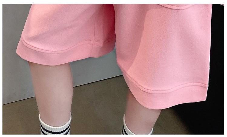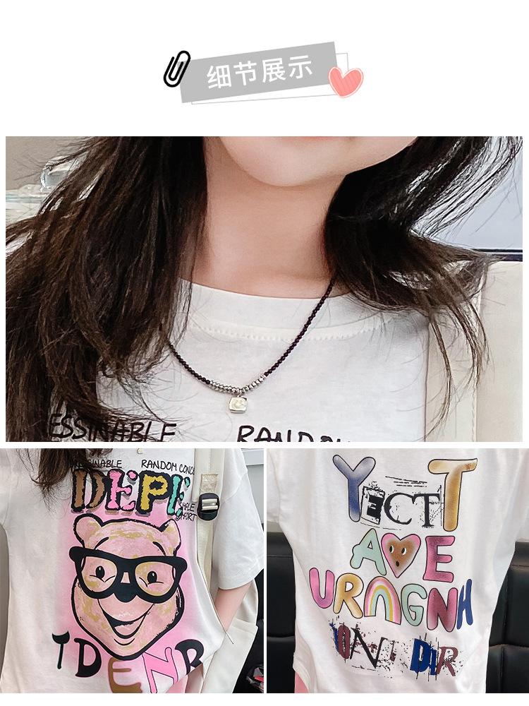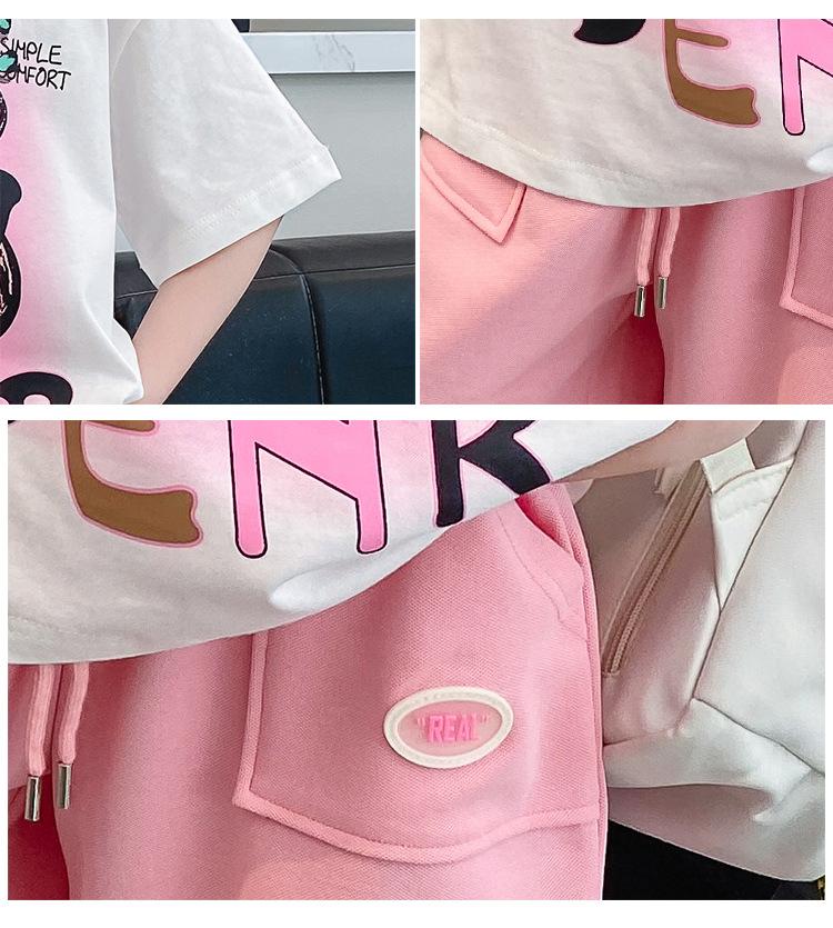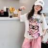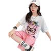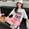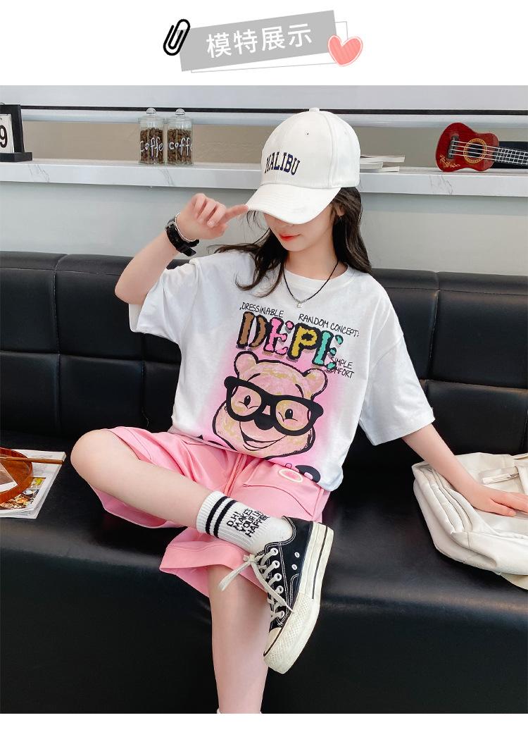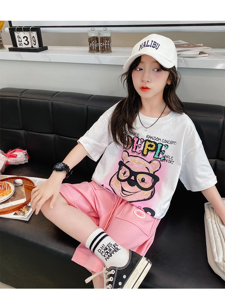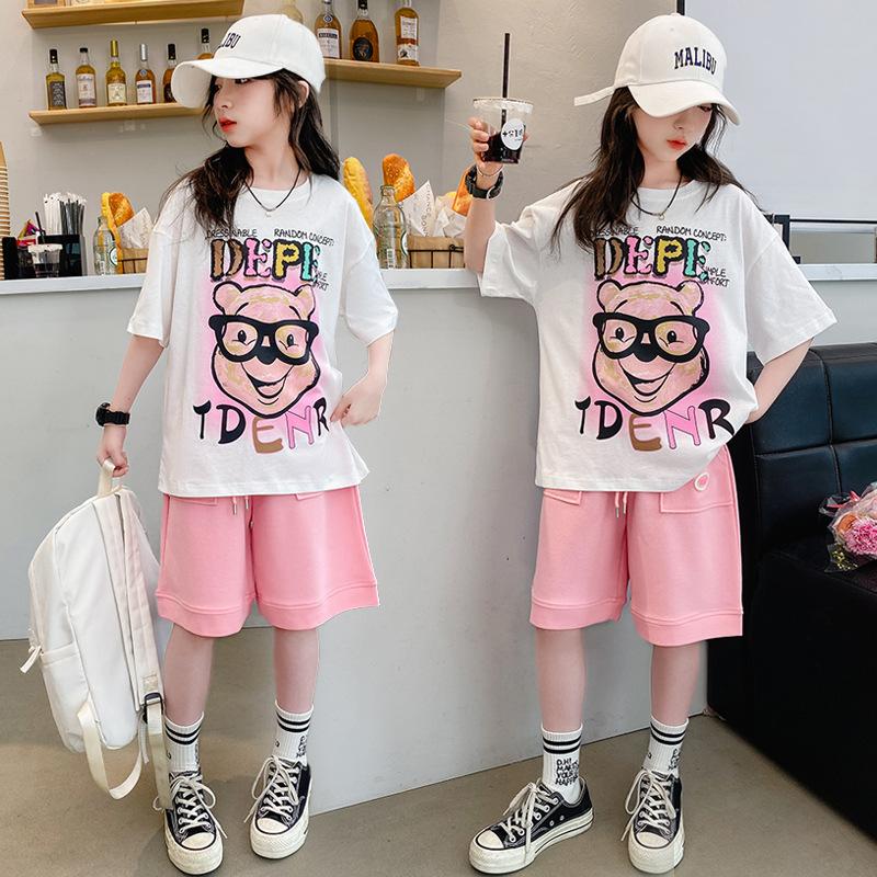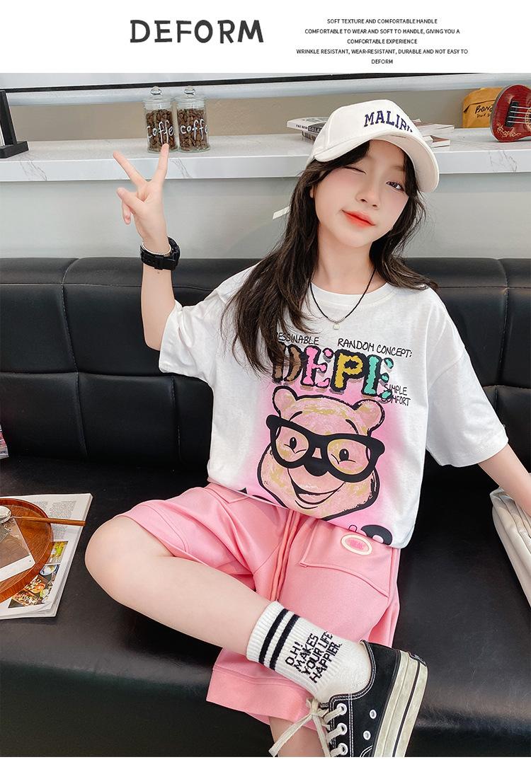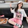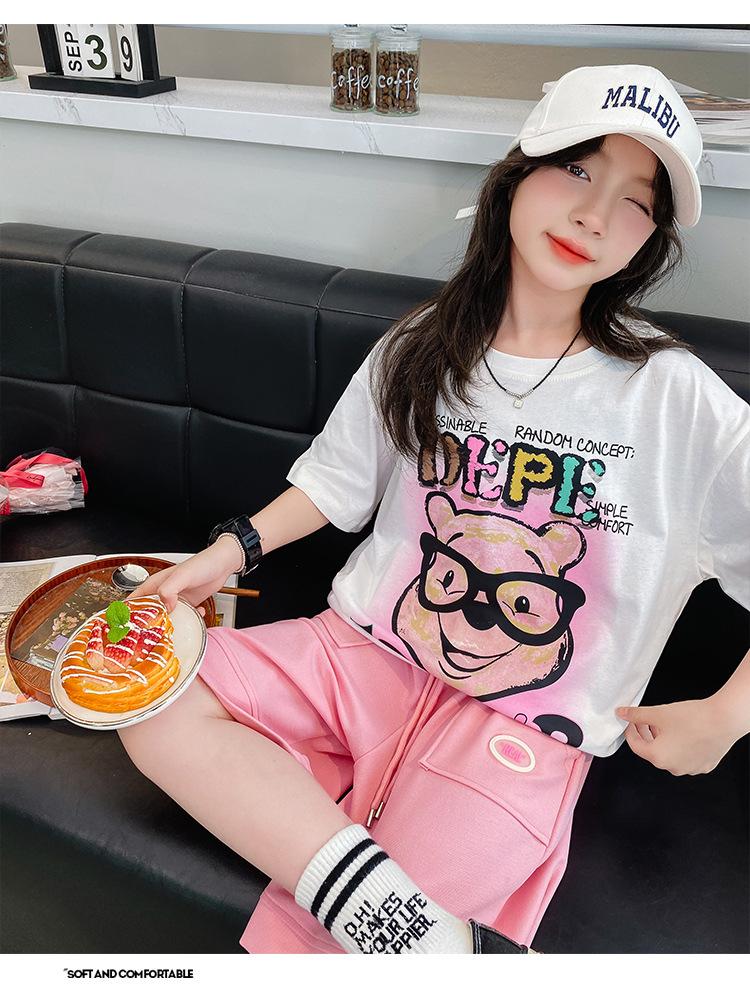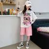 Conjunto esportivo estilo coreano para meninas, conjunto de duas peças com shorts estilosos de manga curta e desenho animado para crianças grandes, verão