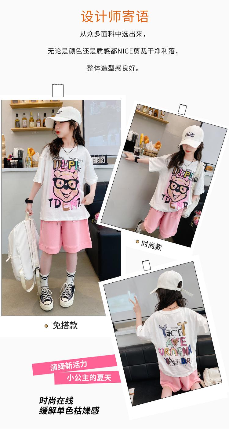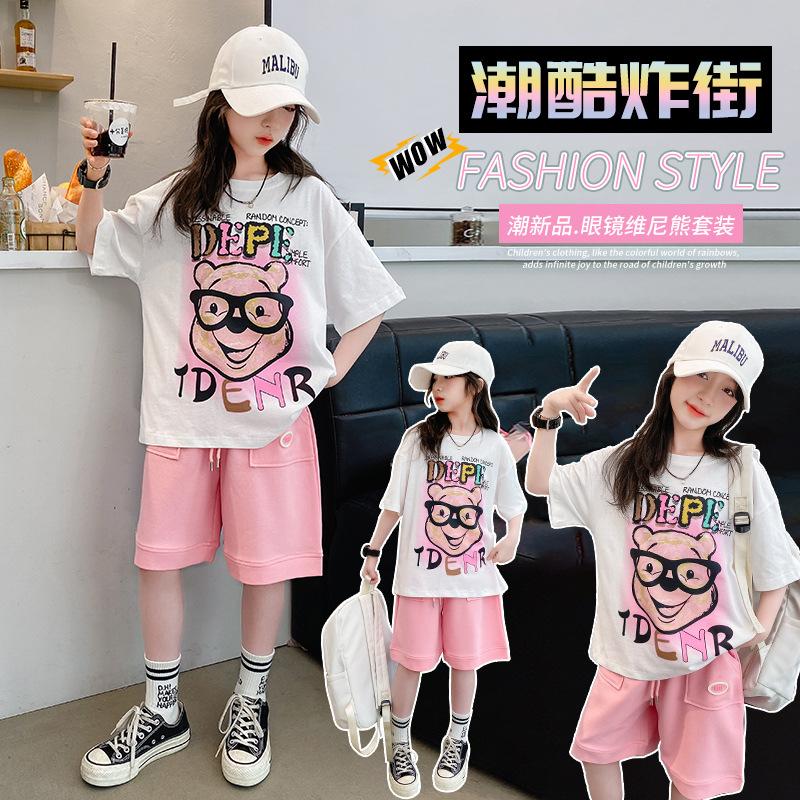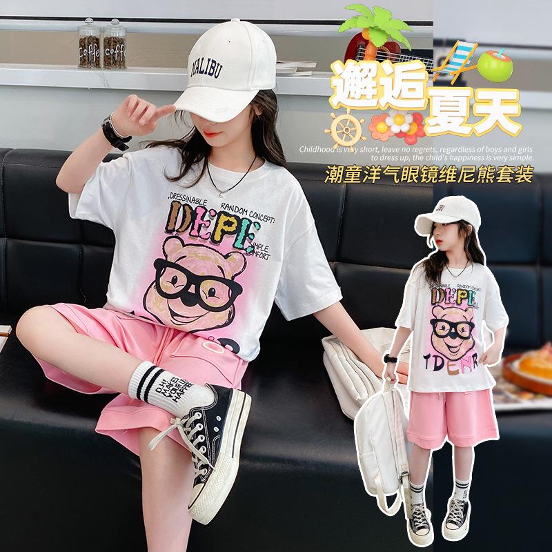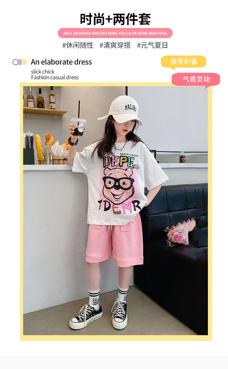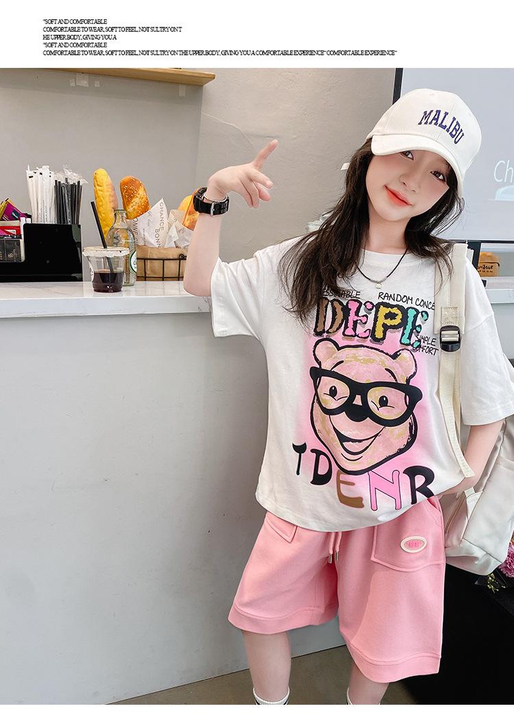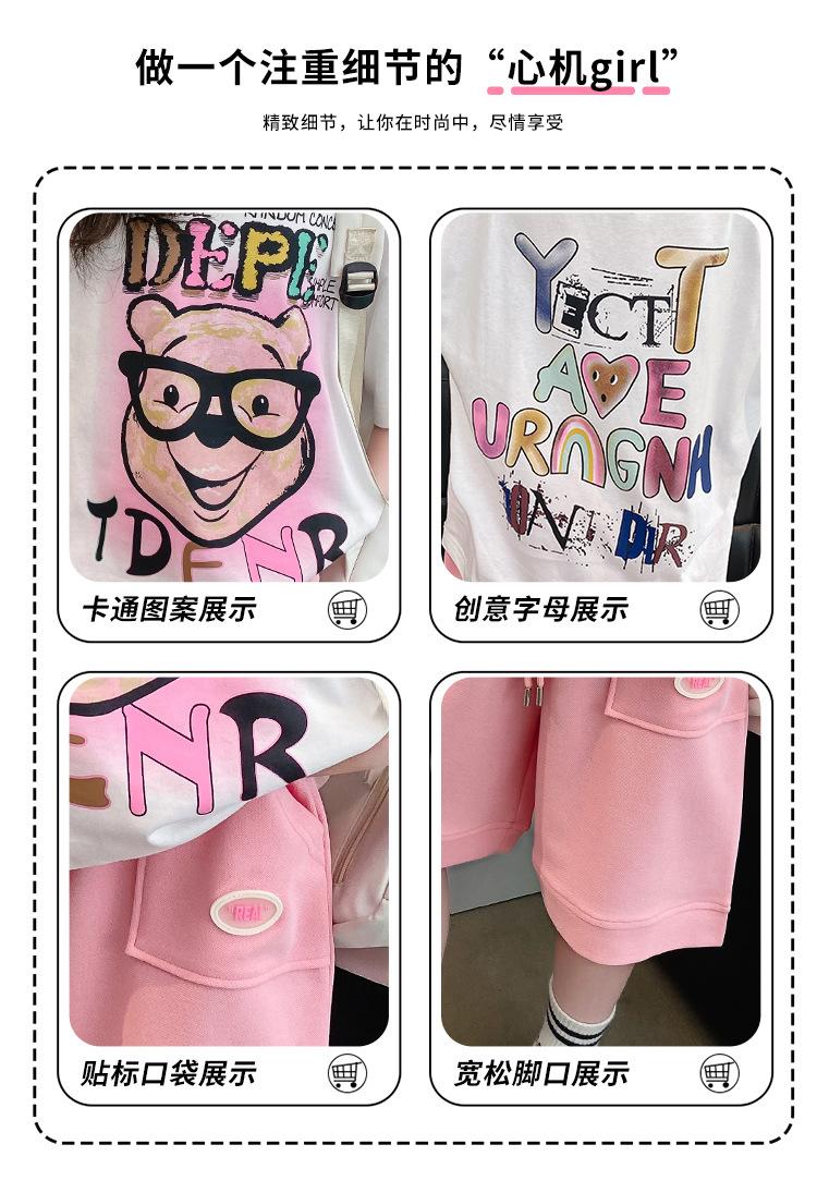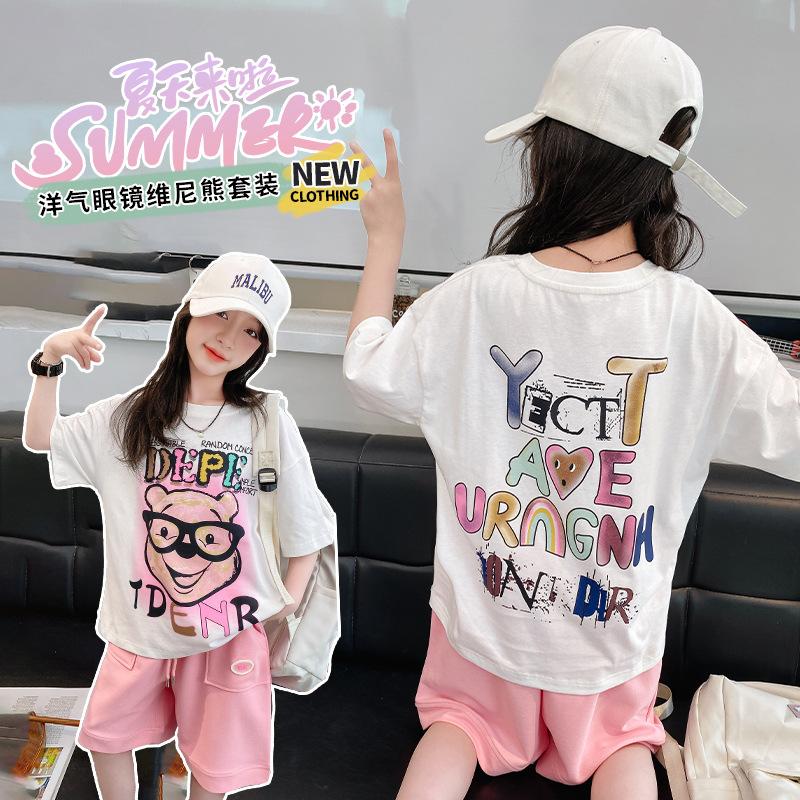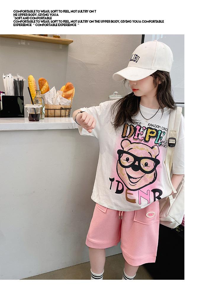 Compre Conjunto esportivo estilo coreano para meninas, conjunto de duas peças com shorts estilosos de manga curta e desenho animado para crianças grandes, verão no atacado no Joom.pro