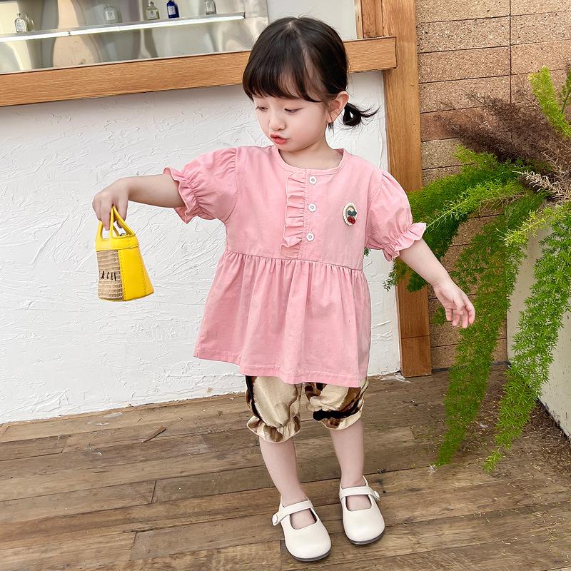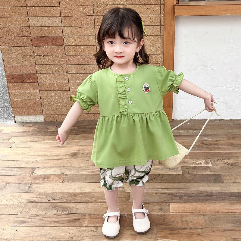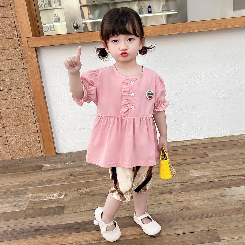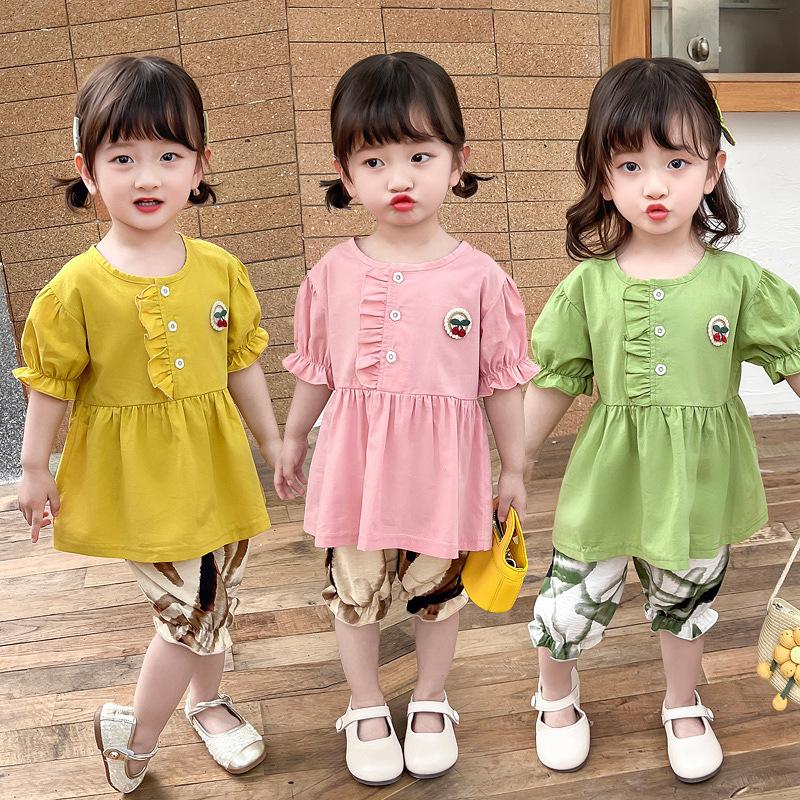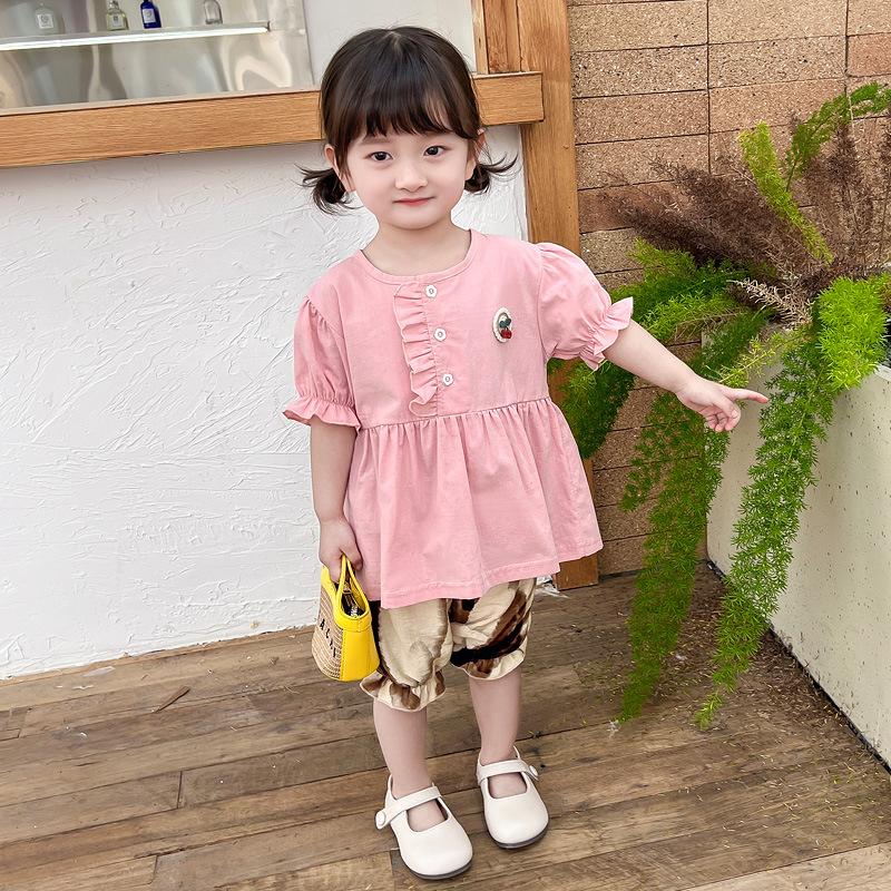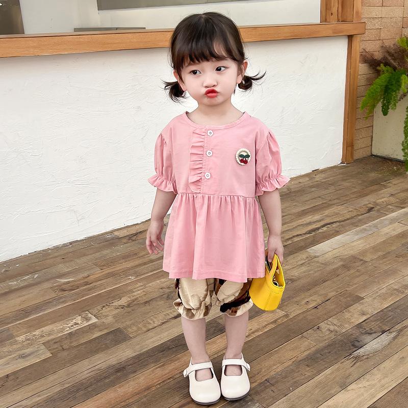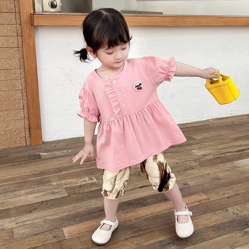 Terno infantil verão fino meninas bebê ocidental renda cereja manga curta shorts conjunto de duas peças de uma geração de cabelo
