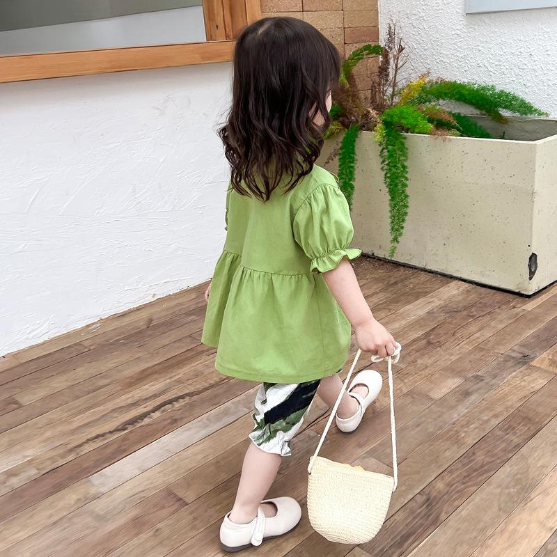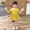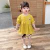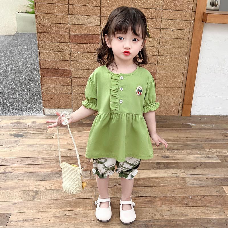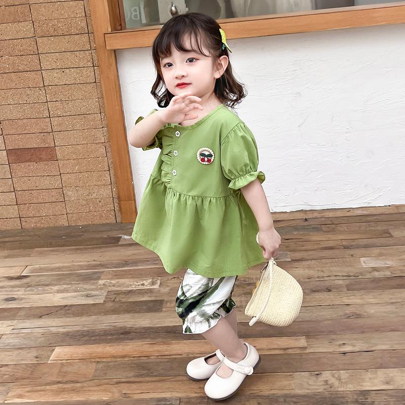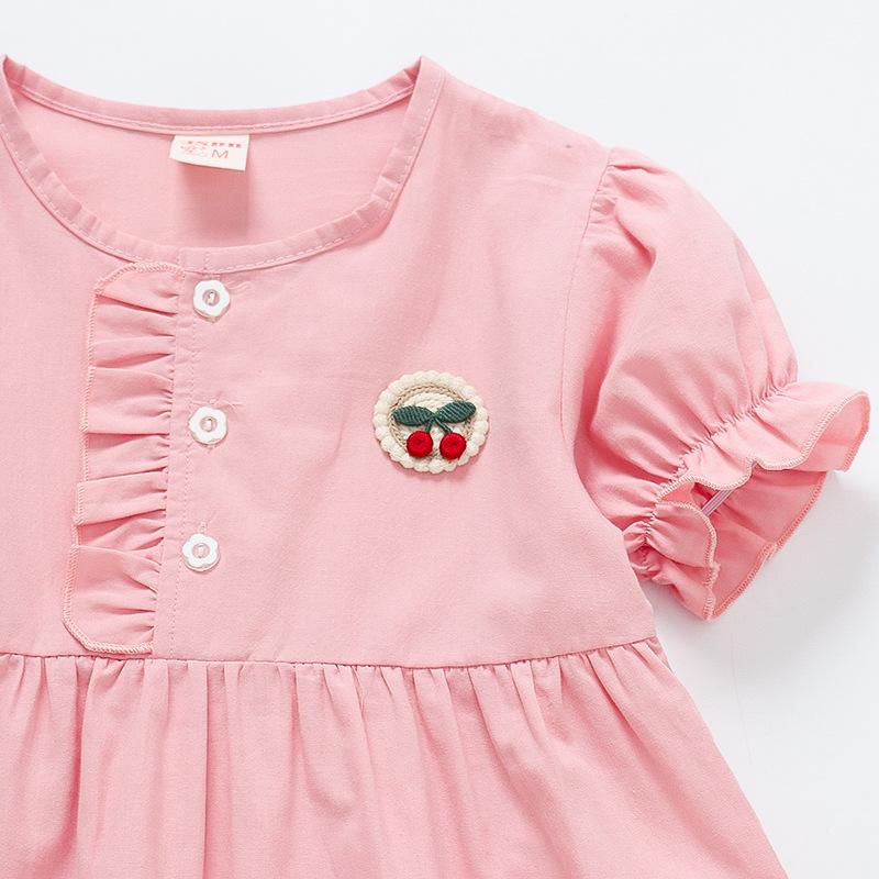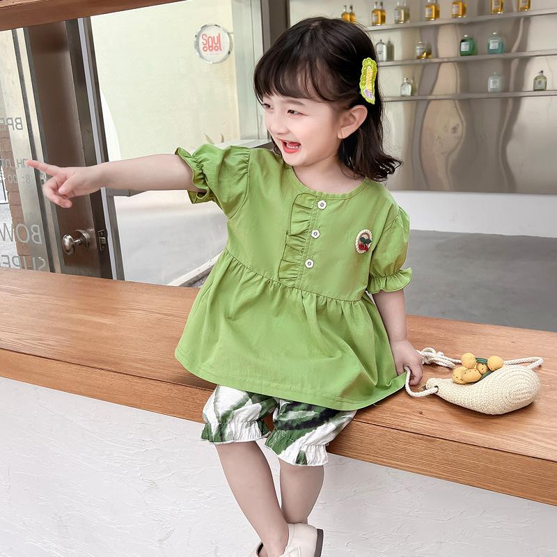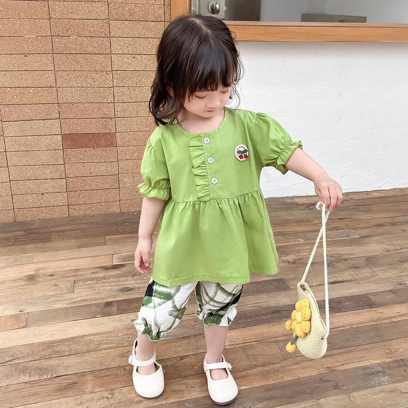 Terno infantil verão fino meninas bebê ocidental renda cereja manga curta shorts conjunto de duas peças de uma geração de cabelo