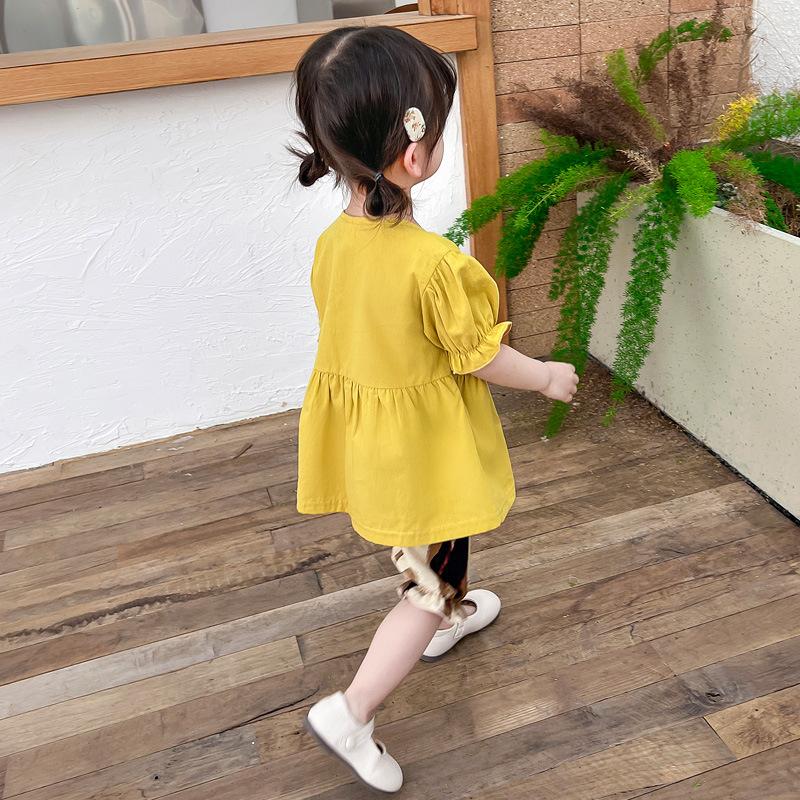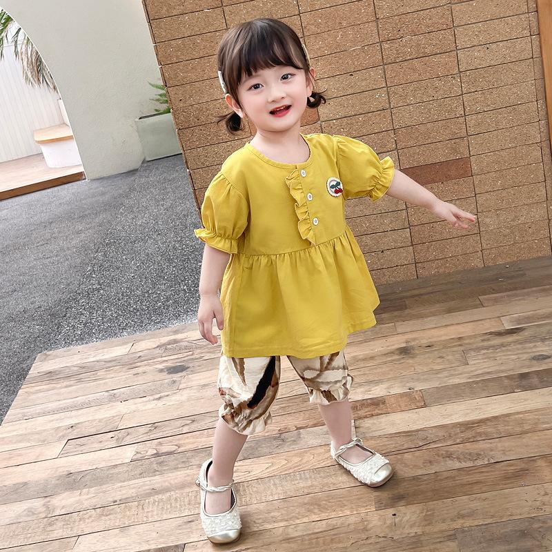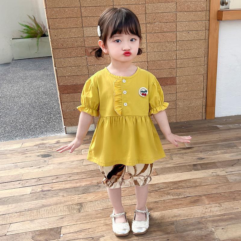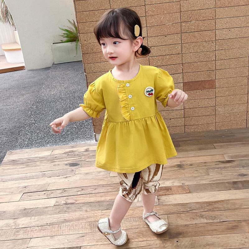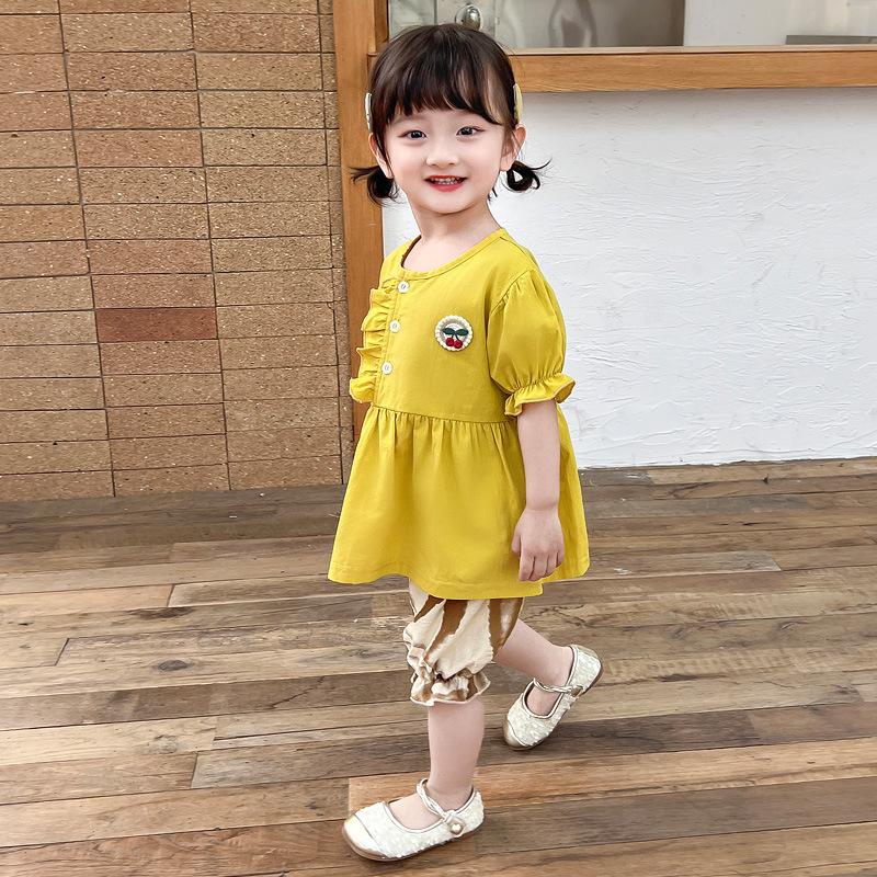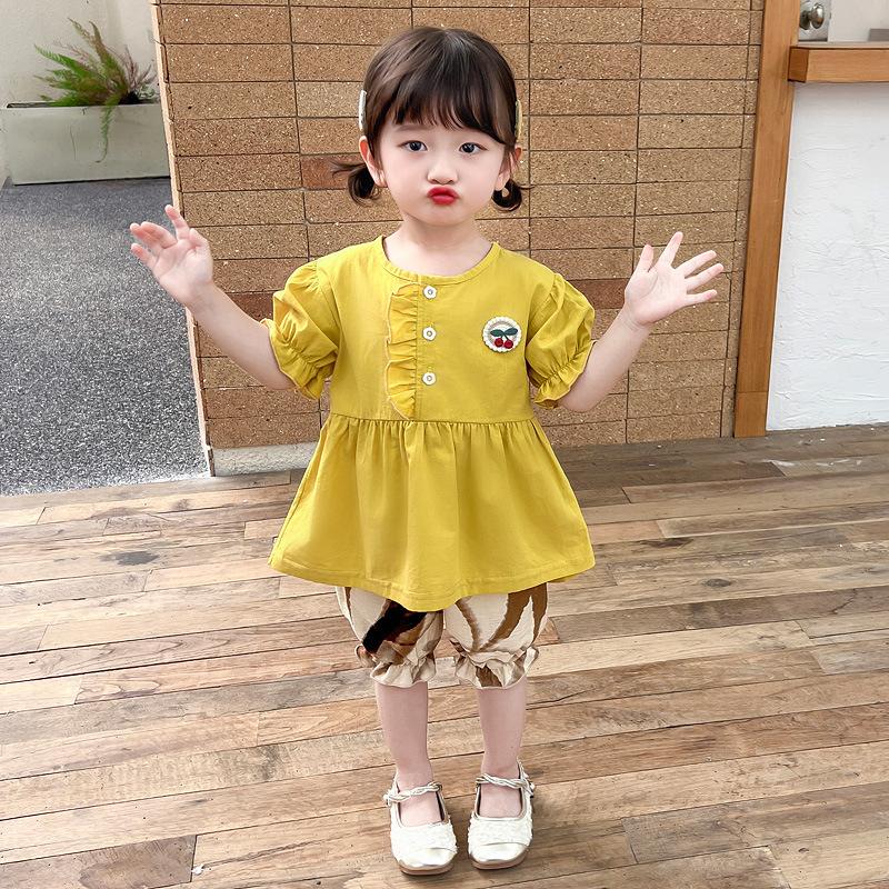 Short sleeve placket lace cherry suit yellow