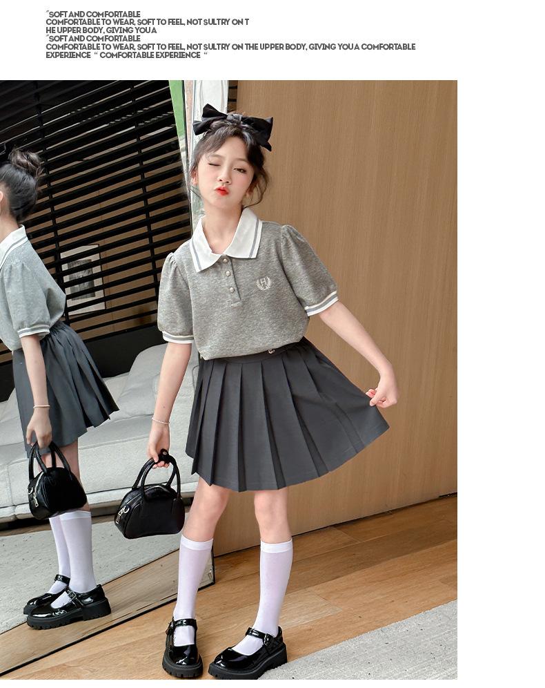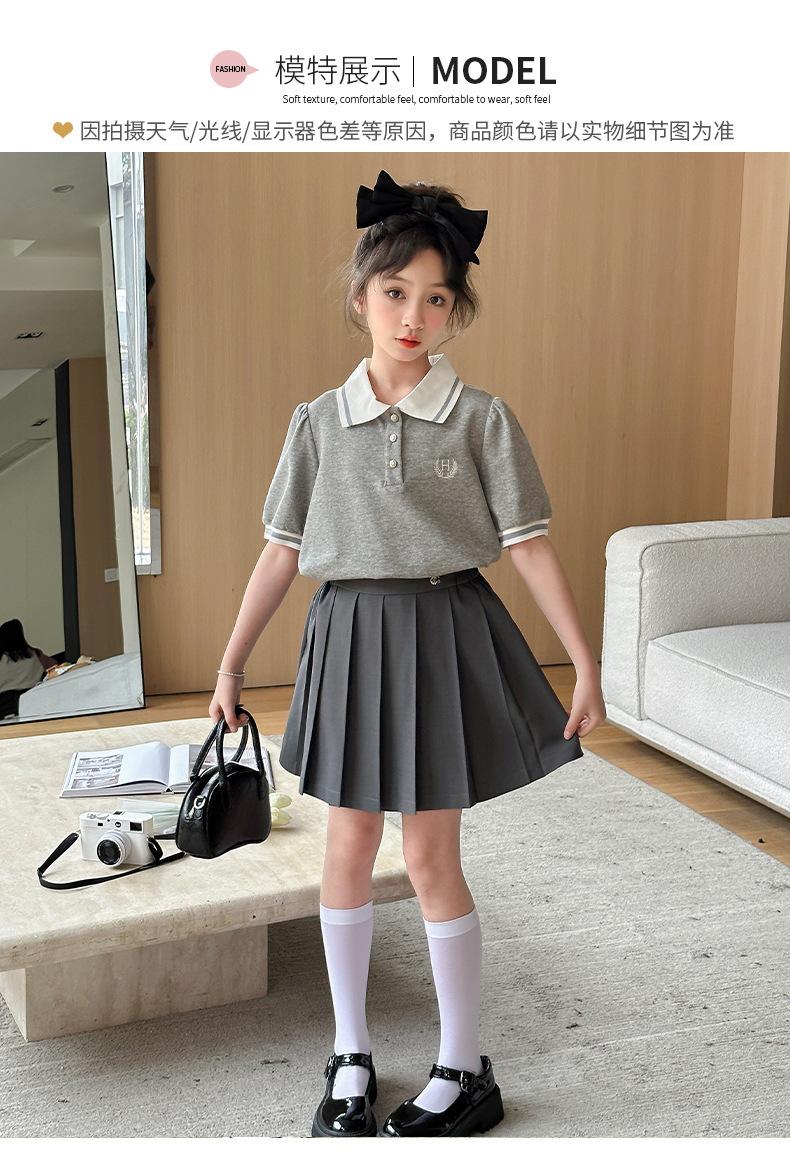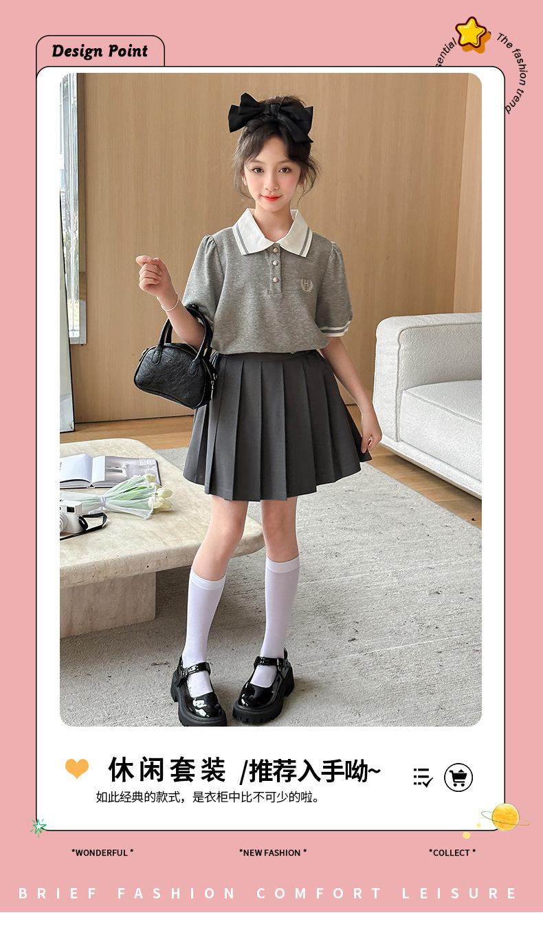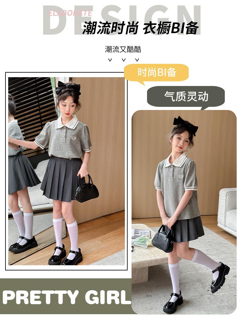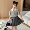 Conjunto Infantil de Verão para Meninas com Gola Grande, Manga Curta e Saia Plissada em Duas Peças, Estilo Ocidental Infantil 2024 Novo Verão Novo Infantil na Moda