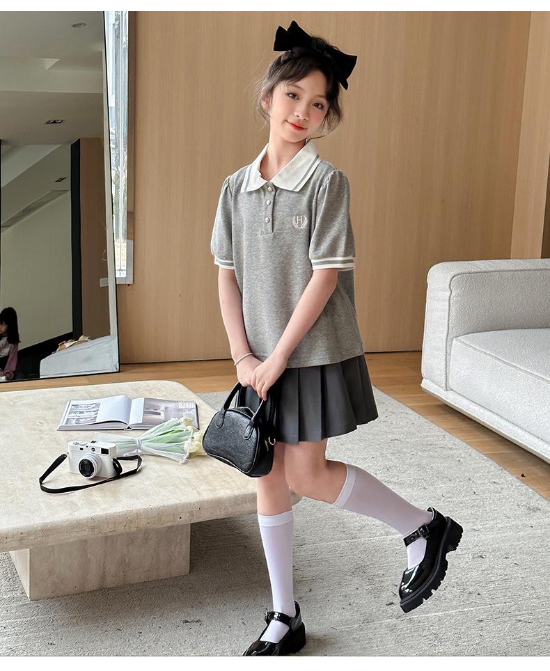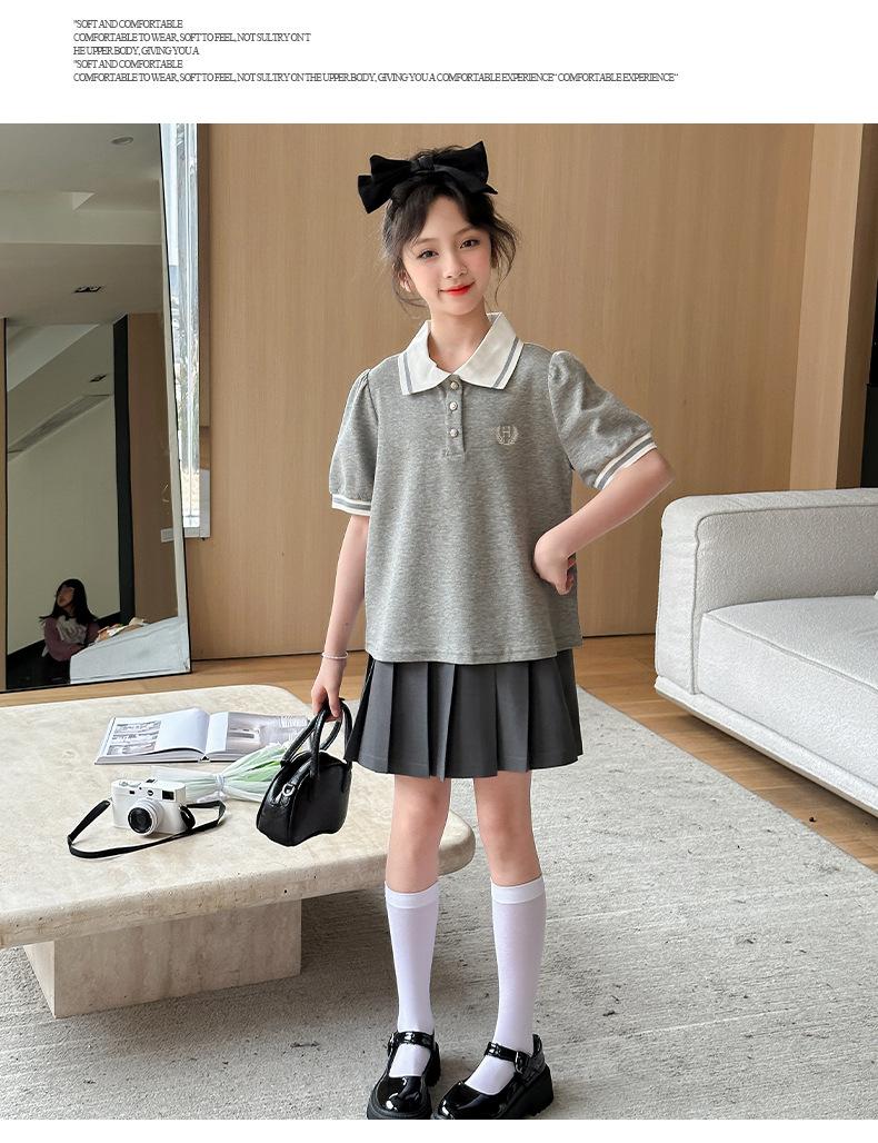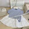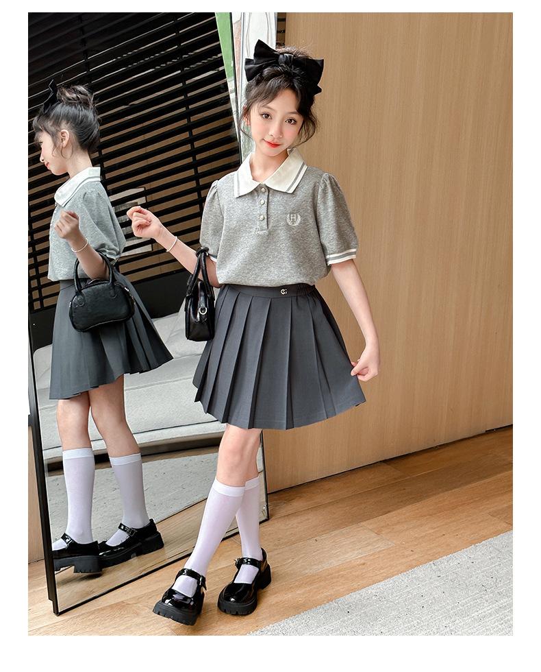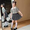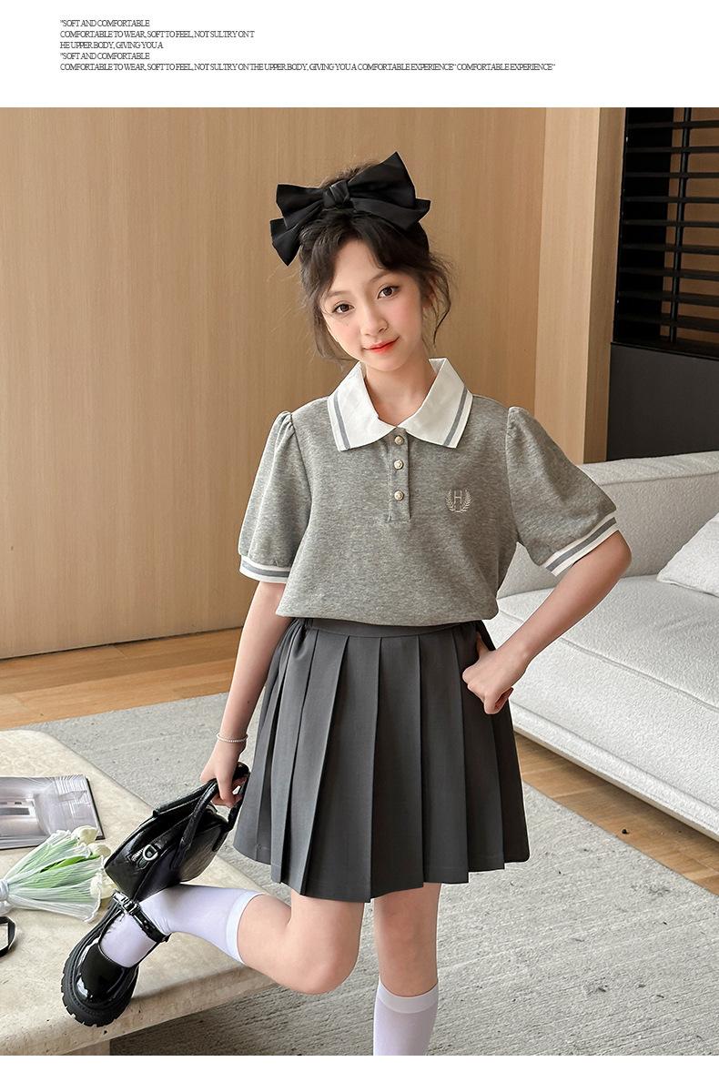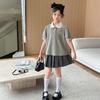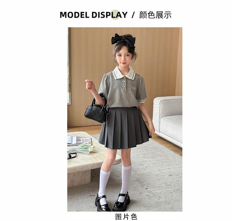 Conjunto Infantil de Verão para Meninas com Gola Grande, Manga Curta e Saia Plissada em Duas Peças, Estilo Ocidental Infantil 2024 Novo Verão Novo Infantil na Moda