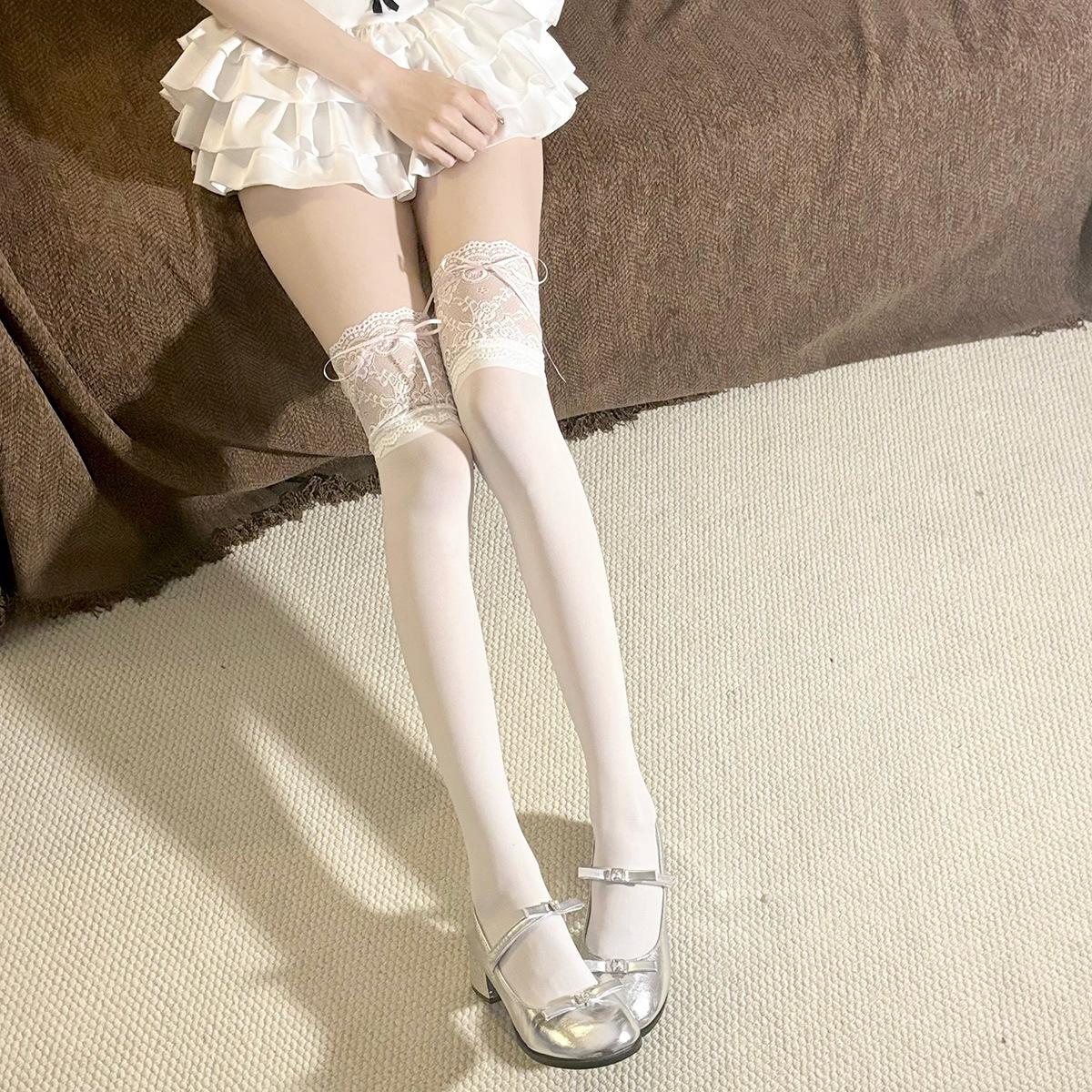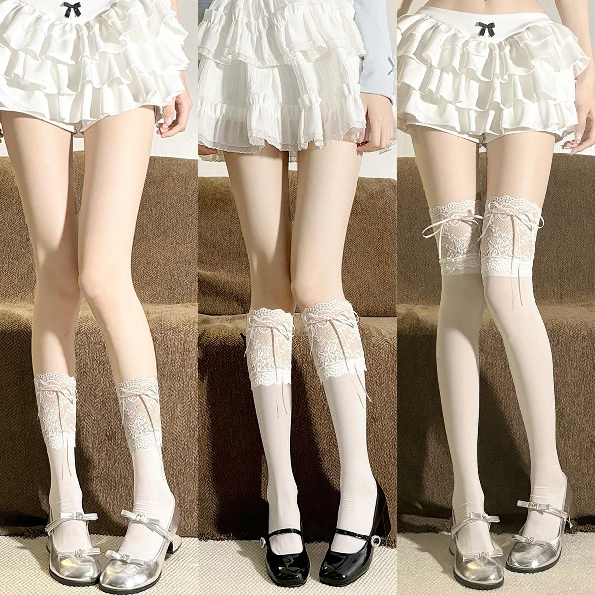 Meias de Renda Lolita de Primavera e Verão até a Panturrilha para Mulheres Jk Laço Renda Meias Acima do Joelho Lolita Meias Doces de Veludo